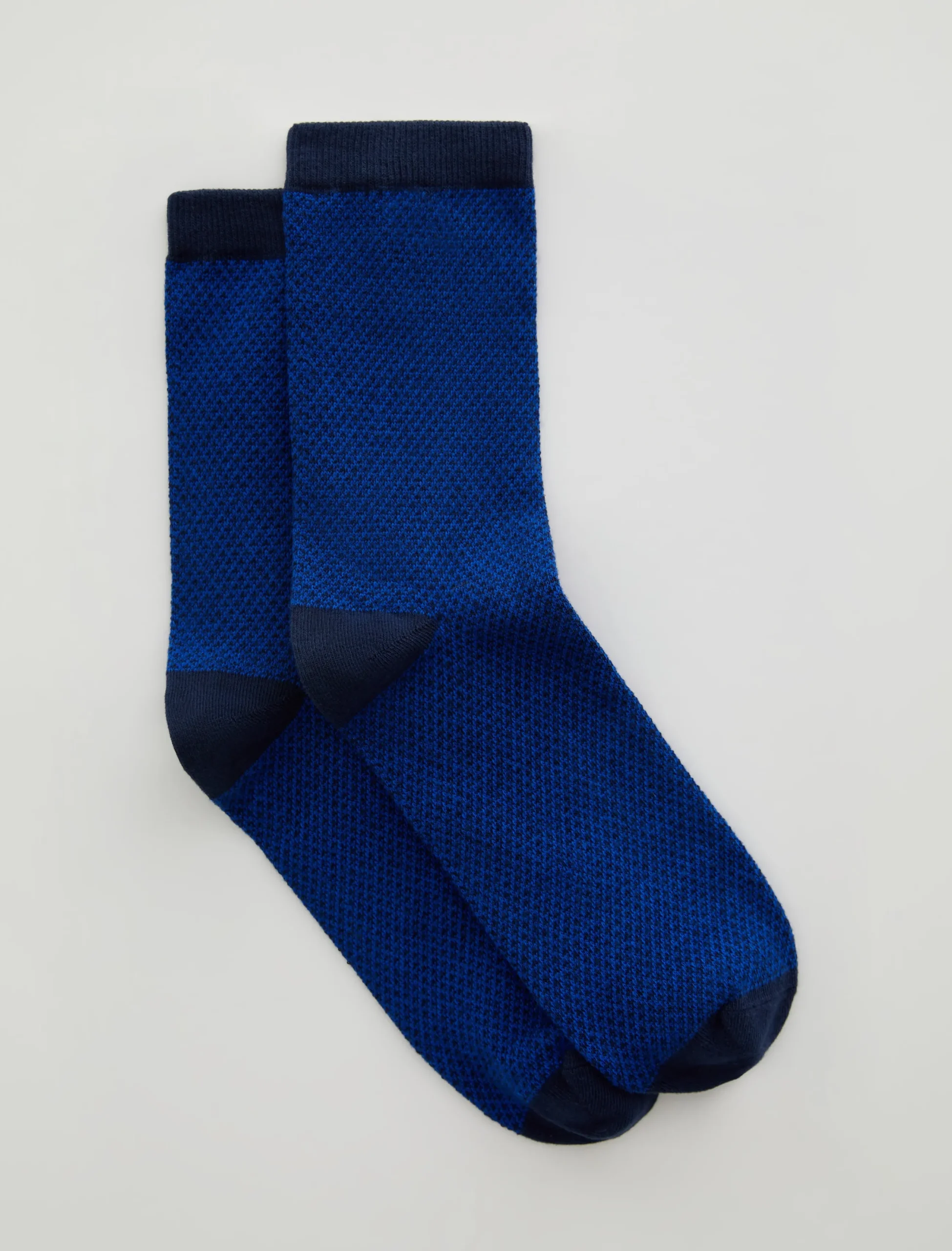 This sock is our classic crew sock. Featuring a check pattern, this pair has been knitted from a comfortable cotton blend and ribbed through the ankles.