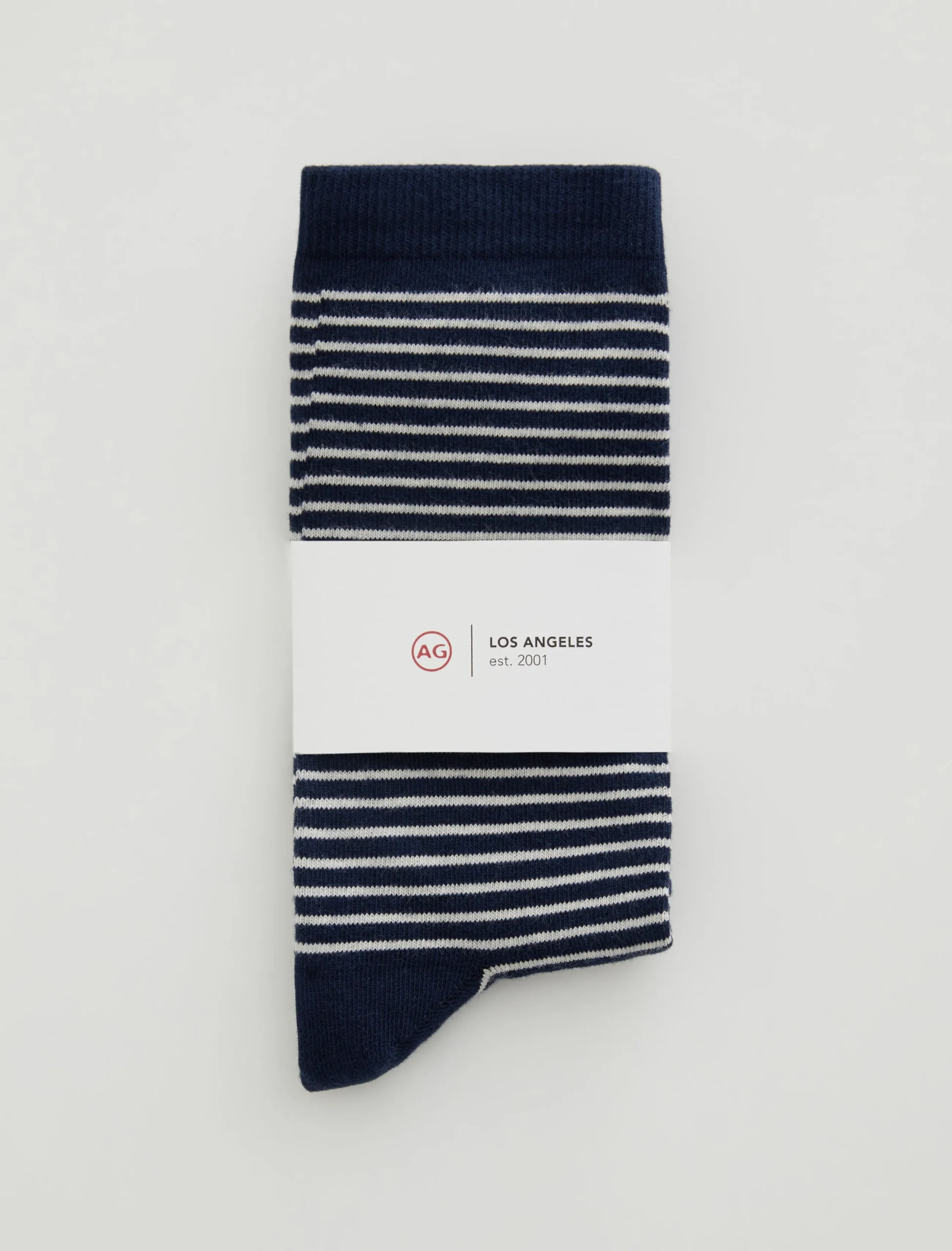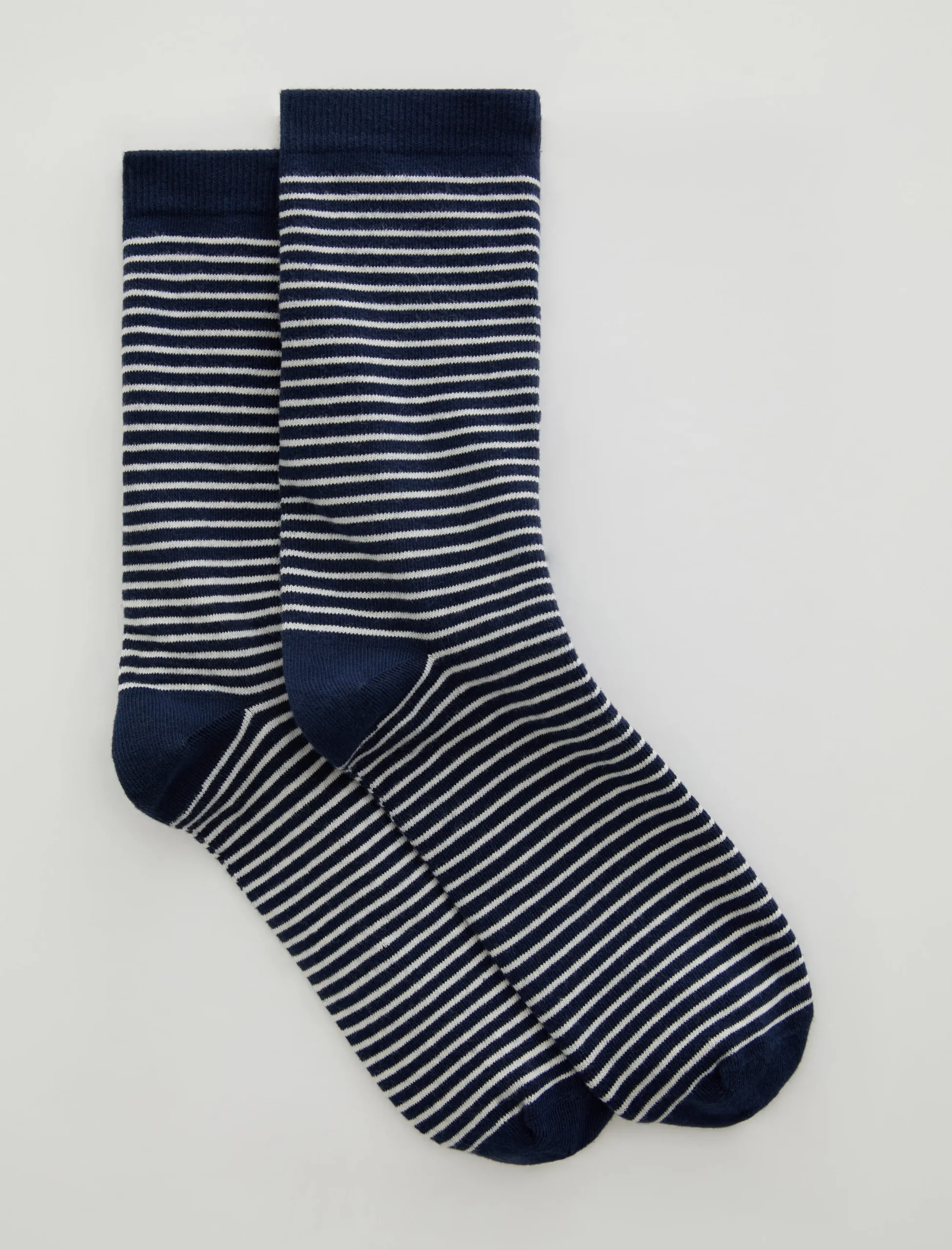 This sock is our classic crew sock. Featuring a stripe pattern, this pair has been knitted from a comfortable cotton blend and ribbed through the ankles.