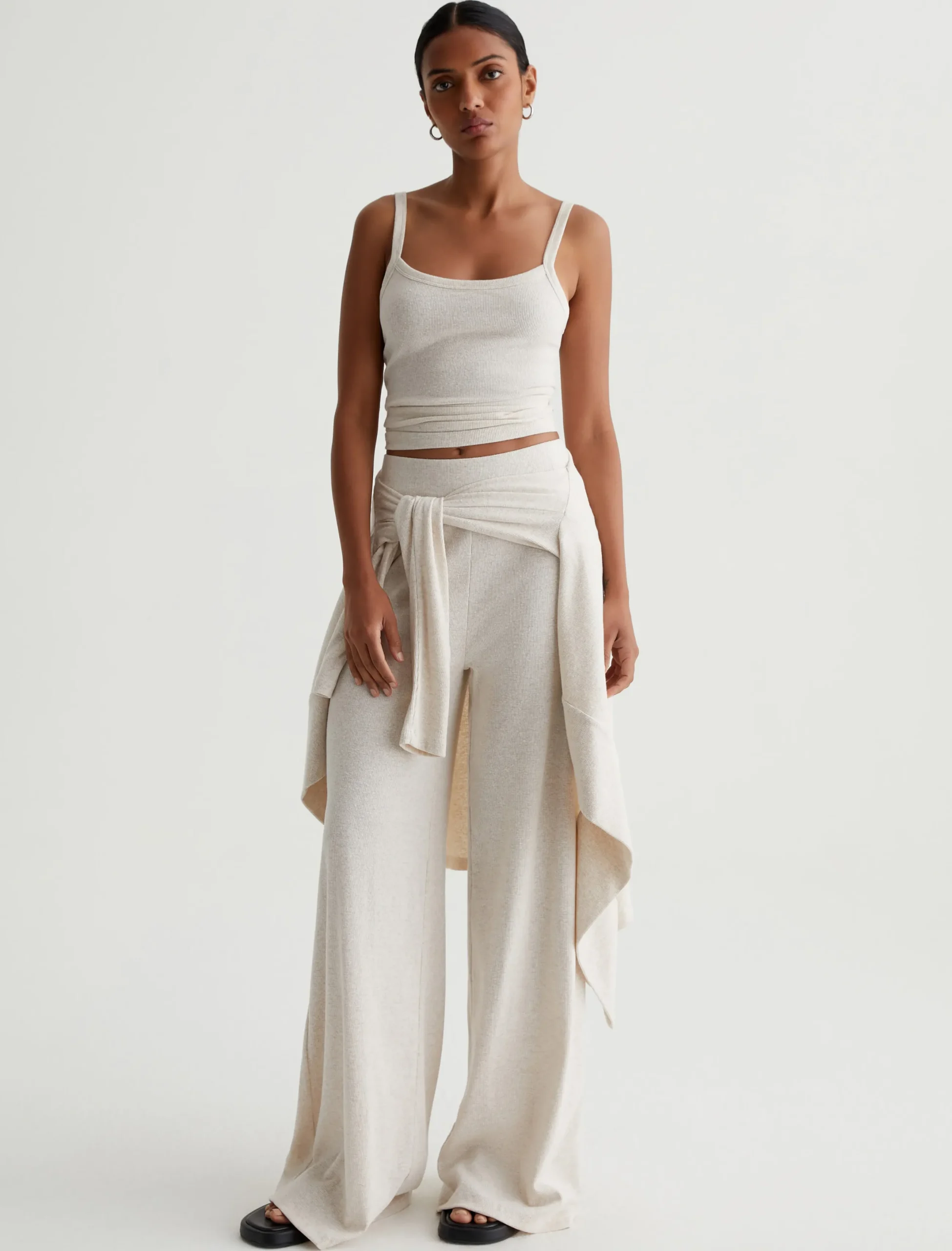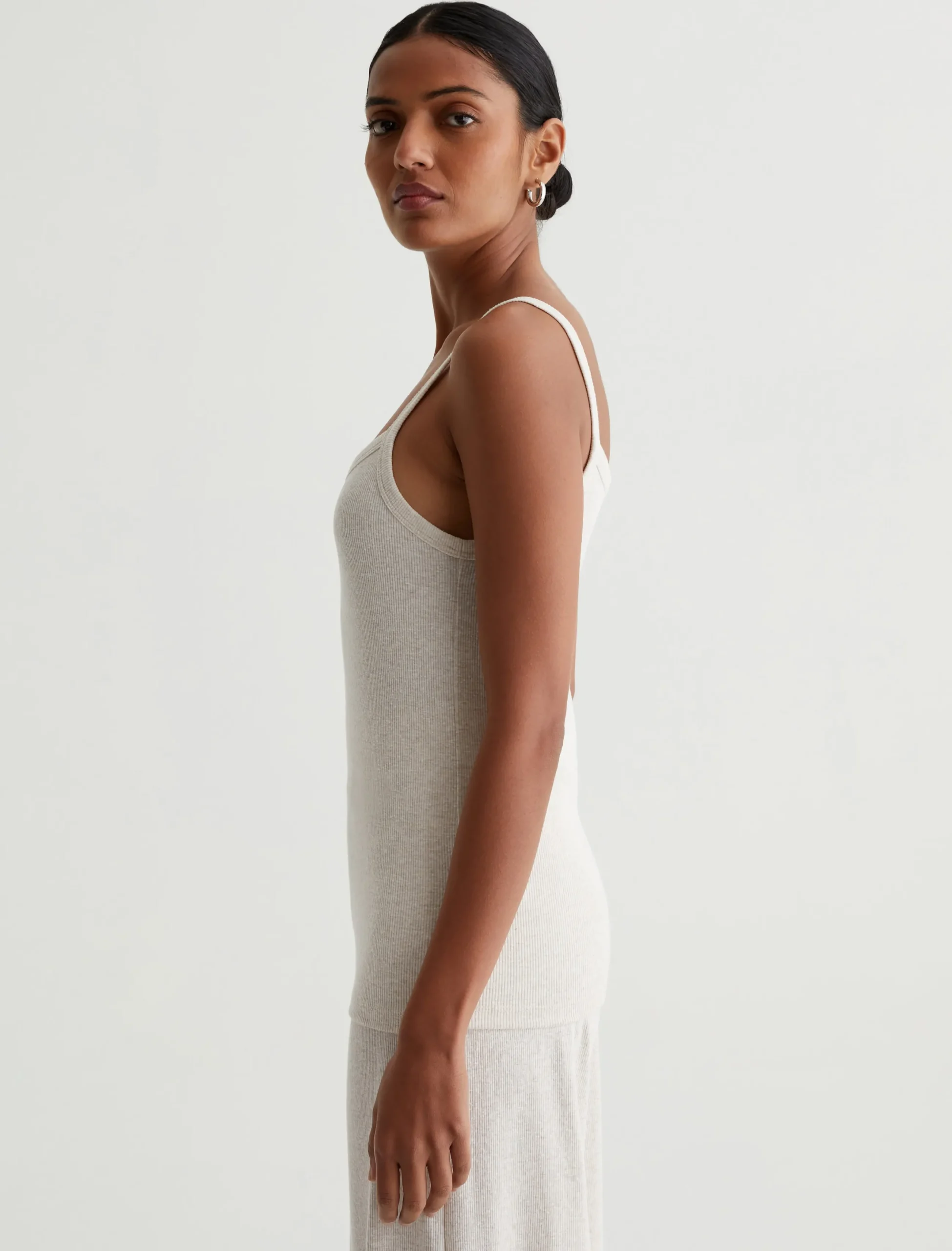A luxe piece for lounging and layering, the Ever Tank has a slim fit and soft feel in our Mélange Snow Rib. Featured here in heathered Snow White, this strappy knit top naturally pairs with our Saamie Cardigan and Sourie pants to create a cozy-chic set.