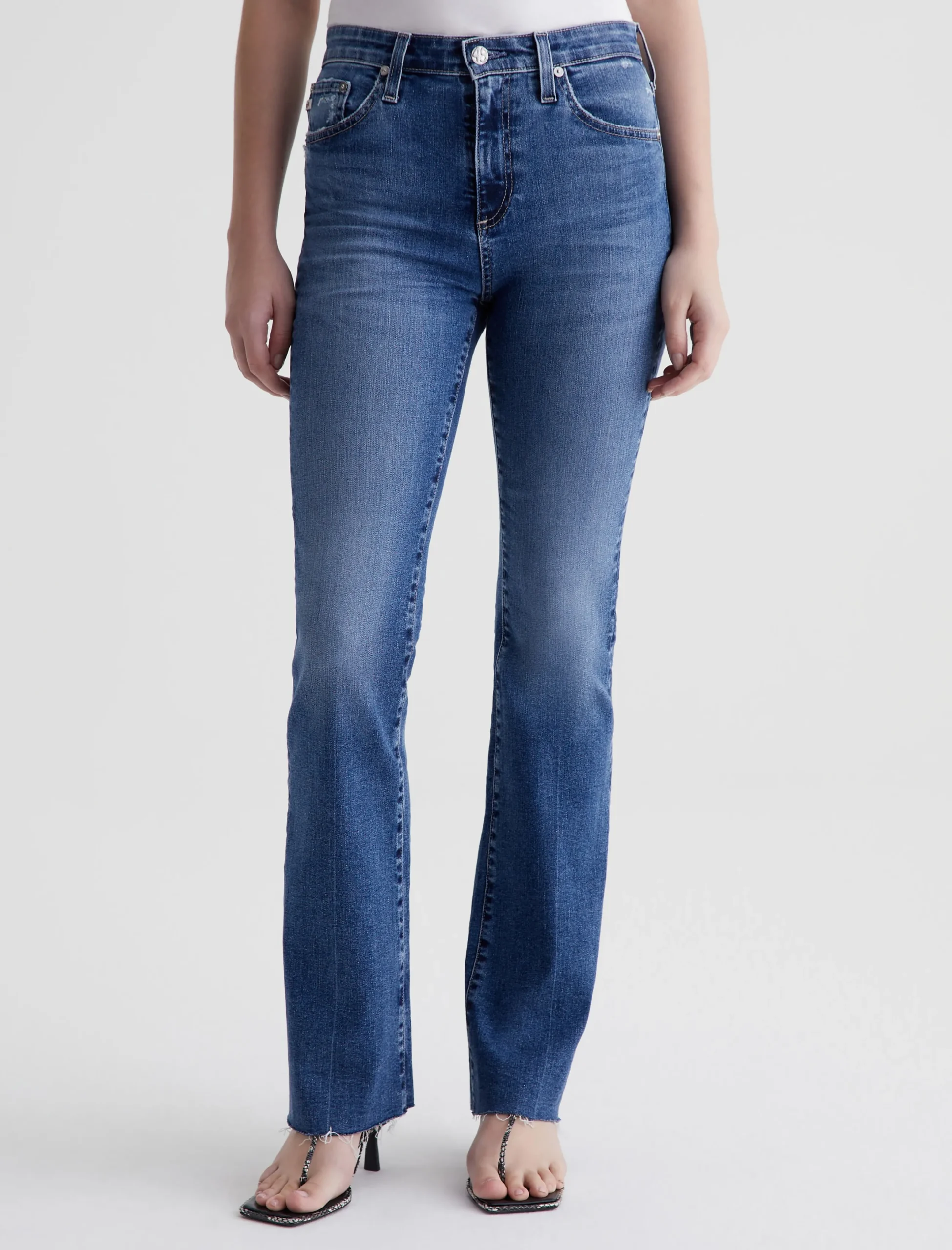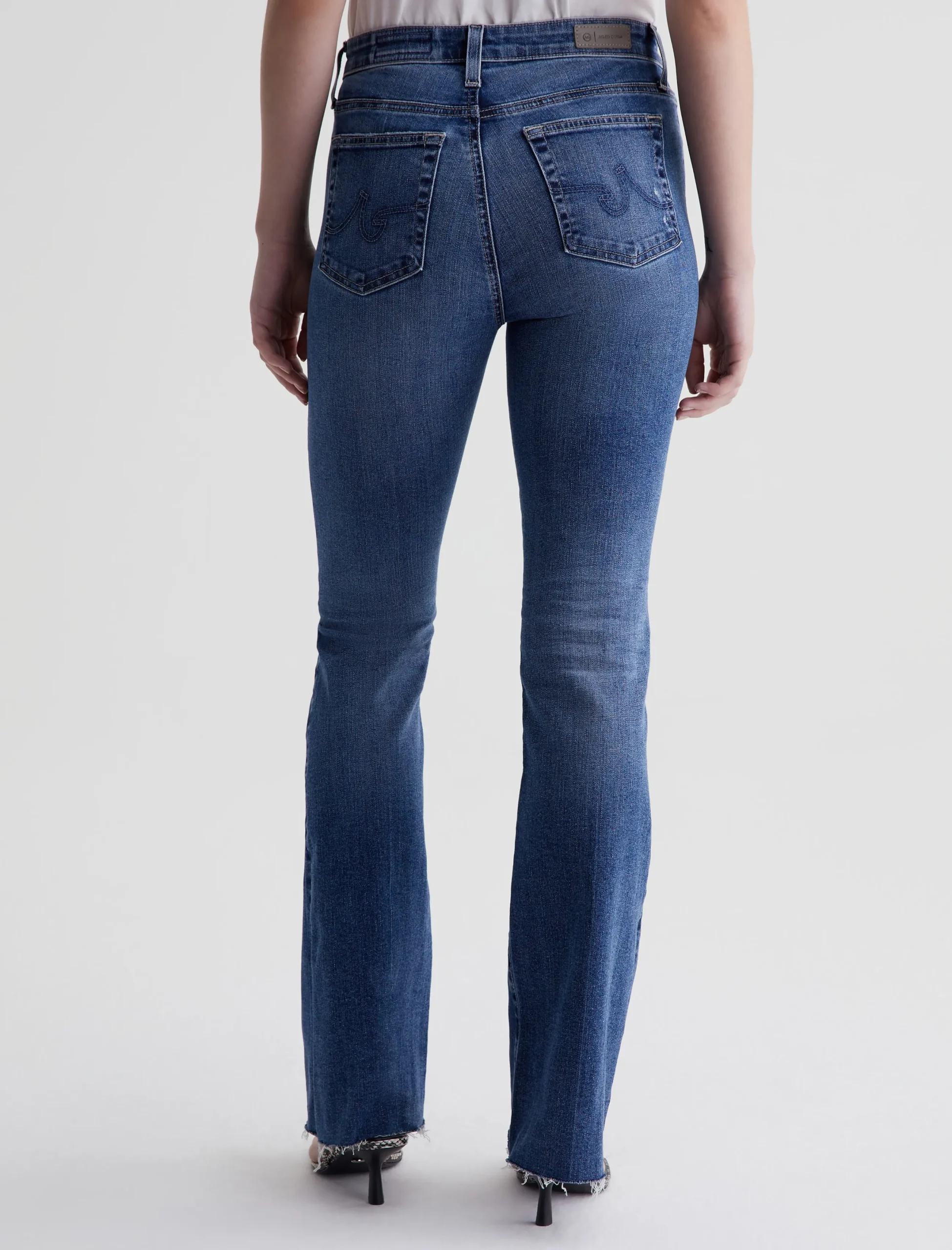 The Farrah Boot is our mid-rise bootcut jean in a medium indigo wash with an AG-ed™ Denim finish. It’s faded, whiskered, and distressed at the pockets. Crafted from 10 oz. Rouge Advanced Stretch Denim, the pair sits right at the natural waist and has a skinny fit through the legs before opening into a subtly flared shape. Raw hems finish the look.