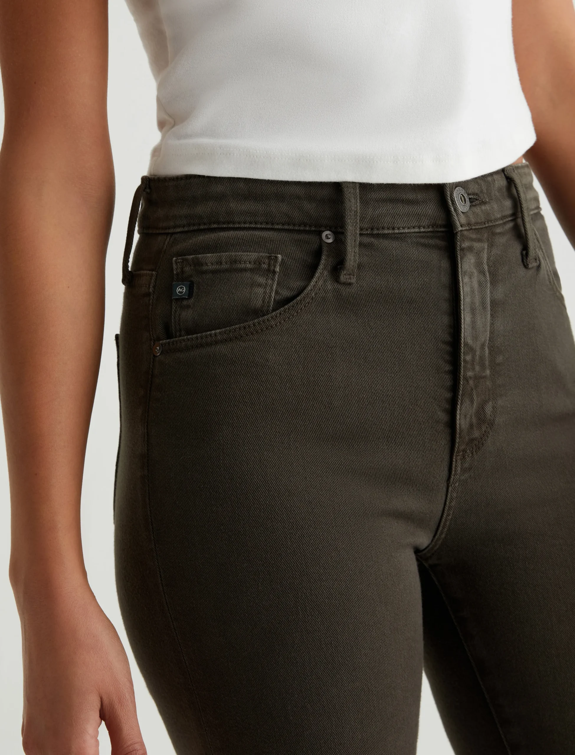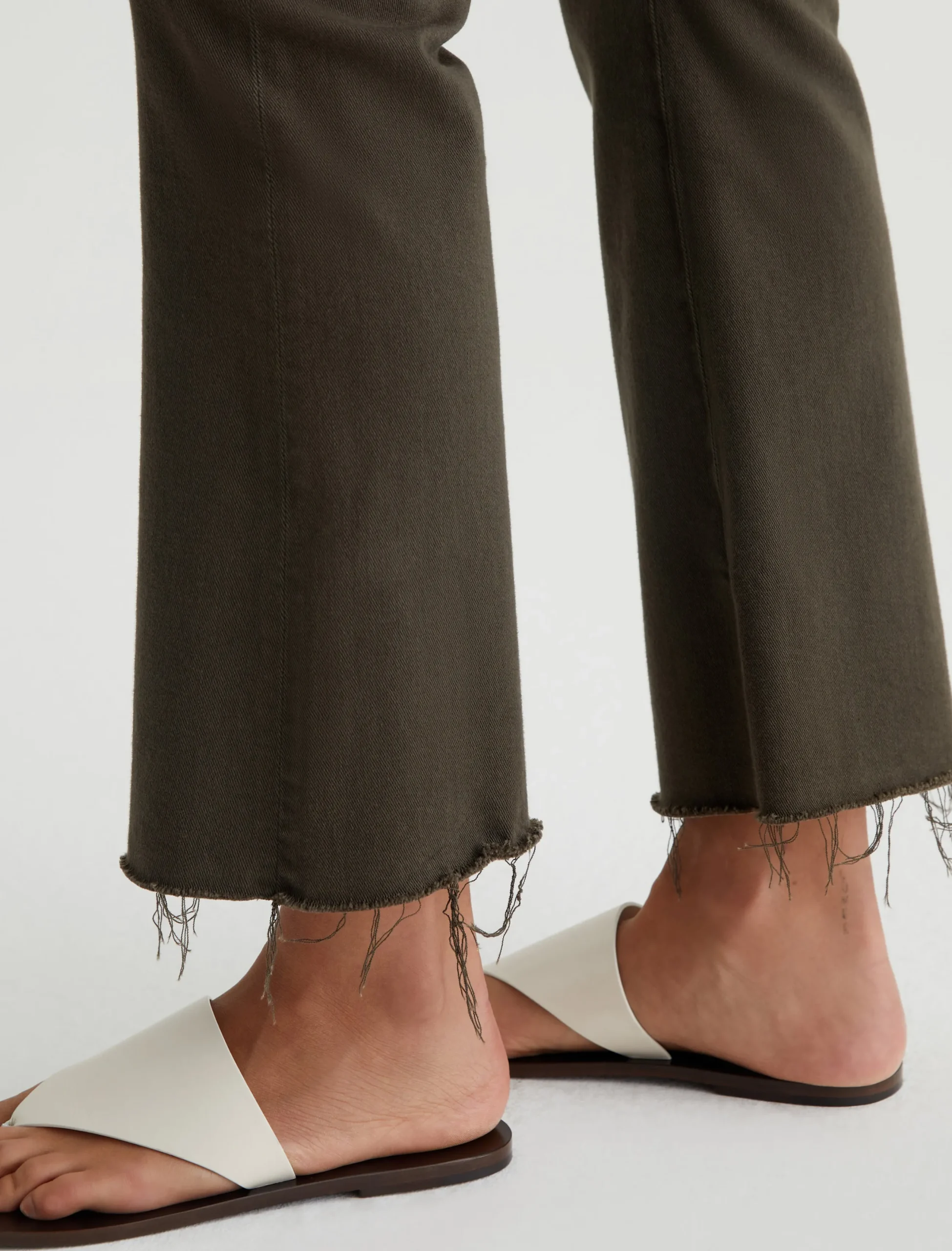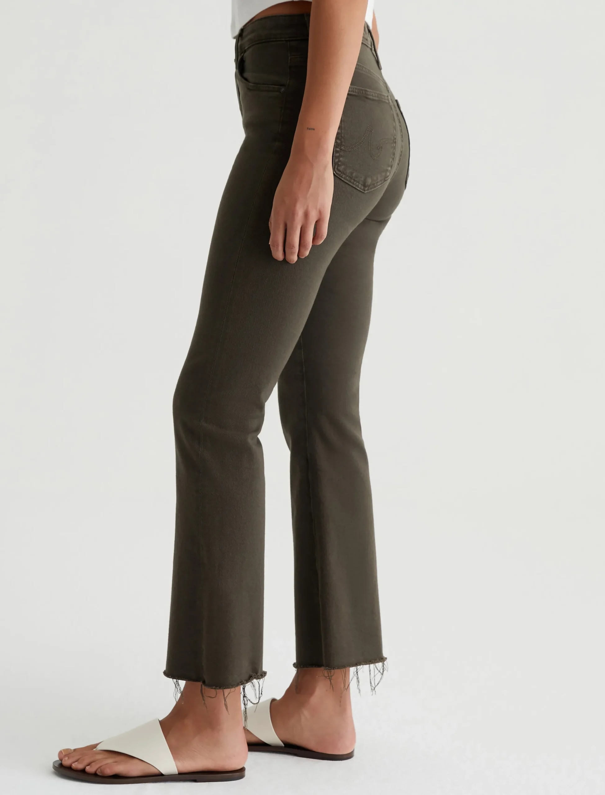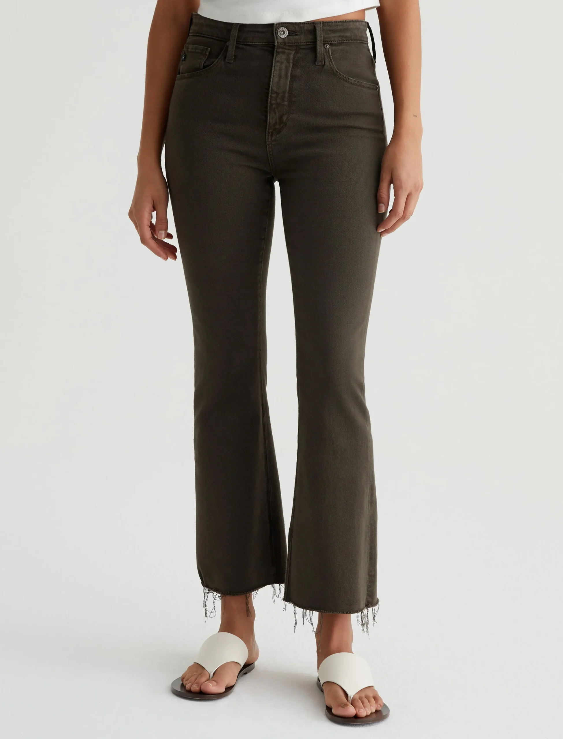 The Farrah Boot Crop jean is a mid-rise cropped bootcut updated in rich, sulfur-dyed brown. The pair has a skinny fit through the legs before opening into subtly flared raw hems. Part of our exclusive AG Cloud Soft Denim™ collection, these women’s bootcut jeans are made from 8.7 oz. Hyper Soft Bull Denim. This special left-hand twill fabric allows the yarns to gently relax and untwist for a supple, velvety-soft feel. It’s designed to get even softer as you wear it. Superstretch construction offers added comfort and enhanced recovery.