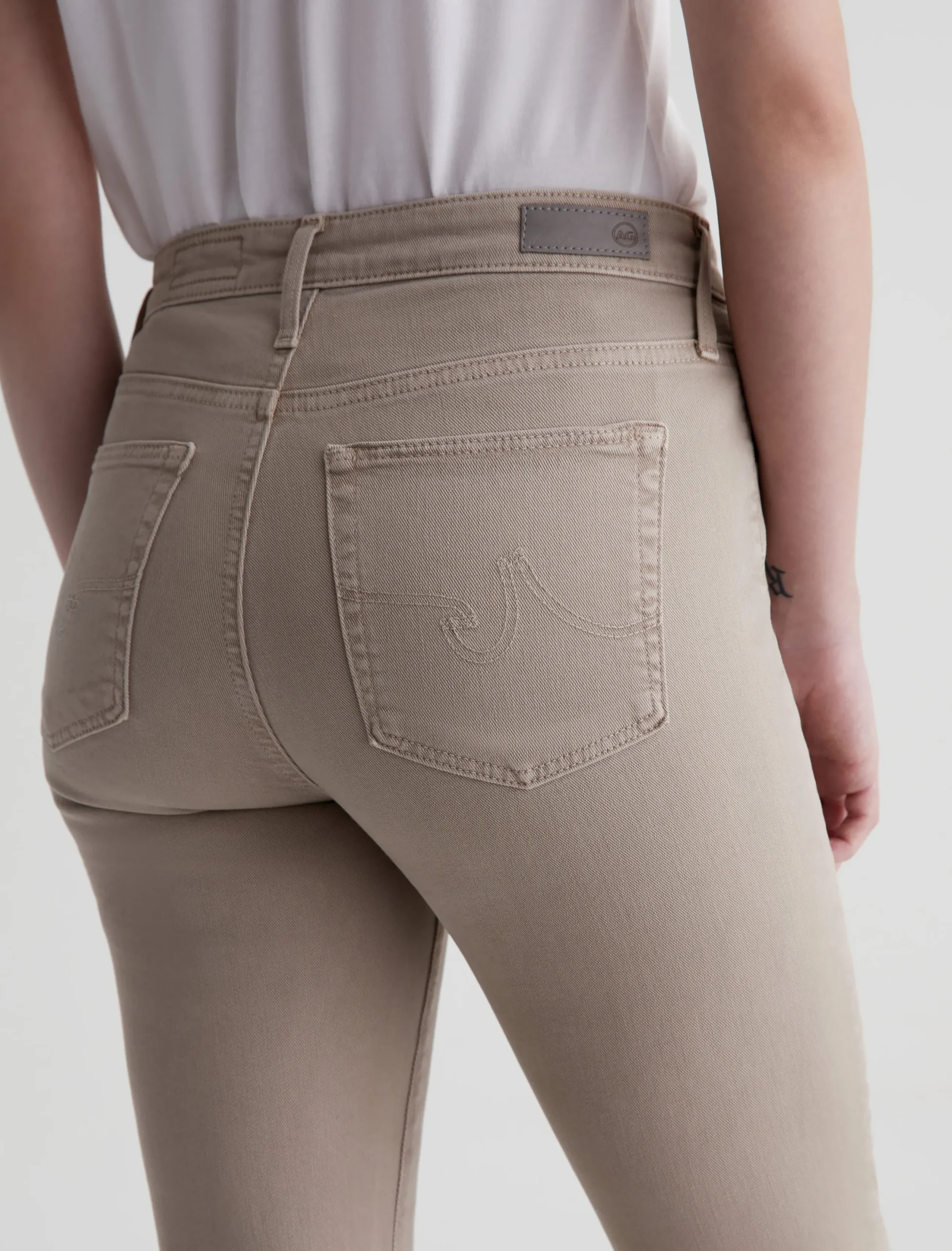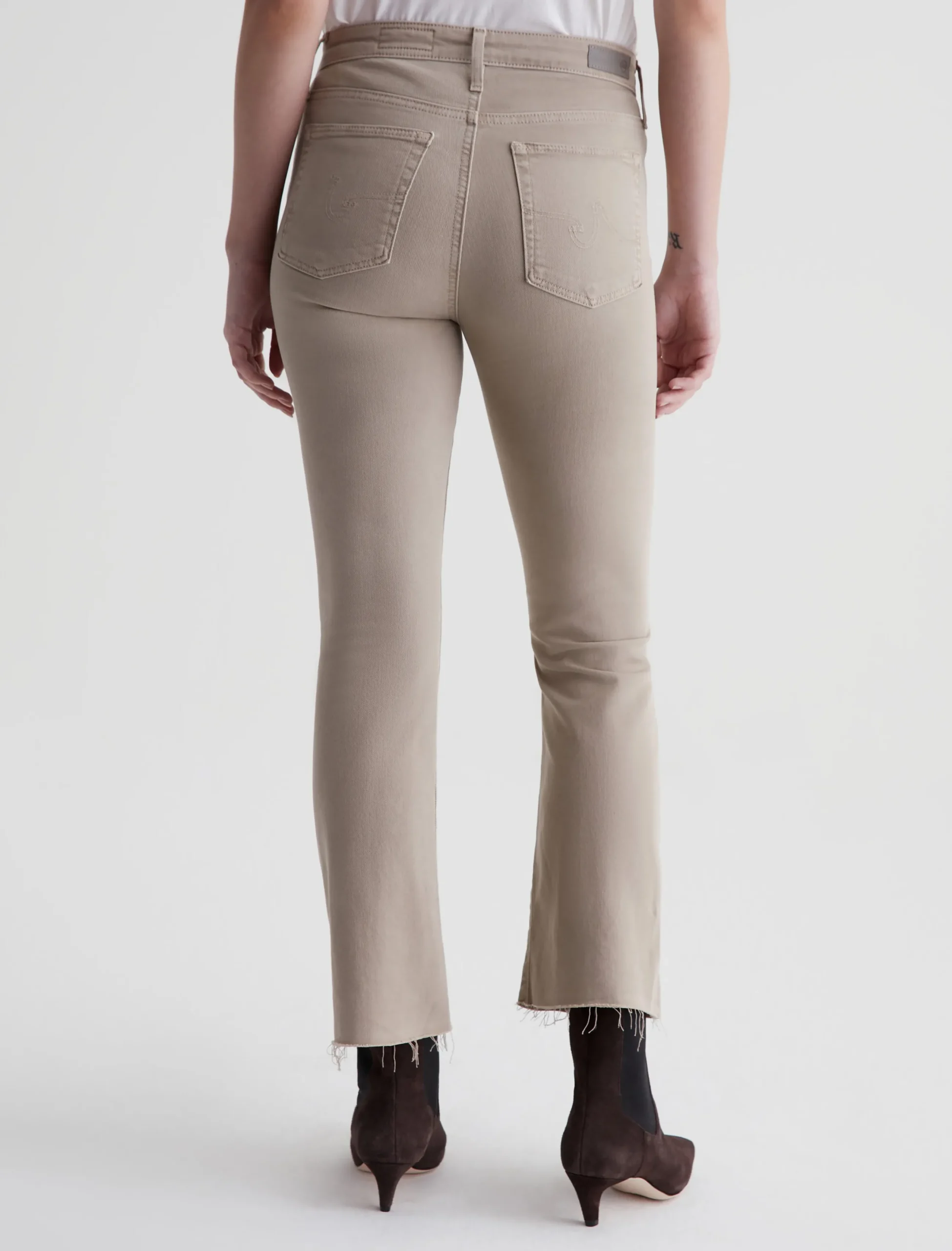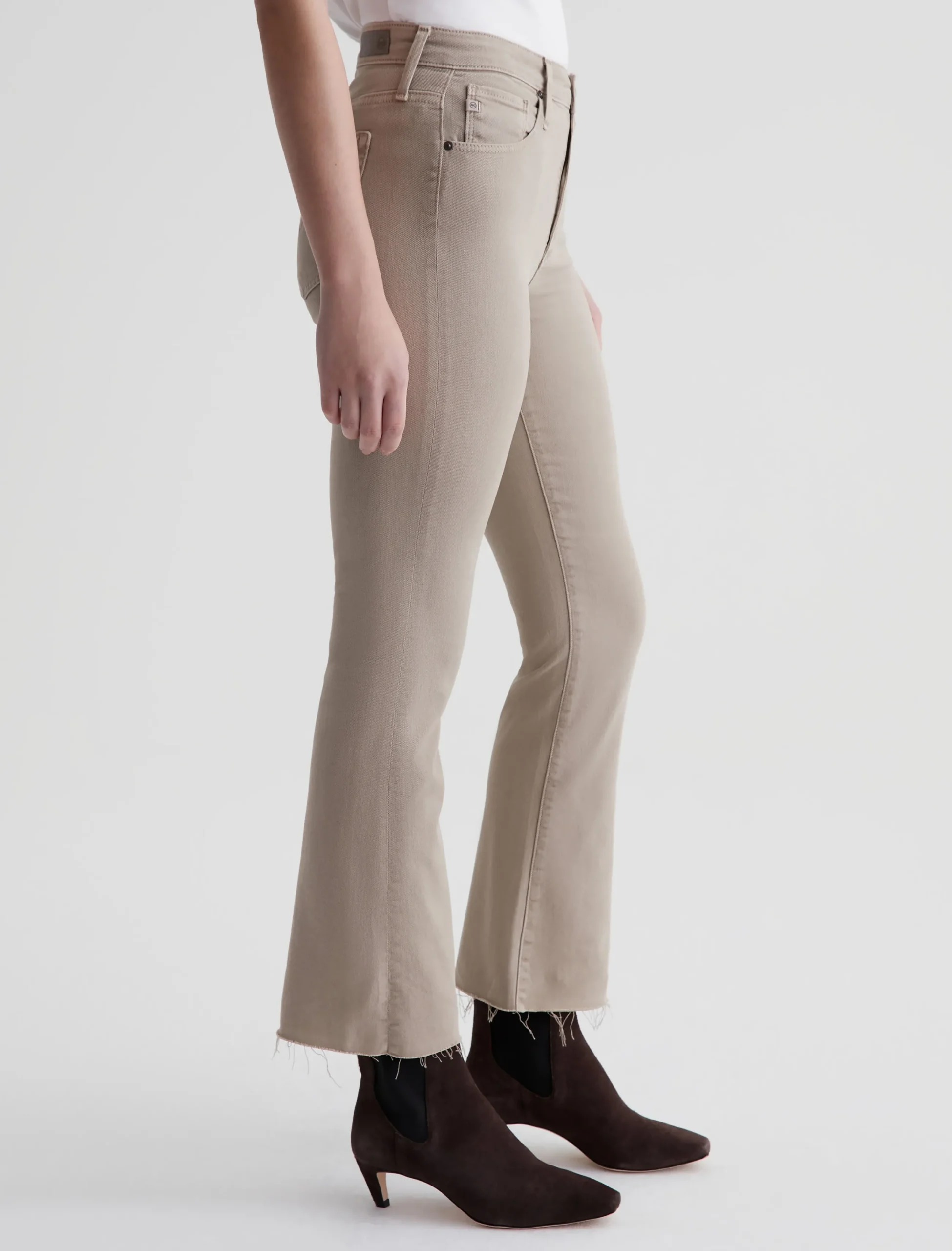 The Farrah Boot Crop jean is a mid-rise cropped bootcut silhouette that’s been sulfur-dyed for a faded khaki shade. The pair has a skinny fit through the legs before opening into subtly flared raw hems. Made from our exclusive AG Cloud Soft Denim™, these women’s bootcut jeans are designed in 8.7 oz. Hyper Soft Bull Denim, a left-hand twill fabric that allows the yarns to gently relax and untwist for a supple, velvety-soft feel. It’s designed to get even softer as you wear it. Superstretch construction offers added comfort and enhanced recovery.
