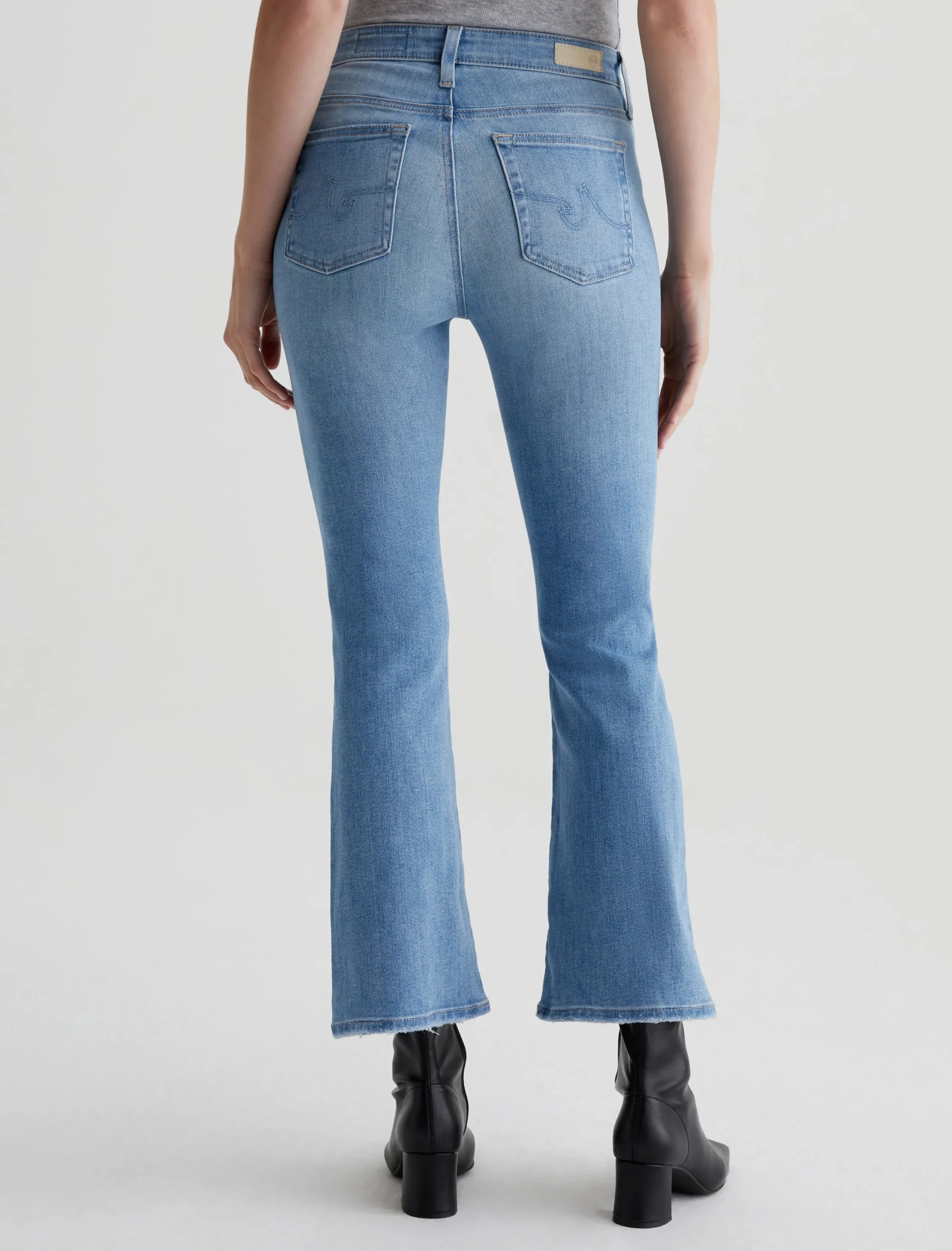 The Farrah Boot Crop jean is a mid-rise cropped bootcut silhouette in a faded blue wash. Crafted from 11.5 oz. Sioux Stretch Denim from Japan, these five-pocket jeans have a skinny fit through the legs before opening into subtly flared hems.