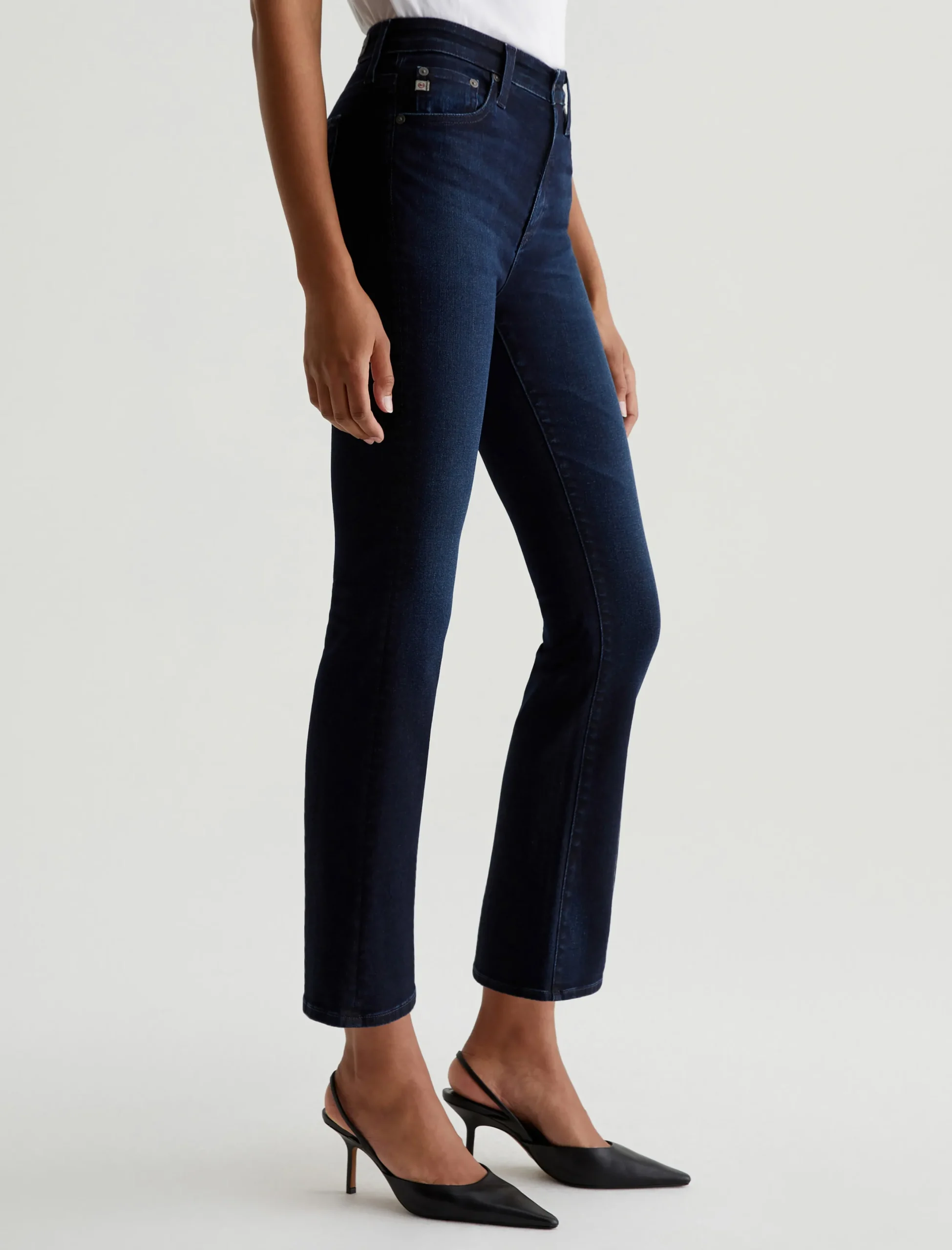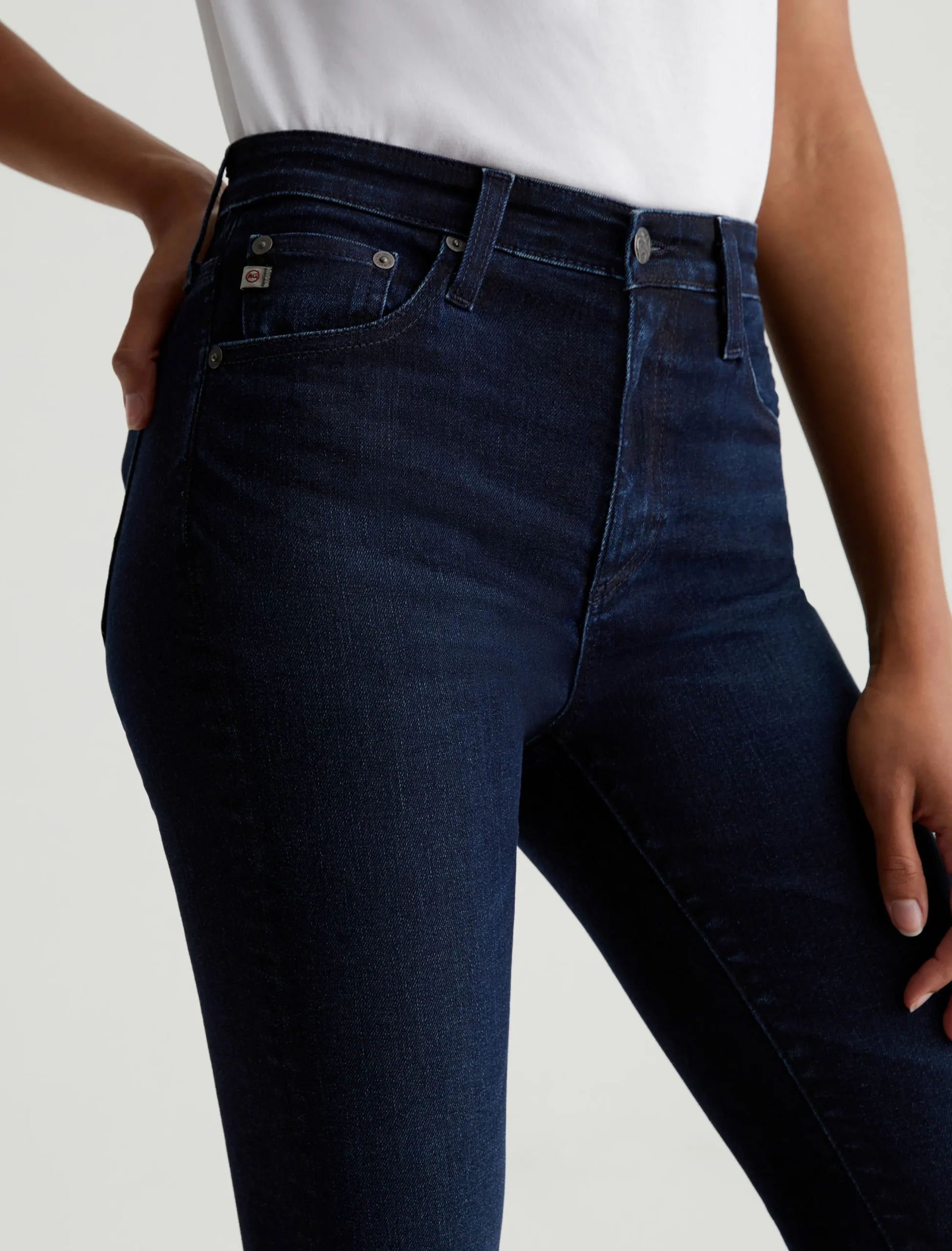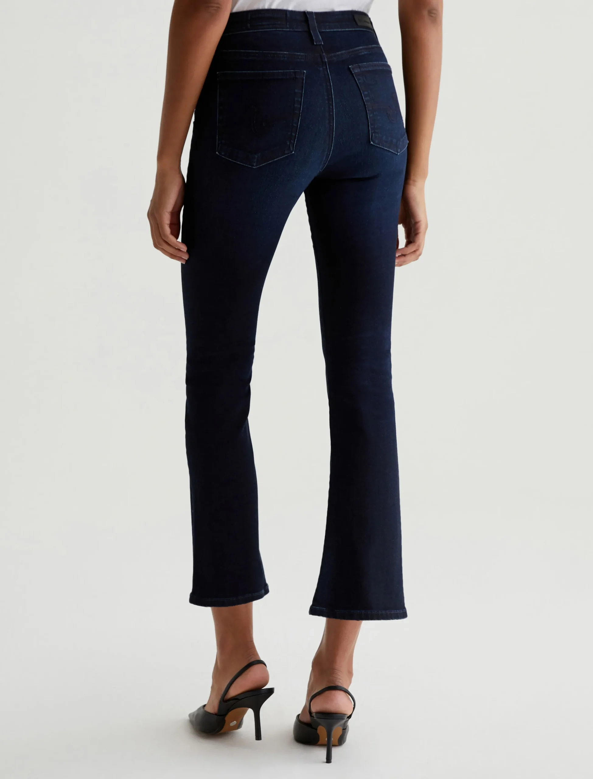 Our Farrah Boot Crop jeans feature a mid-rise bootcut silhouette in 10 oz. superstretch Empower Denim from Japan. The AG-ed™ pair features a dark blue wash worn in by subtle fading and whiskering. These women’s bootcut jeans sit right at the natural waist and has a skinny fit through the legs before opening into a subtle flare.