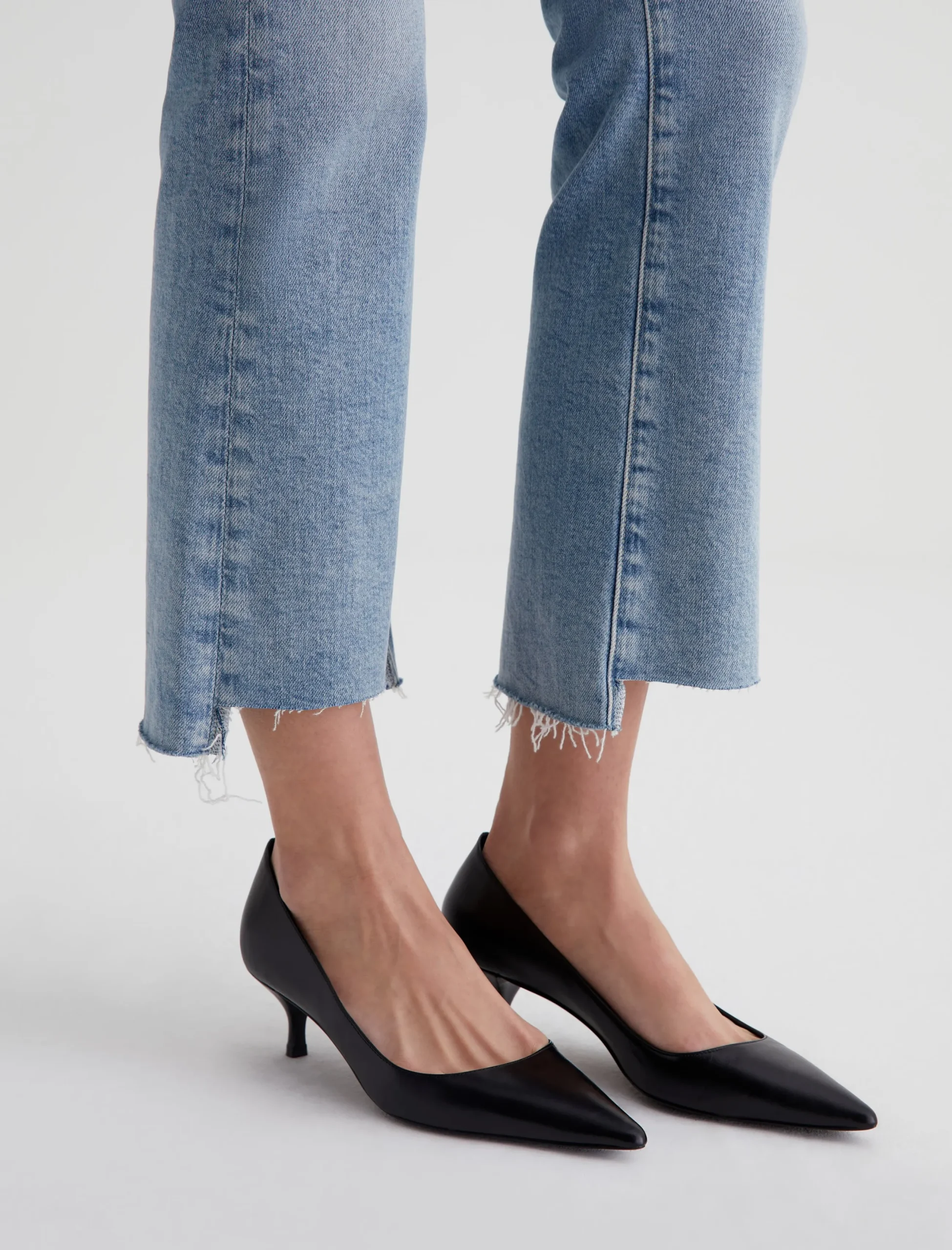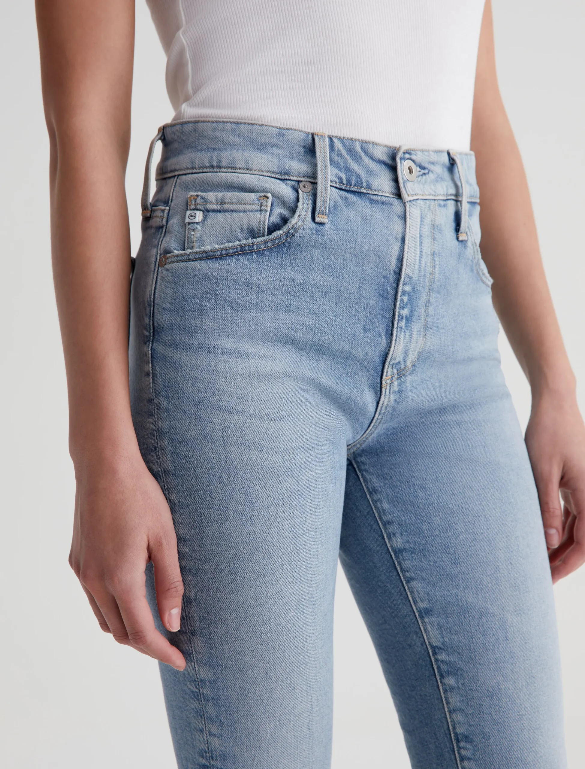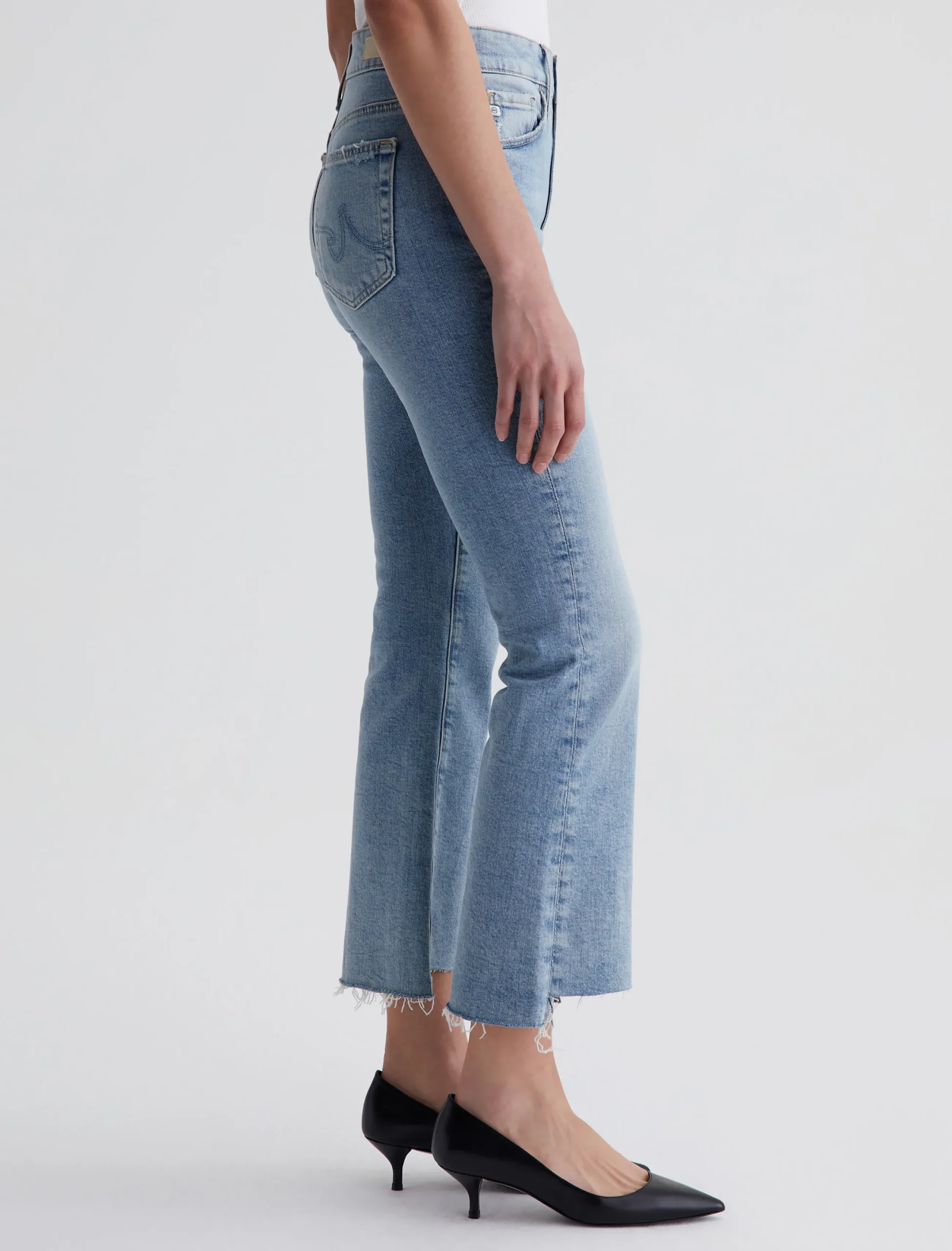 Our Farrah Boot Crop jeans feature a mid-rise bootcut silhouette with cropped step hems. The pair has a skinny fit through the legs before opening into a subtly flared shape. Made from 11.75 oz. Vintage Comfort Stretch Denim, these women’s bootcut jeans come in a light indigo stonewash with a sun-bleached fade and gently worn pocket edges.