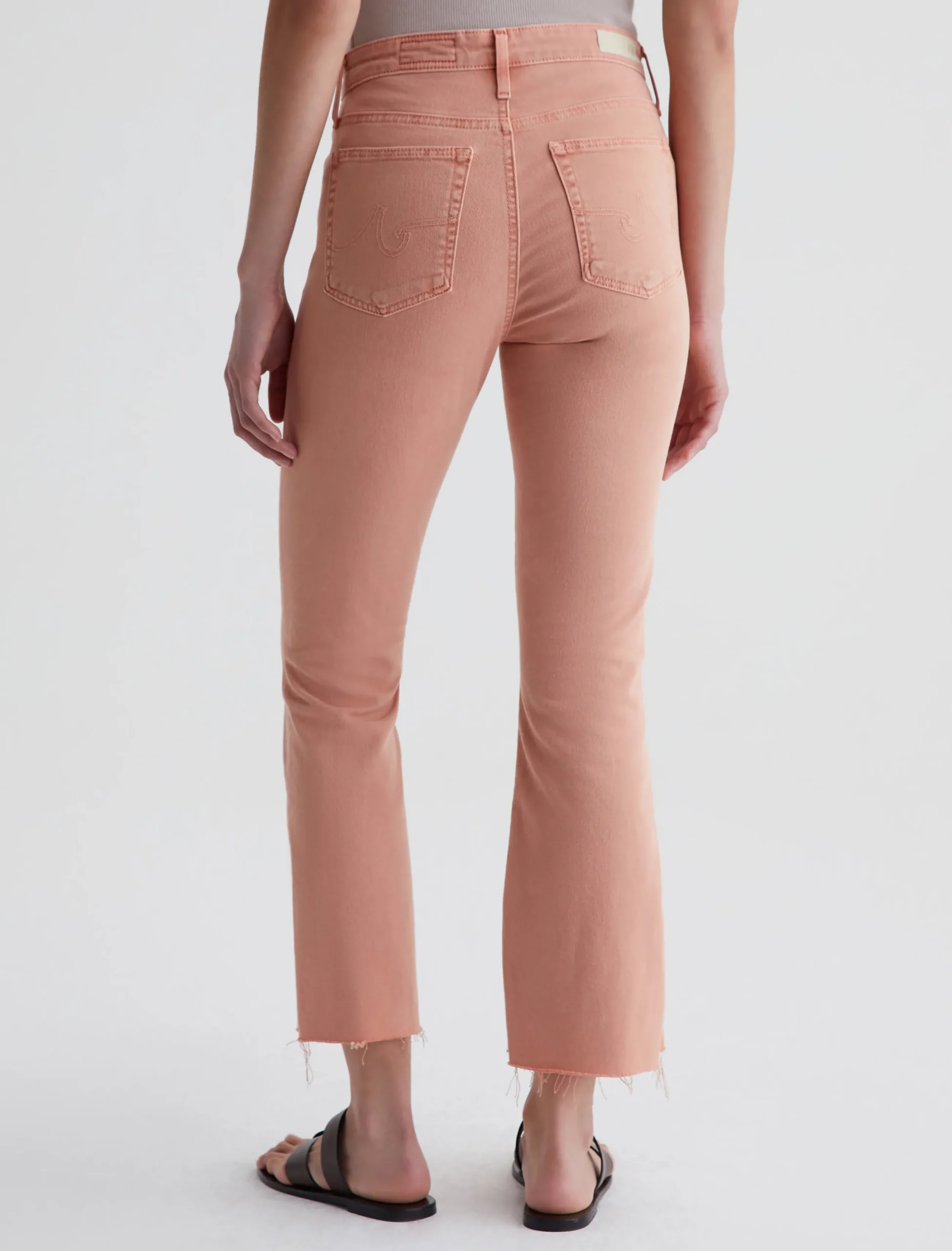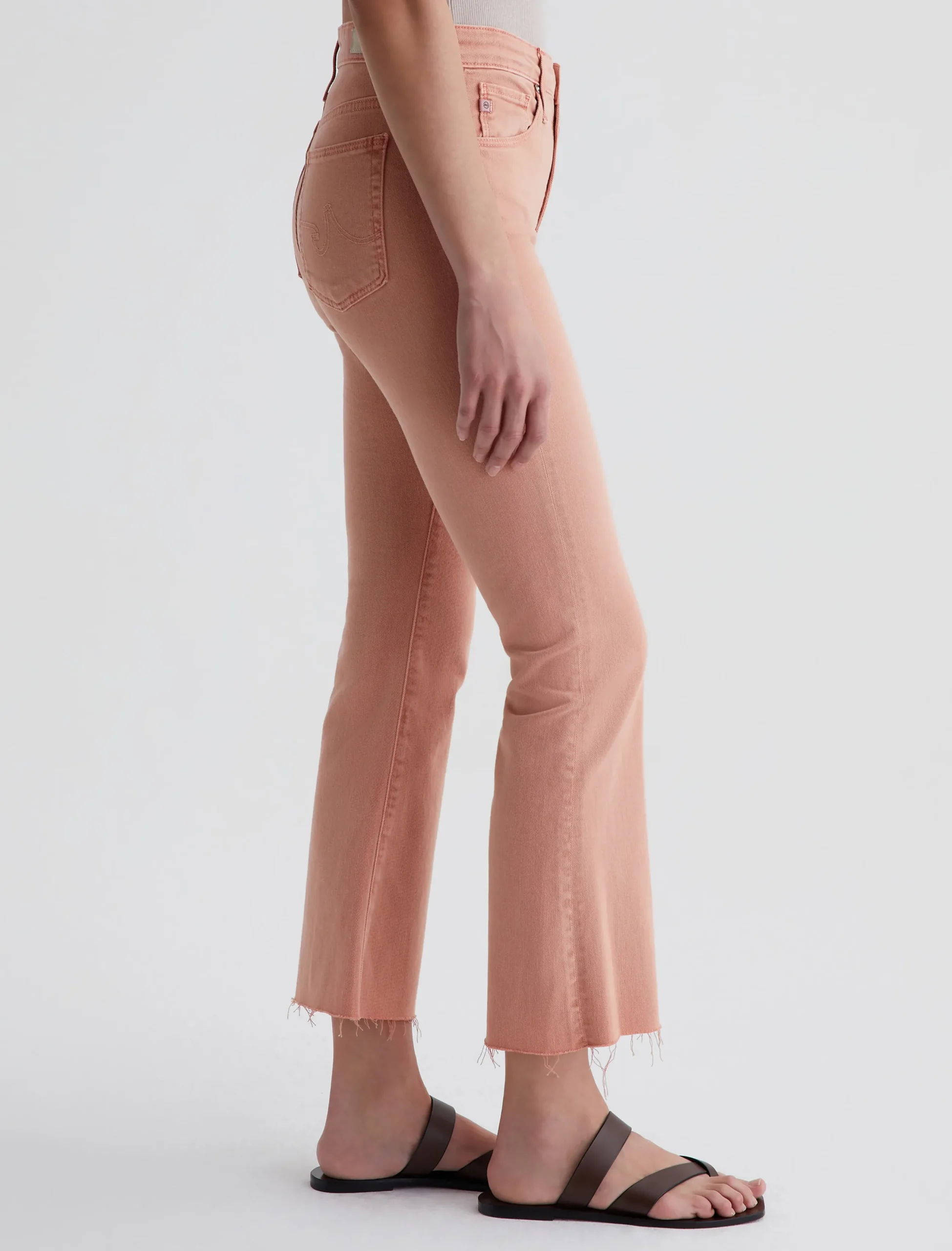 The Farrah Boot Crop jean is a mid-rise cropped bootcut silhouette that’s been sulfur-dyed for a faded peach shade. The pair has a skinny fit through the legs before opening into subtly flared raw hems. Made from our exclusive AG Cloud Soft Denim™, these women’s bootcut jeans are designed in 8.7 oz. Hyper Soft Bull Denim, a left-hand twill fabric that allows the yarns to gently relax and untwist for a supple, velvety feel. It’s designed to get even softer as you wear it. Superstretch construction offers added comfort and enhanced recovery.