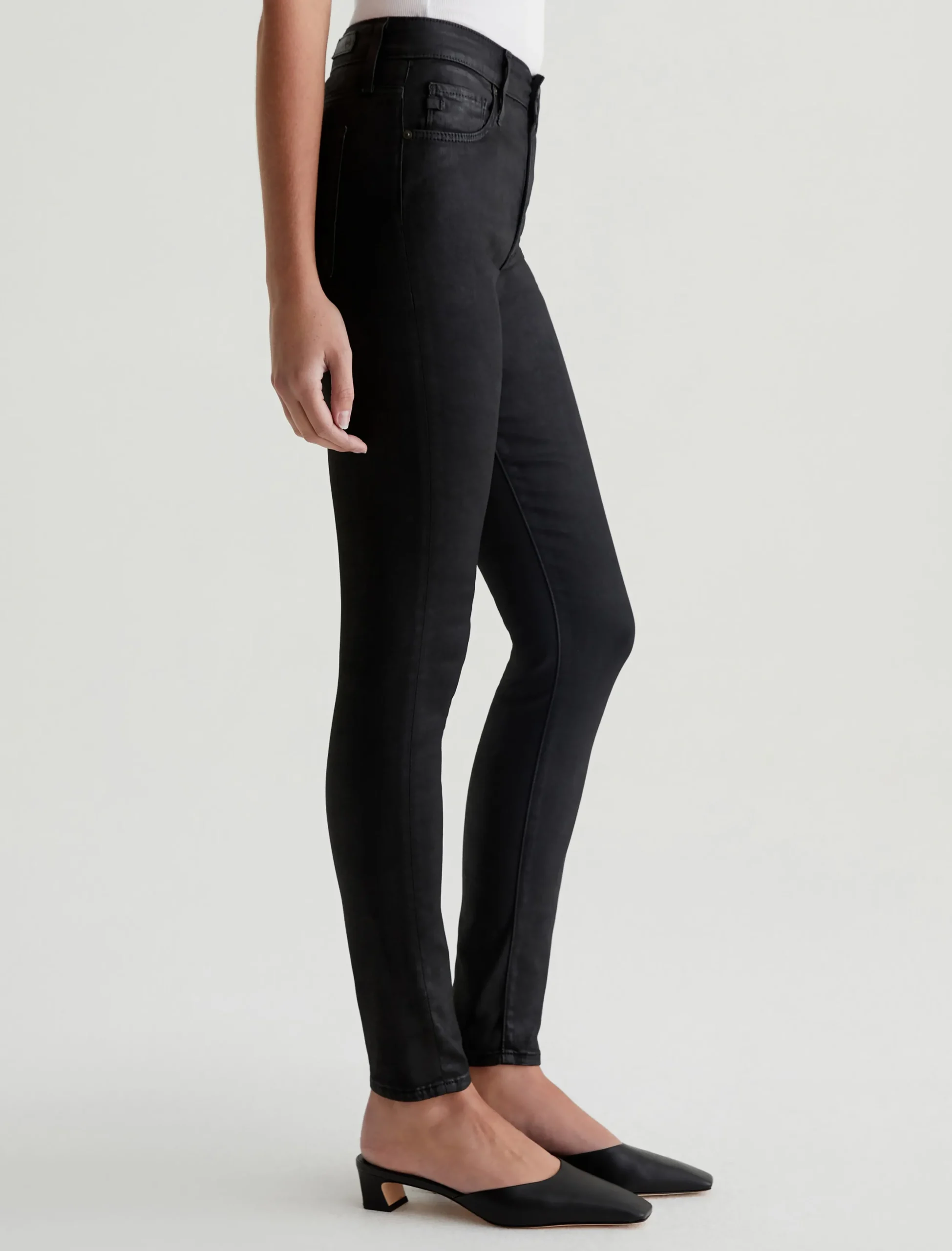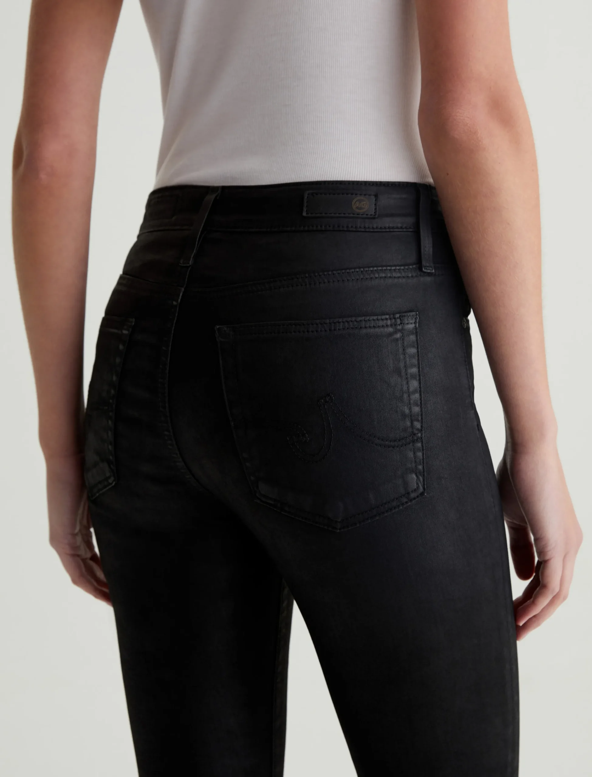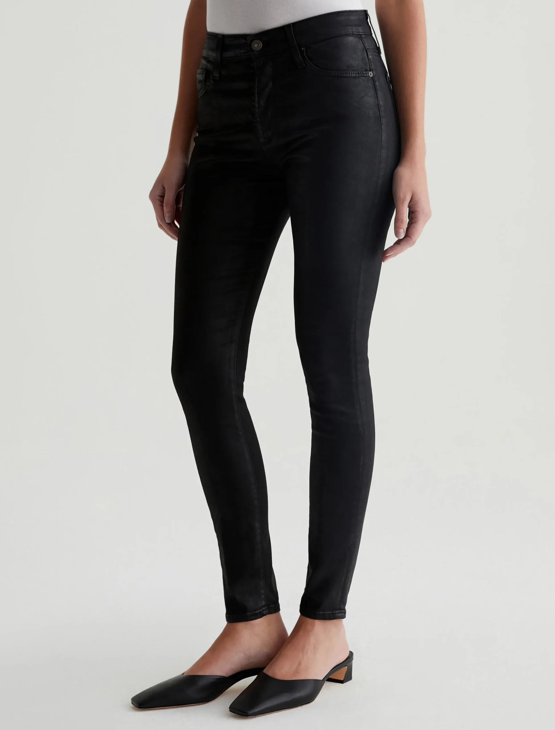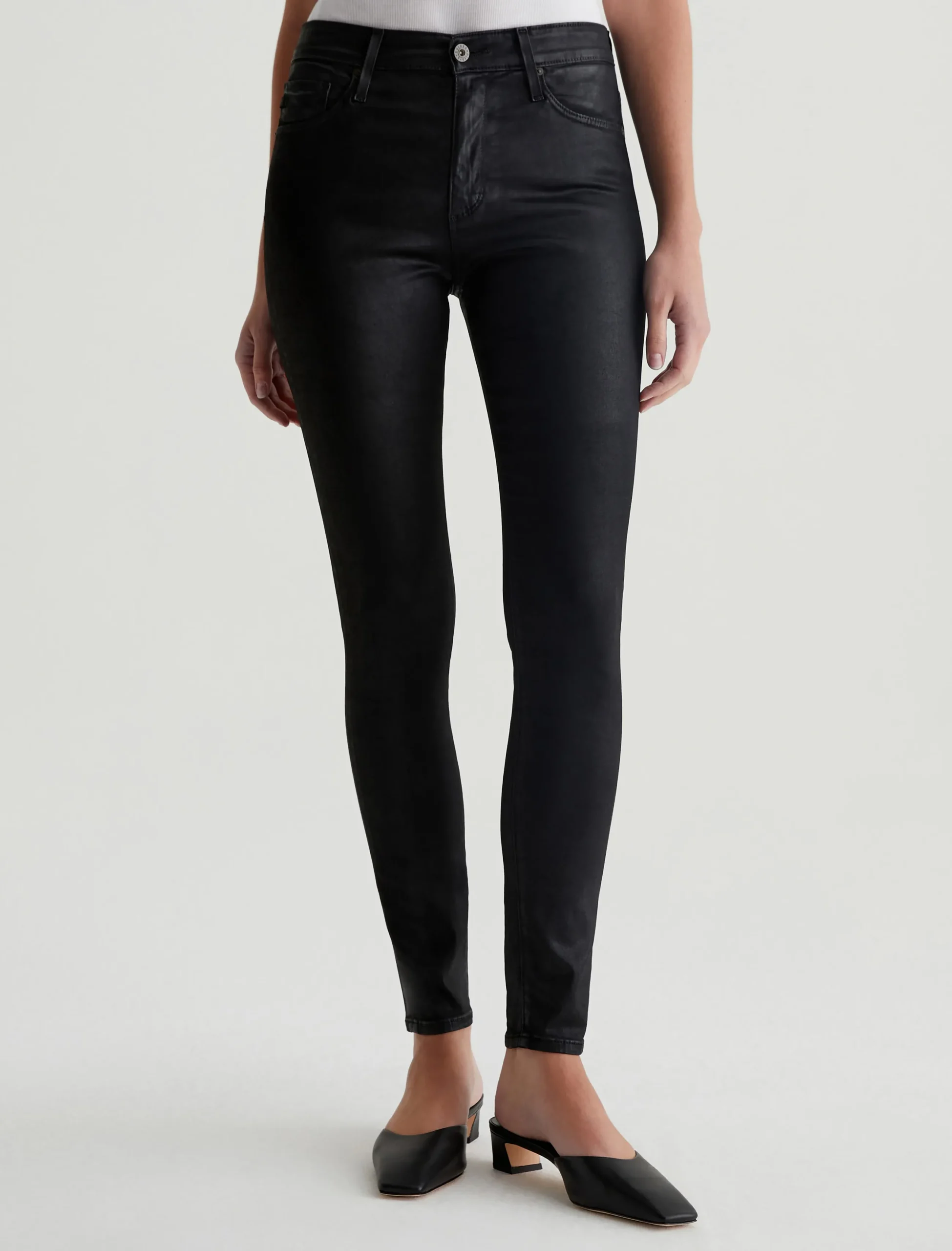 The Farrah Ankle skinny jean for women features a leatherette-coated black hue, cut with a flattering mid-rise waist and cropped length at the ankle. This women’s jean is designed in our Leatherette Luscious Super Stretch Sateen fabrication.