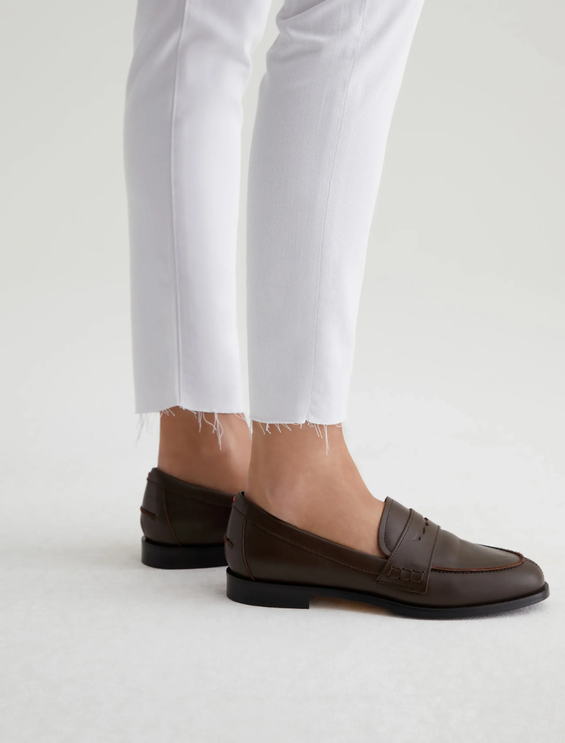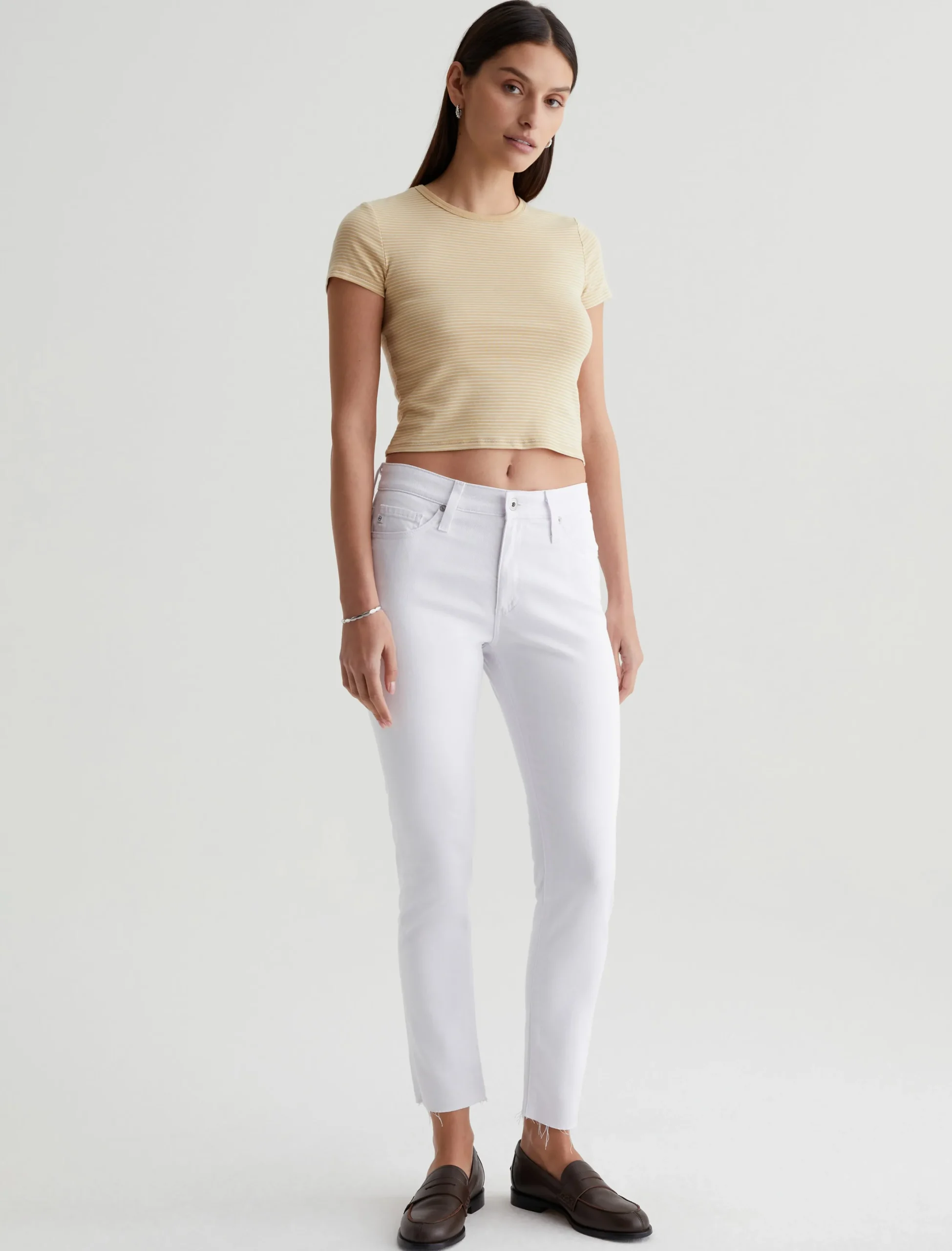 The Farrah Skinny Ankle jean in white features a flattering mid-rise waist and a streamlined fit through the legs, finishing with ankle-length raw hems. These five-pocket skinny jeans are crafted from 9.7 oz. Hyper-Soft Stretch Denim, an exclusive AG Cloud Soft Denim™ fabric. The special construction allows the yarns to gently relax and untwist for a supple feel that gets softer with every wear. There’s a generous amount of stretch woven in, offering a comfortable fit.