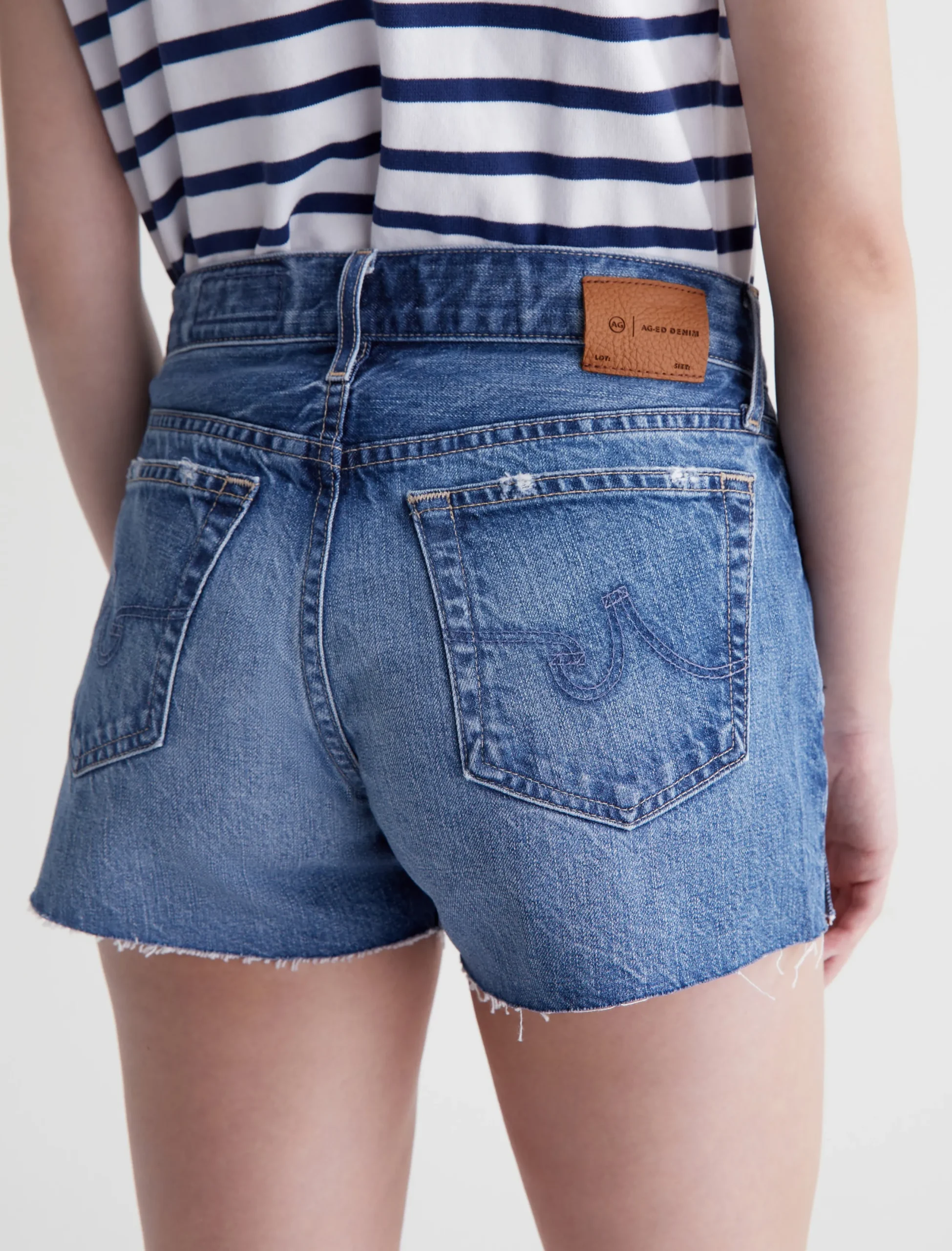 The Hailey Cut-Off Short is a boyfriend short for women, done here in an AG-ed™ medium indigo wash with heavy fading, whiskering, and raw hems. Hailey offers a flattering high-rise waist and relaxed silhouette. These women’s jean shorts are designed in 11.75 oz. Legion Denim made from 100% cotton. A bit of distressing at the pockets adds to the lived-in character.