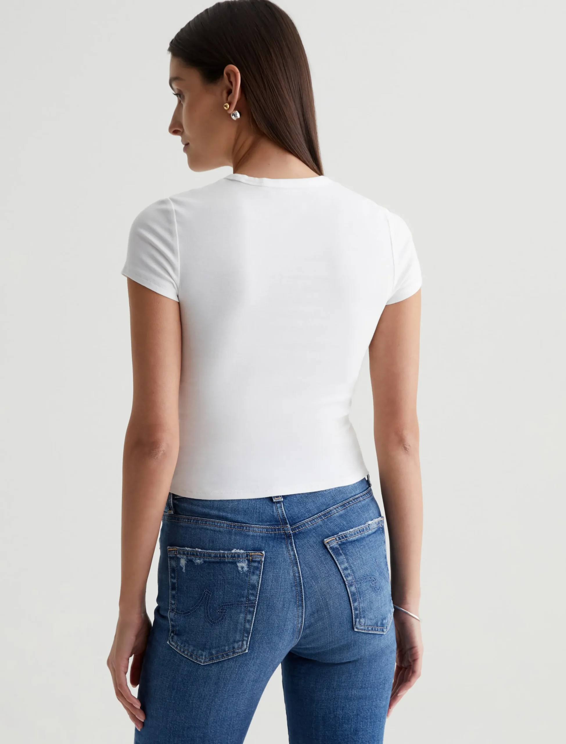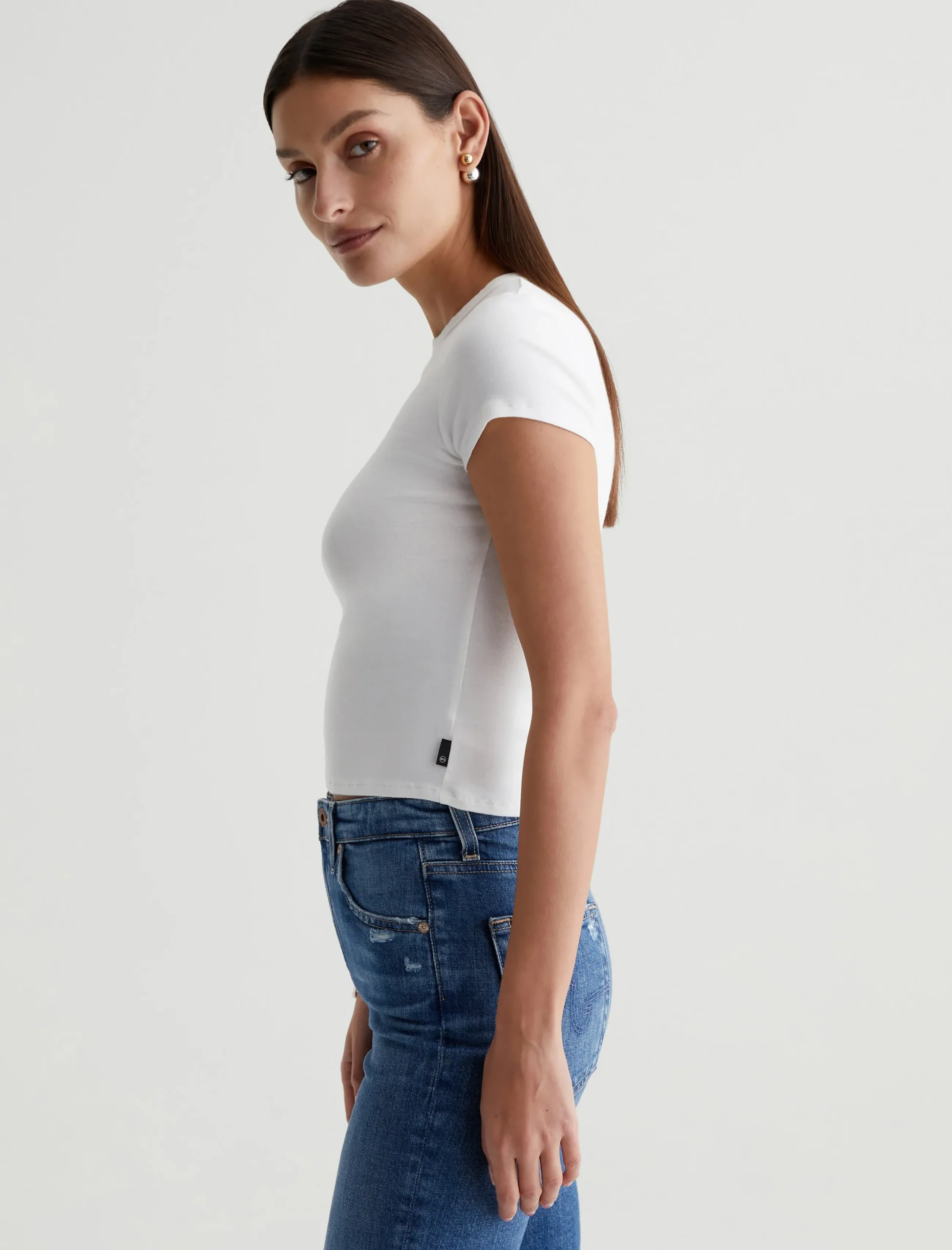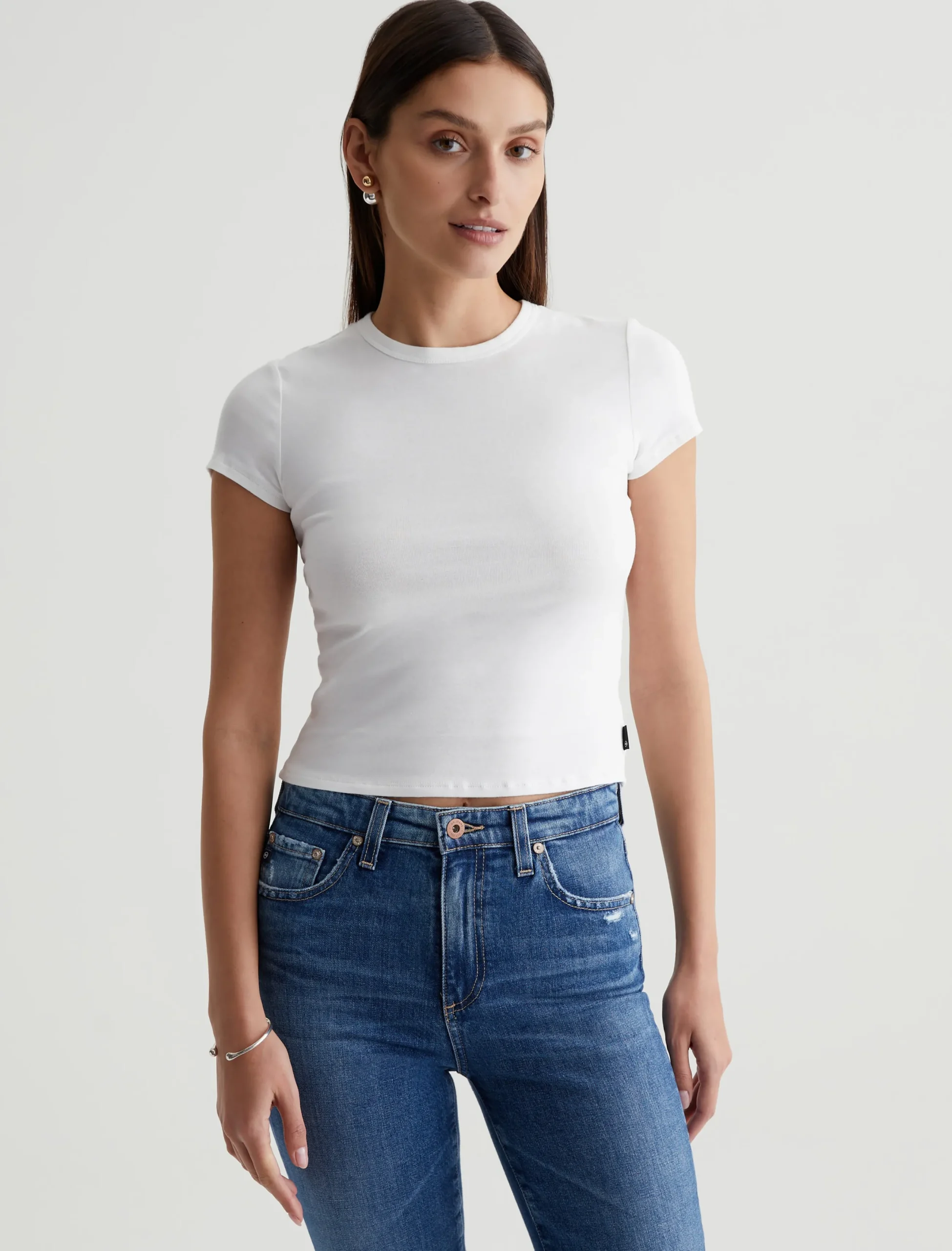 The Hutton Crew offers a throwback to ’70s style with its shrunken silhouette. Defined by a crew neckline and short sleeves, this baby tee fits close to the body and lands at the top of your high-waisted jeans. It’s soft and comfortable with the perfect amount of stretch in a white cotton-blend rib knit.