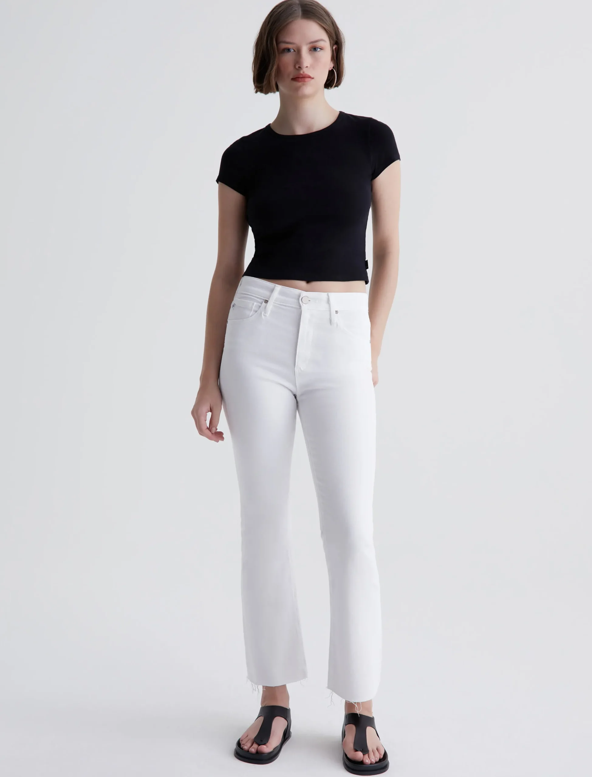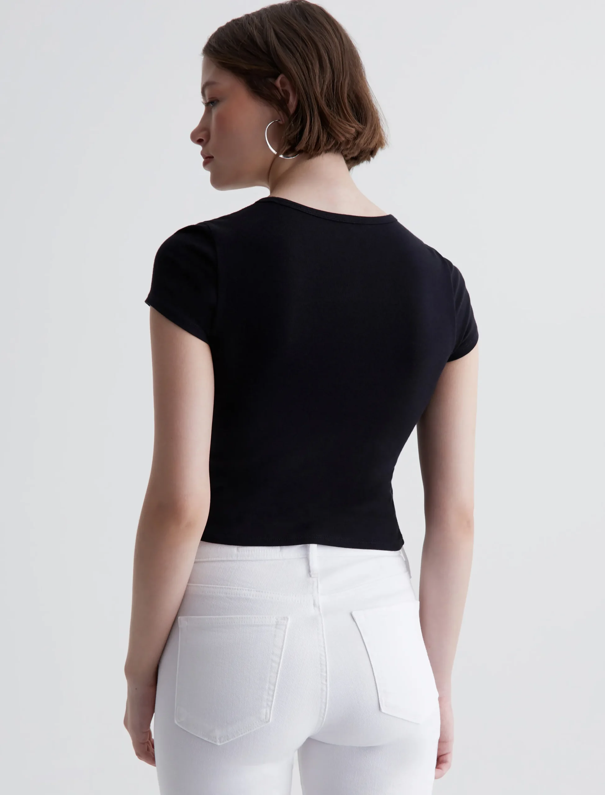 The Hutton Crew offers a throwback to ’70s style with its shrunken silhouette. Defined by a crew neckline and short sleeves, this baby tee fits close to the body and lands at the top of your high-waisted jeans. It’s soft and comfortable with the perfect amount of stretch in a black cotton-blend rib knit.