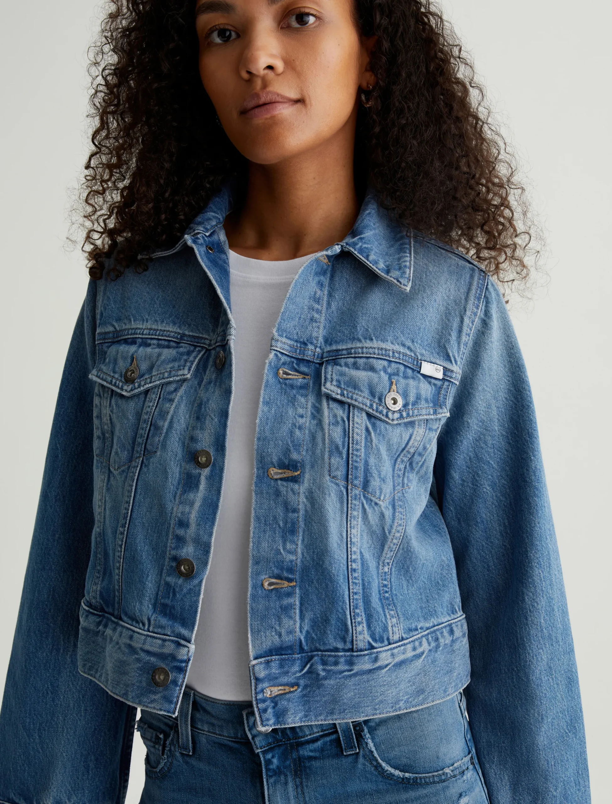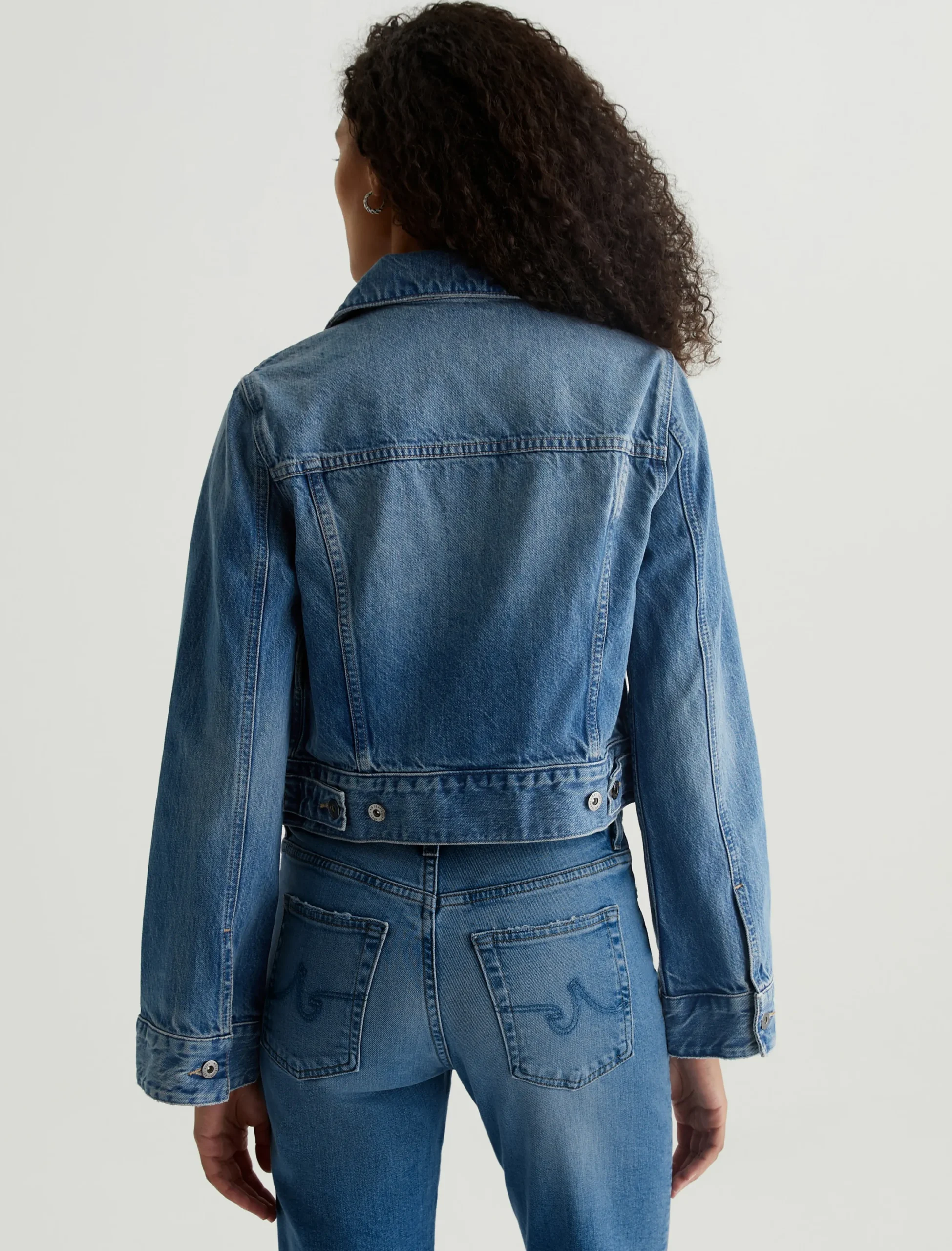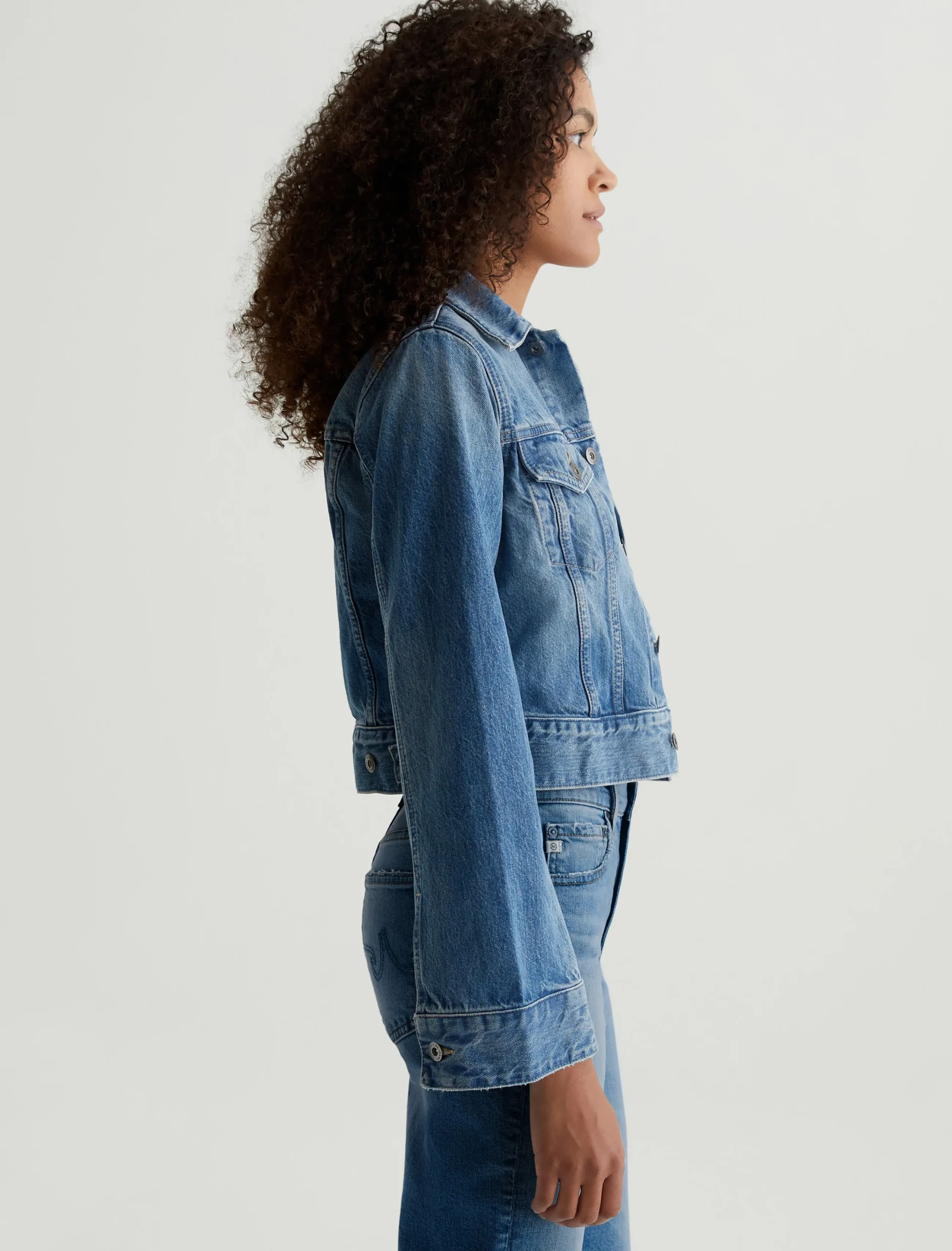 The Isa Jacket is a modern trucker cut for a straight, cropped fit with bell-shaped sleeves. Designed in hardy 13 oz. Sioux Rigid Denim in a medium indigo wash, this is the kind of piece that gets even better as it wears in. Classic details include flap pockets, front placket with metal hardware, and button tabs at the waistband.