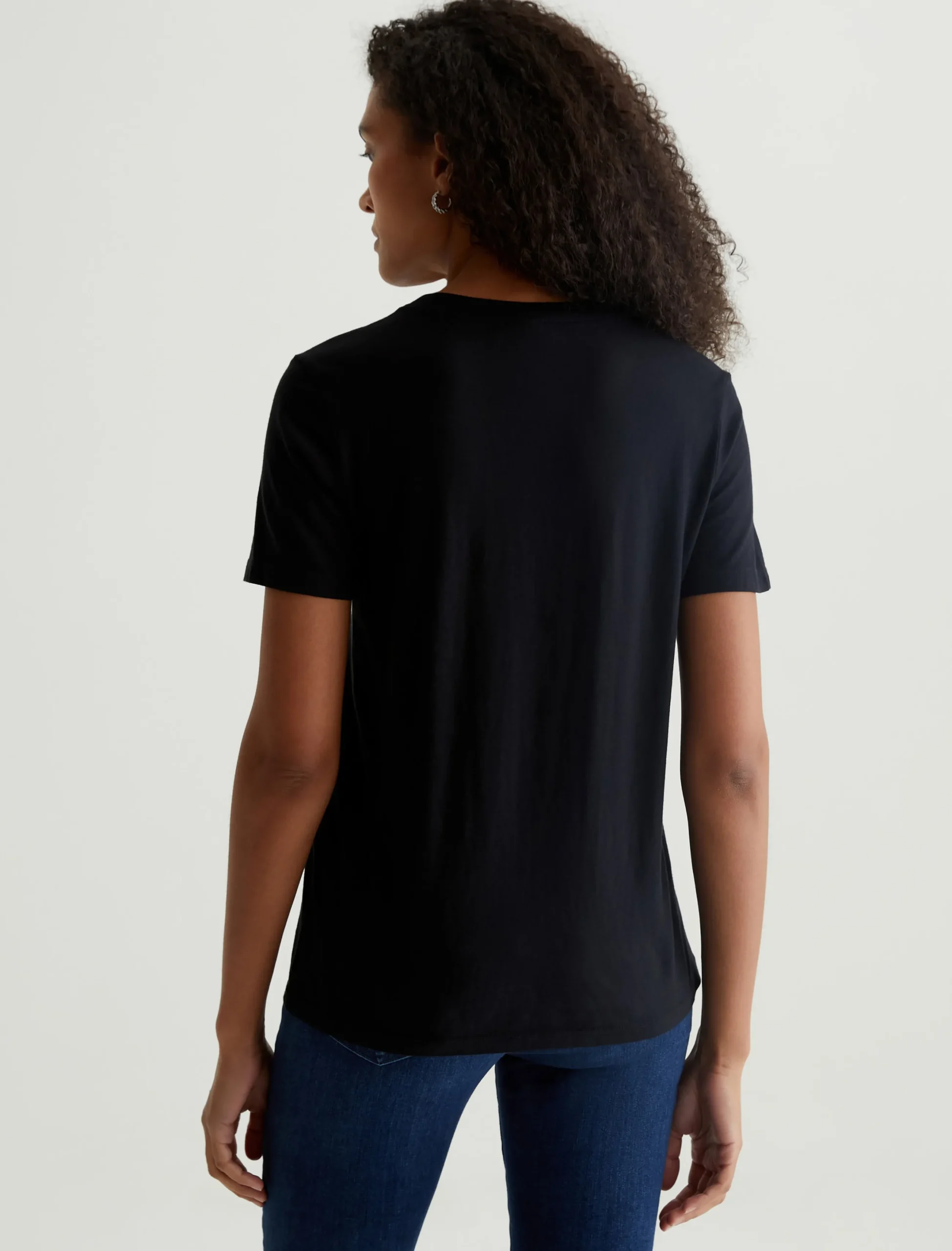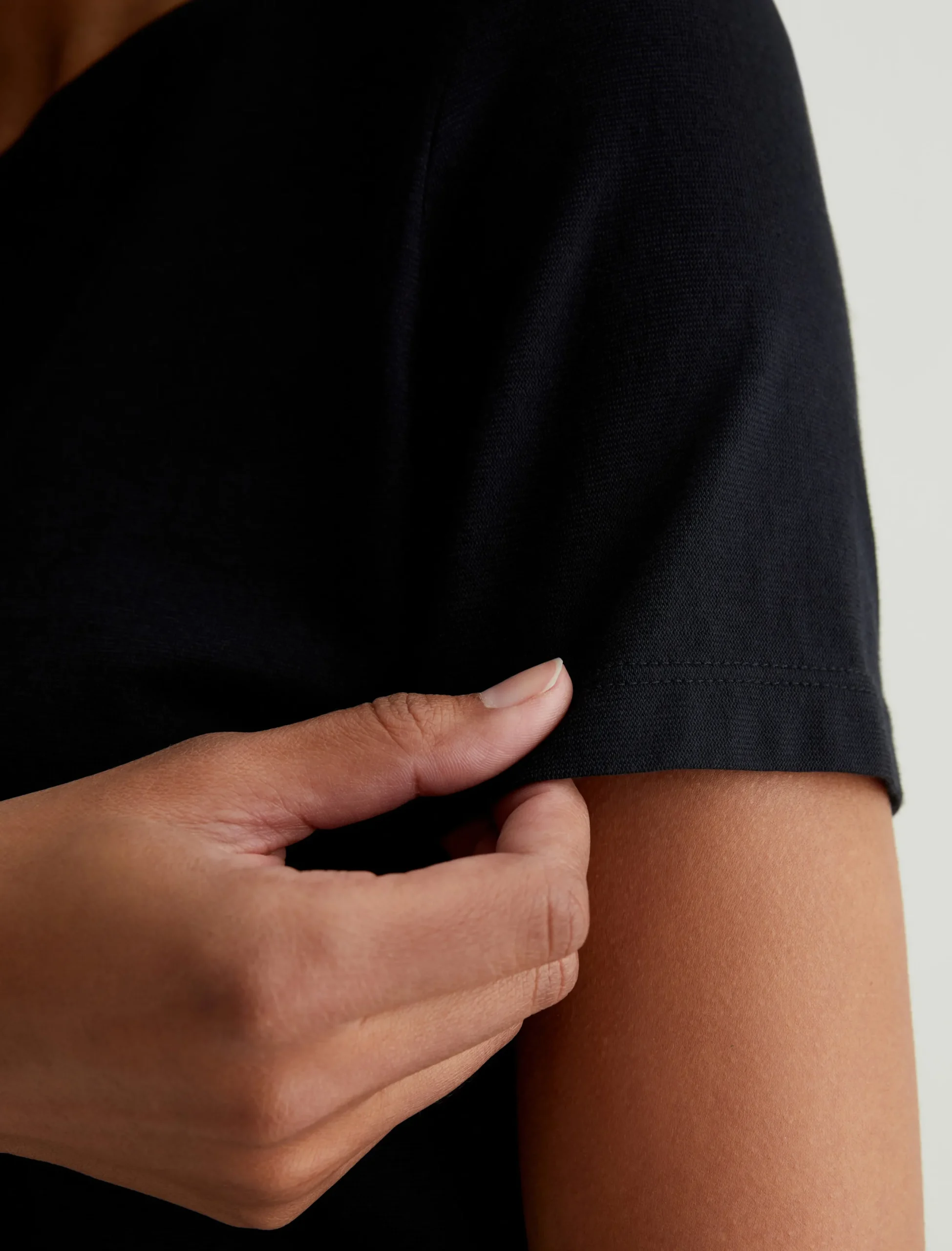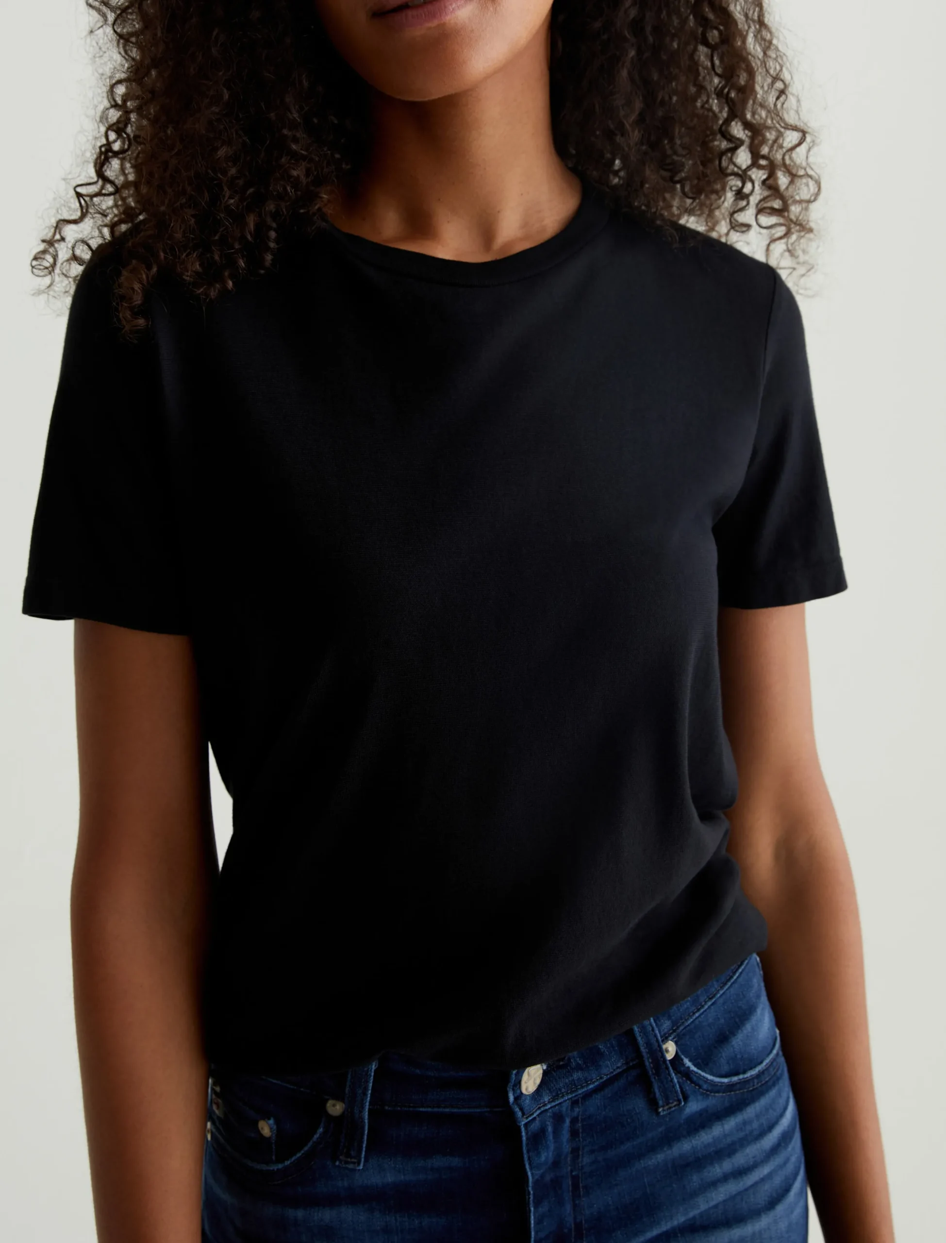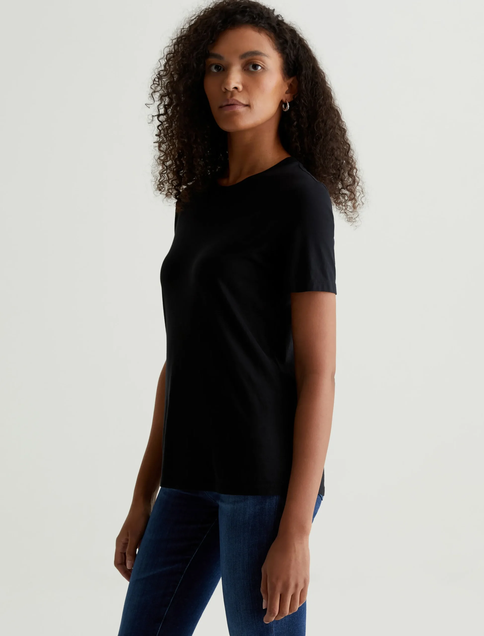 Our Jagger Crew Neck is the perfect short sleeve tee for your assortment of basic essentials. Featuring a deep black hue, this classic crew offers a 1X1 rib neckband. Seasonless, elevated, and luxurious—this fabrication and fit provides unique versatility in styling your everyday look. Our Jersey Knit offers a luxurious comfort that is unrivaled—knitted with both S-twist and Z-twist yarn to sustain longevity and stability, preventing unnecessary twisting and torquing. During the production process, the S-twist yarn is spun counter-clockwise creating a right-handed twill. The Z-twist yarn works in opposition, spinning clockwise for a left-handed twill. This opposition—when working together—yields a softer, more durable fabrication and gives strength to the yarn making it more difficult to pull apart. Designed in 100% Cotton.