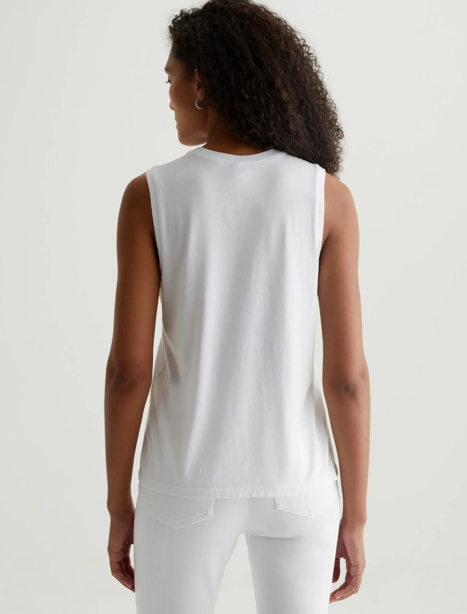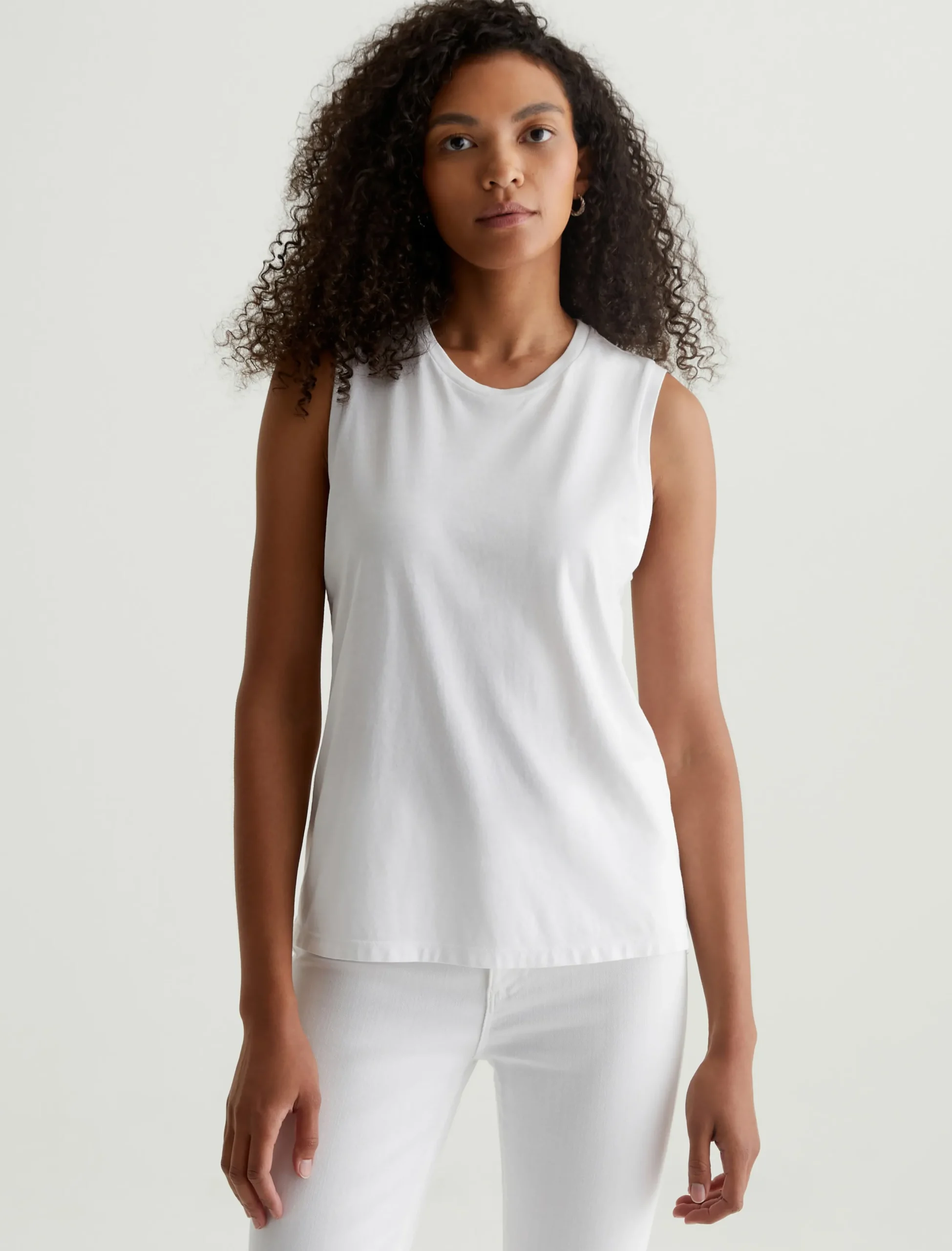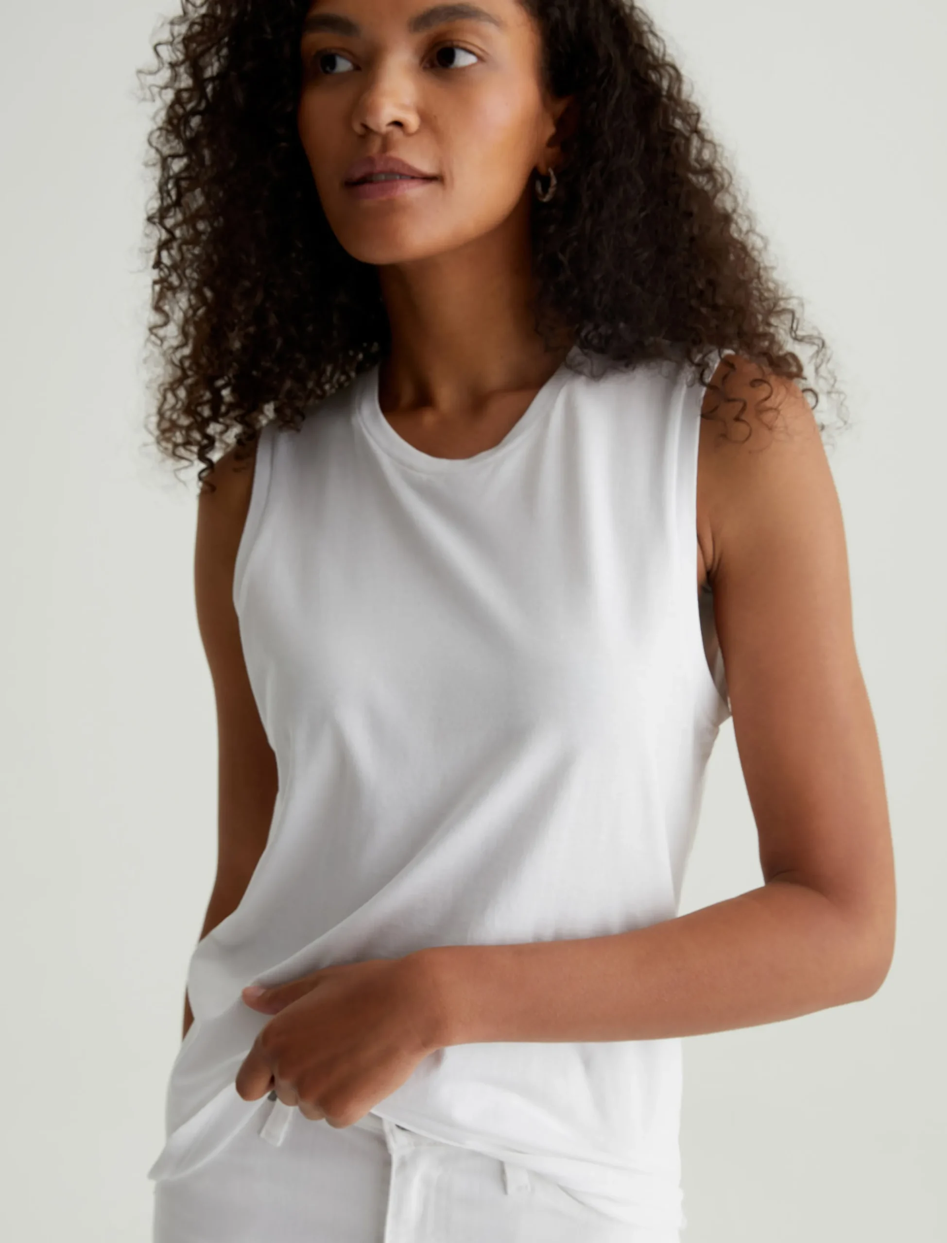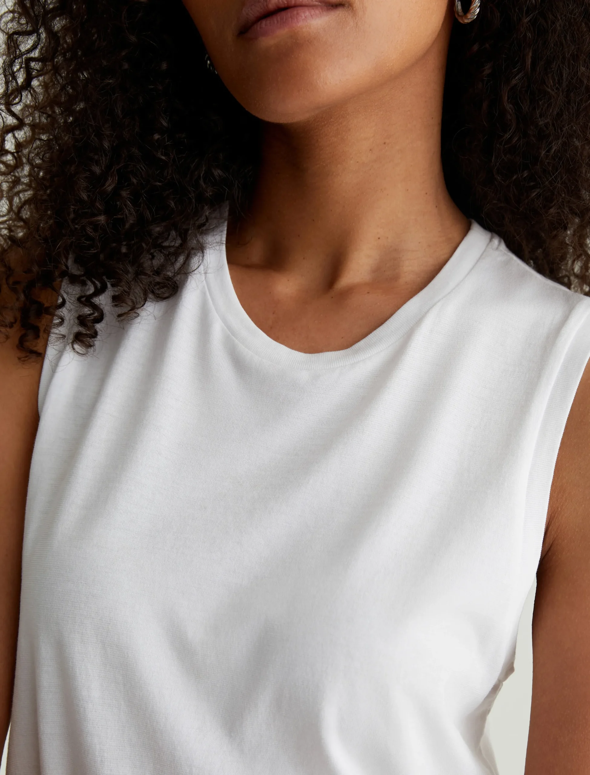 Our Jagger Muscle Tank in white is the perfect sleeveless muscle tank for all year round, cut with a higher arm hole to be worn alone or under jackets and blazers. The 1X1 rib neckband makes this a classic—yet it still feels modern, casual, and cool in its silhouette. Our Jersey Knit offers a luxurious comfort that is unrivaled—knitted with both S-twist and Z-twist yarn to sustain longevity and stability, preventing unnecessary twisting and torquing. During the production process, the S-twist yarn is spun counter-clockwise creating a right-handed twill. The Z-twist yarn works in opposition, spinning clockwise for a left-handed twill. This opposition—when working together—yields a softer, more durable fabrication and gives strength to the yarn making it more difficult to pull apart. Designed in 100% Cotton