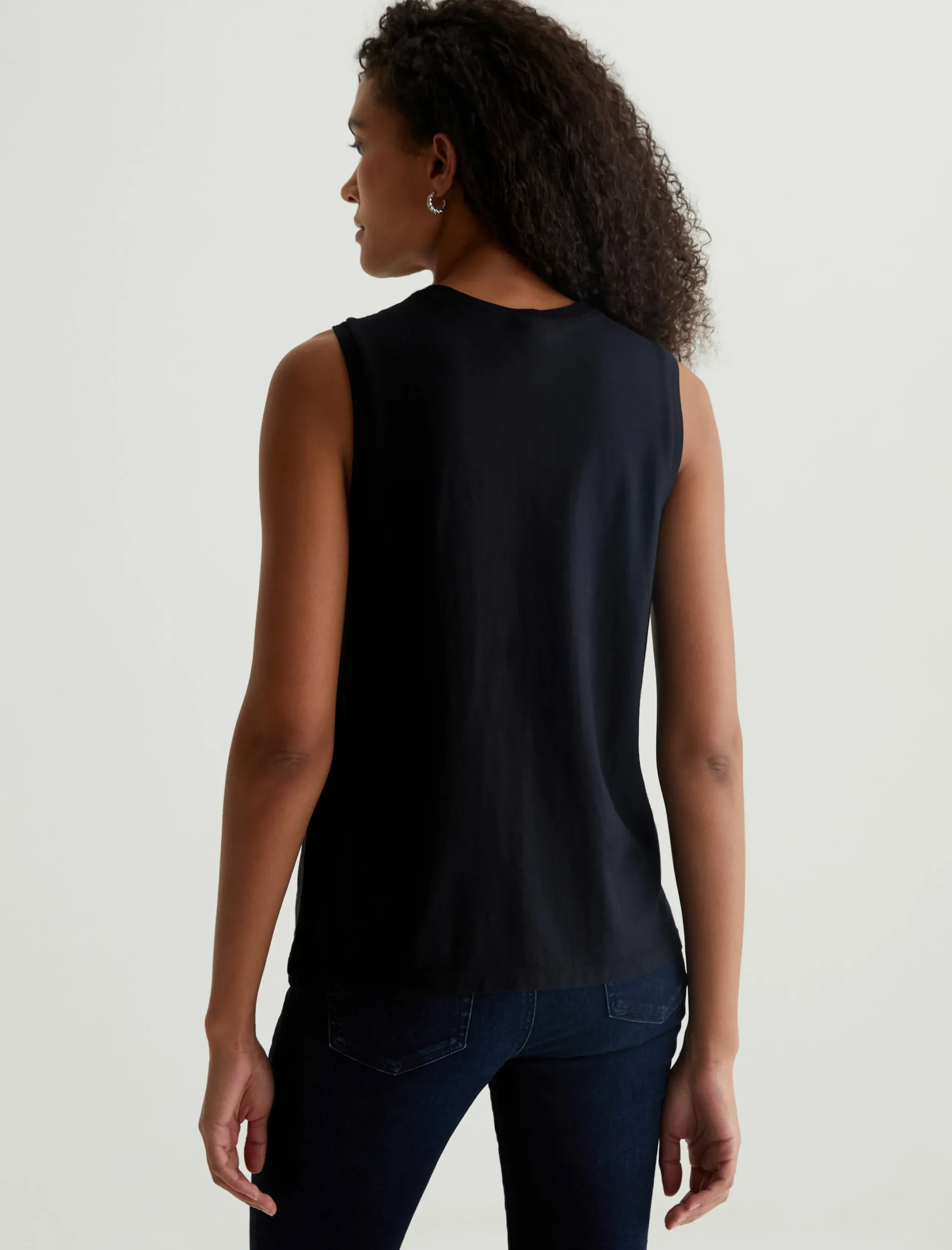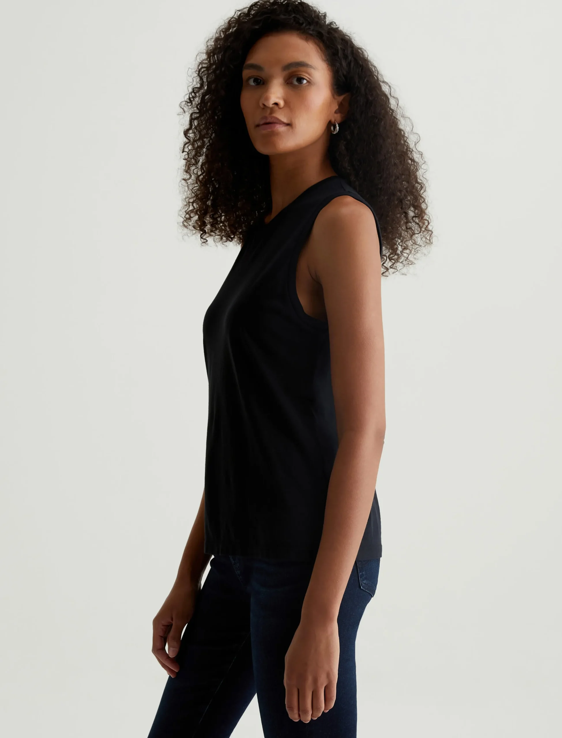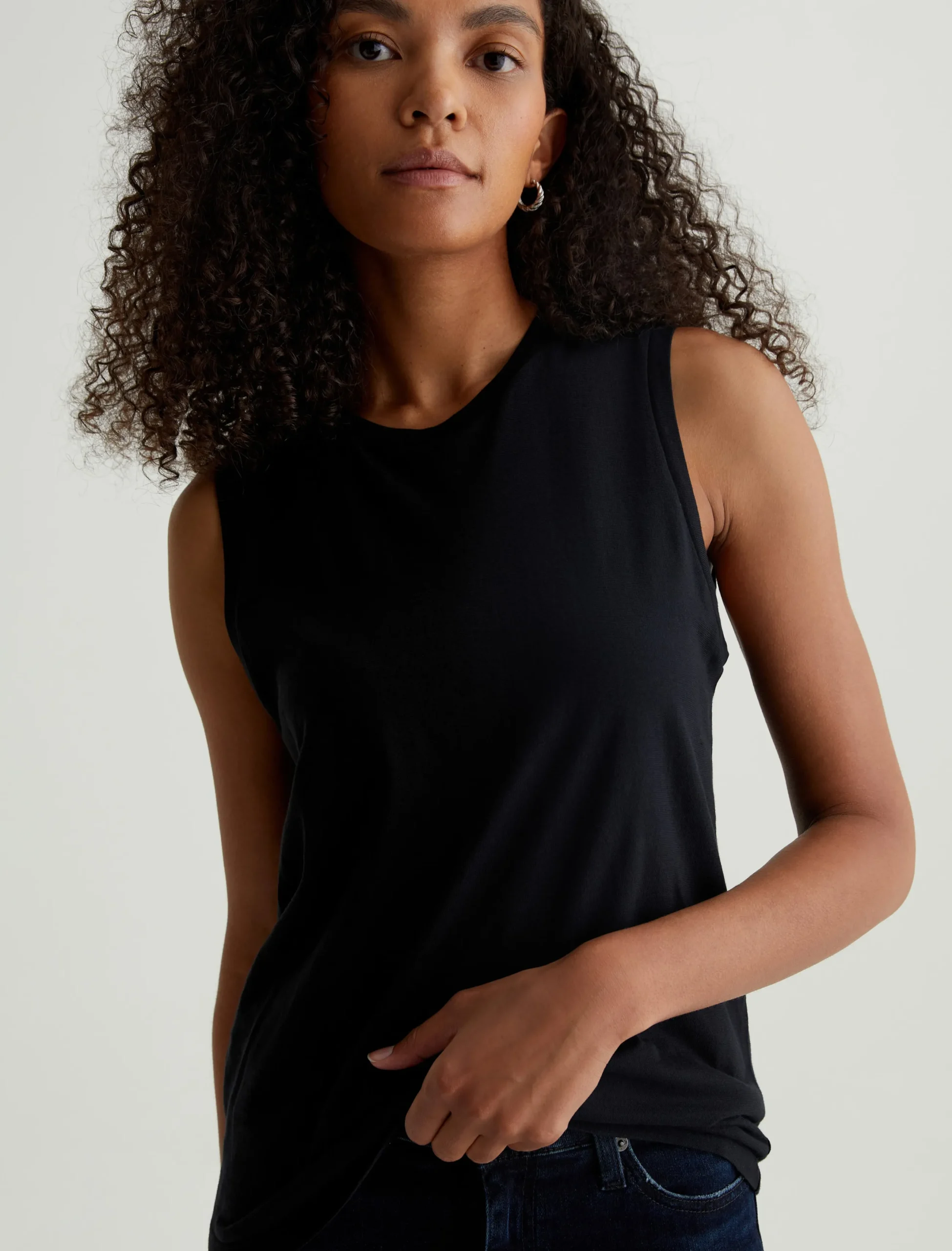 Our Jagger Muscle Tank in black is the perfect sleeveless muscle tank for all year round, cut with a higher arm hole to be worn alone or under jackets and blazers. The 1X1 rib neckband makes this a classic—yet it still feels modern, casual, and cool in its silhouette. Our Jersey Knit offers a luxurious comfort that is unrivaled—knitted with both S-twist and Z-twist yarn to sustain longevity and stability, preventing unnecessary twisting and torquing. During the production process, the S-twist yarn is spun counter-clockwise creating a right-handed twill. The Z-twist yarn works in opposition, spinning clockwise for a left-handed twill. This opposition—when working together—yields a softer, more durable fabrication and gives strength to the yarn making it more difficult to pull apart. Designed in 100% Cotton