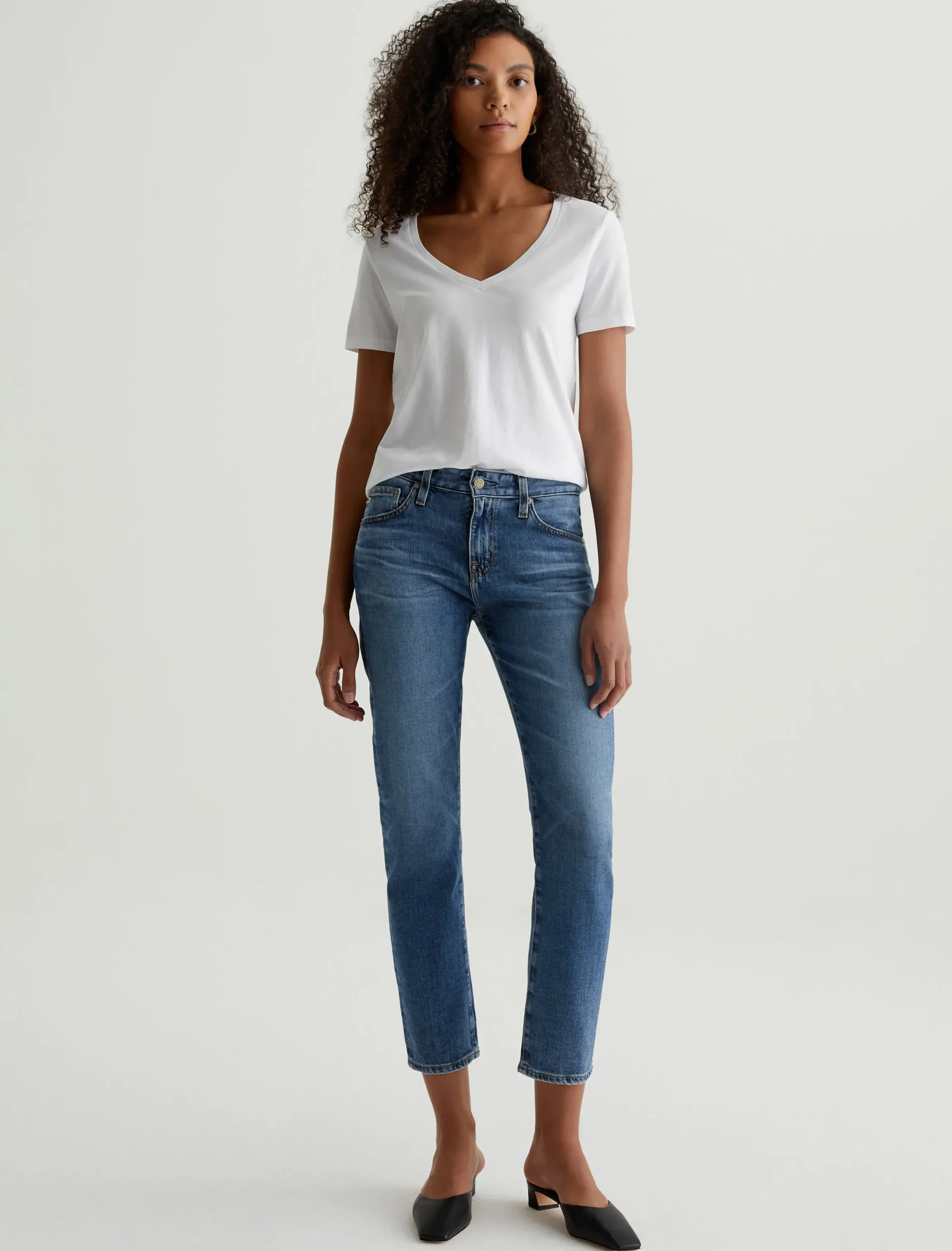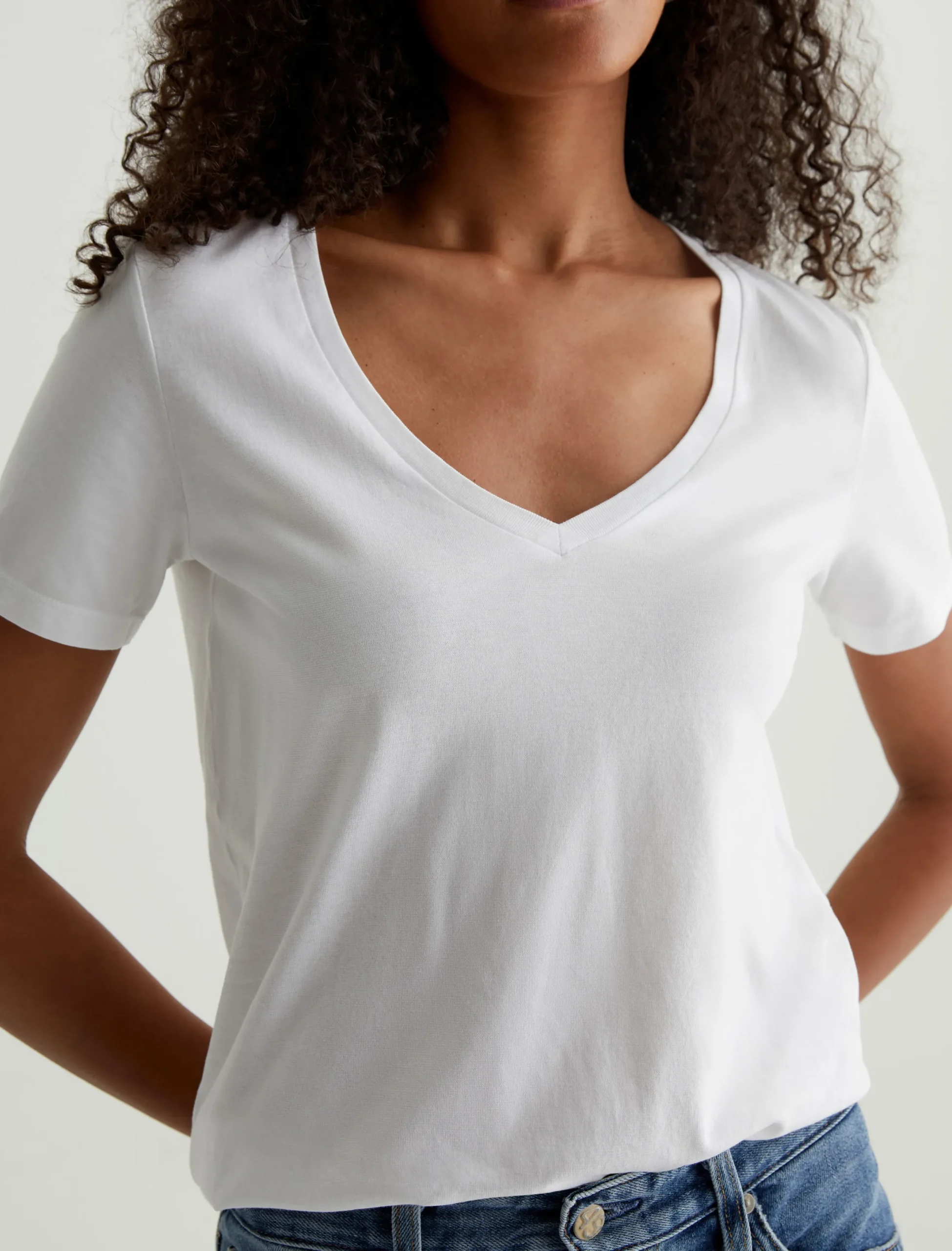 The Jagger V-Neck tee in white is a classic, added to our Basic Essentials collection to offer effortless styling options for your wardrobe. The thinner rib neckband gives imparts a modern feel to a classic neckline. Our Jersey Knit offers a luxurious comfort that is unrivaled—knitted with both S-twist and Z-twist yarn to sustain longevity and stability, preventing unnecessary twisting and torquing. During the production process, the S-twist yarn is spun counter-clockwise creating a right-handed twill. The Z-twist yarn works in opposition, spinning clockwise for a left-handed twill. This opposition—when working together—yields a softer, more durable fabrication and gives strength to the yarn making it more difficult to pull apart. Designed in 100% Cotton.