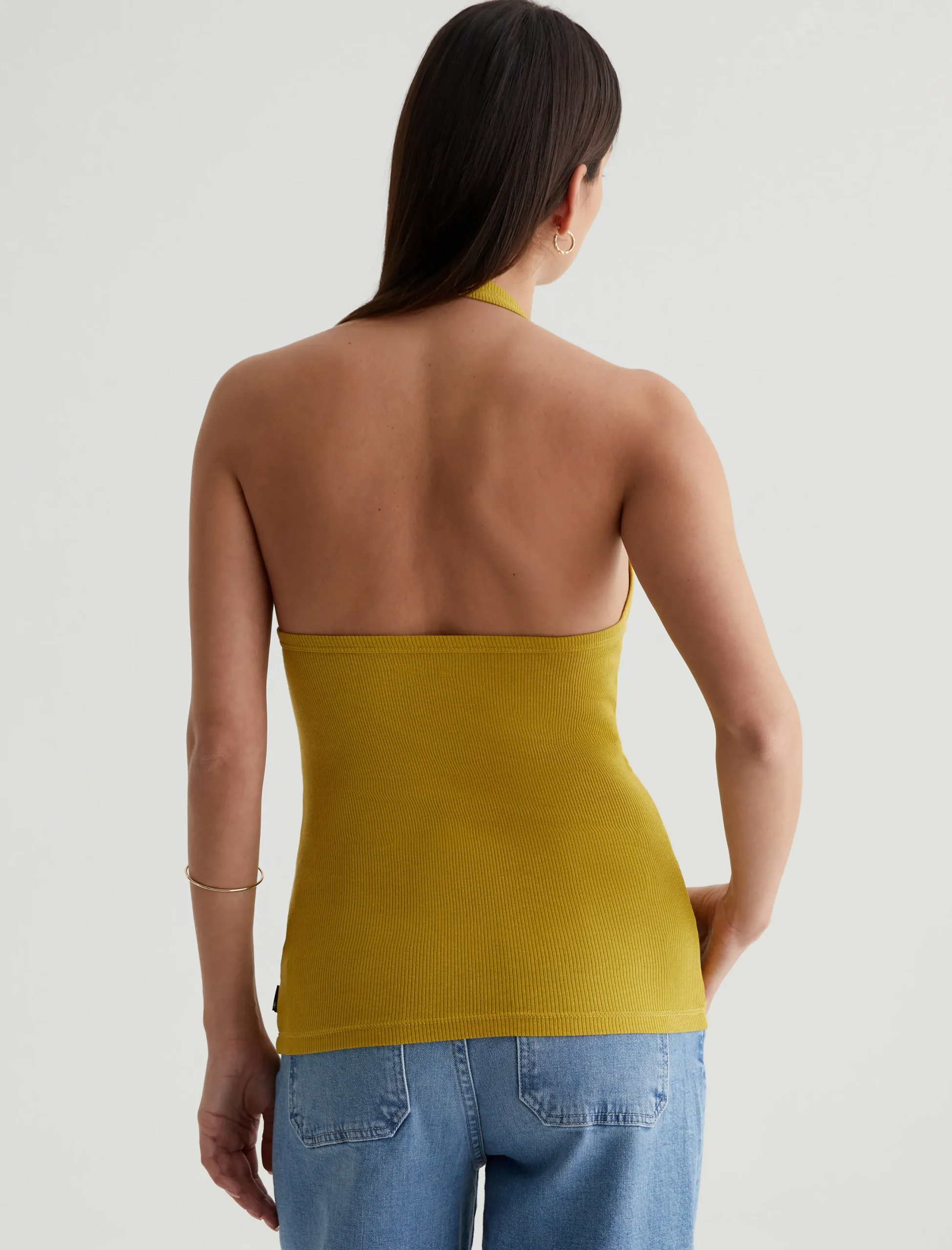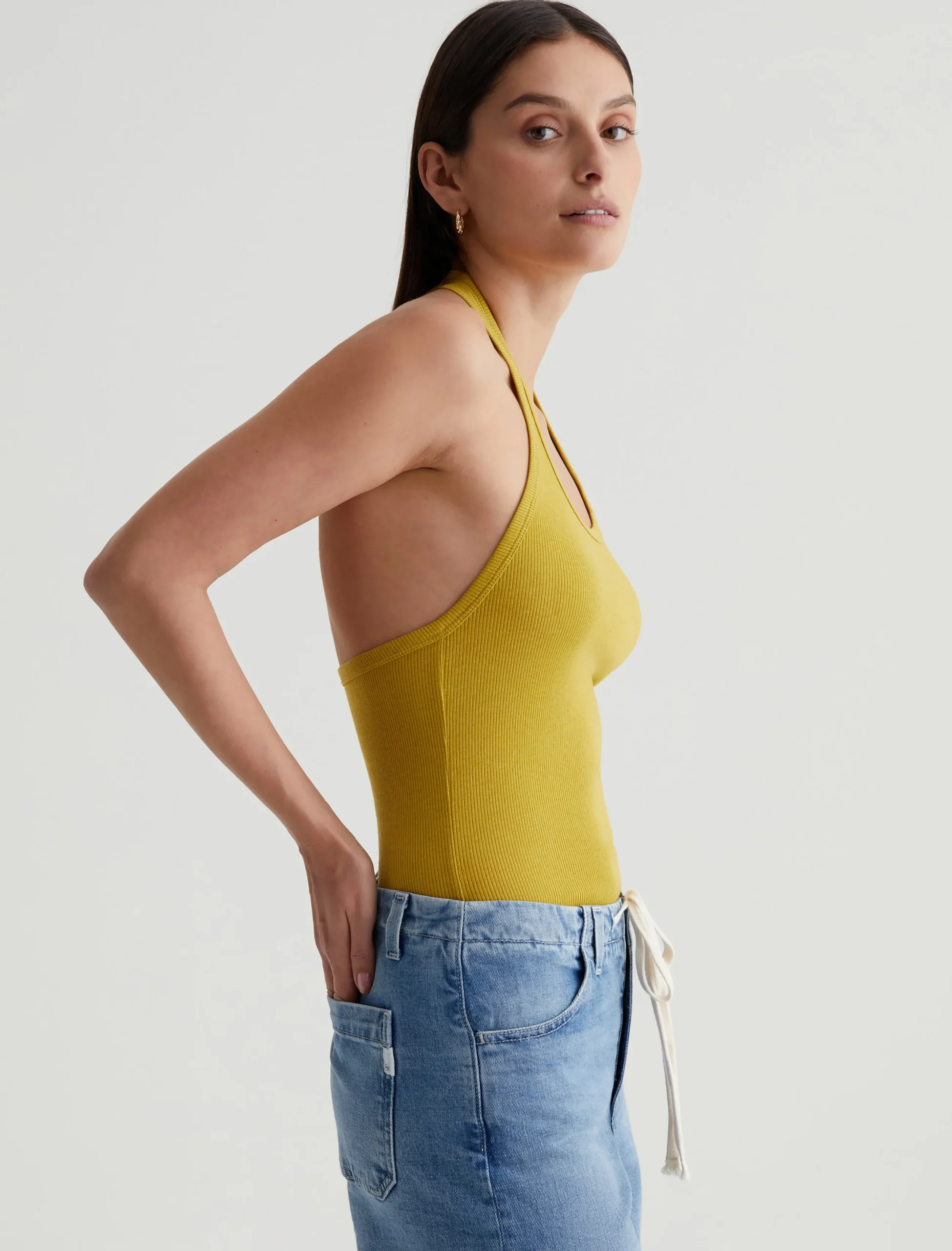 The Jay tank is a slim-fit halter top with an open back. Featuring a attention-grabbing yellow-green shade, it’s designed in a soft, cotton-blend stretch rib knit that clings to the figure.