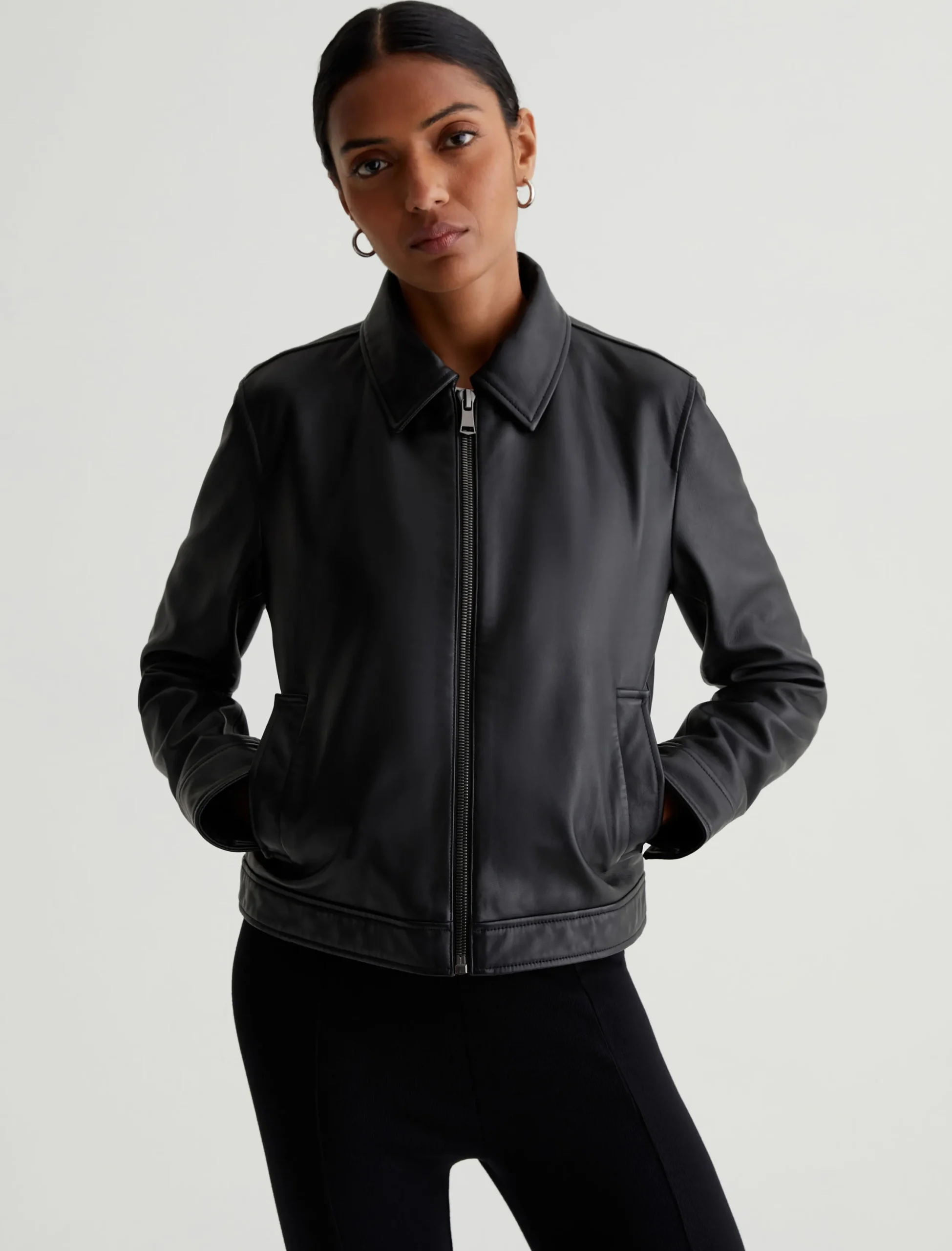 Designed in supple black lambskin leather, our Jayen Jacket is a classic bomber style that you’ll wear now and years from now. It’s got a slightly shrunken silhouette with a pointed collar, zip placket, and welt pockets at the front. Snap cuffs finish the look.
