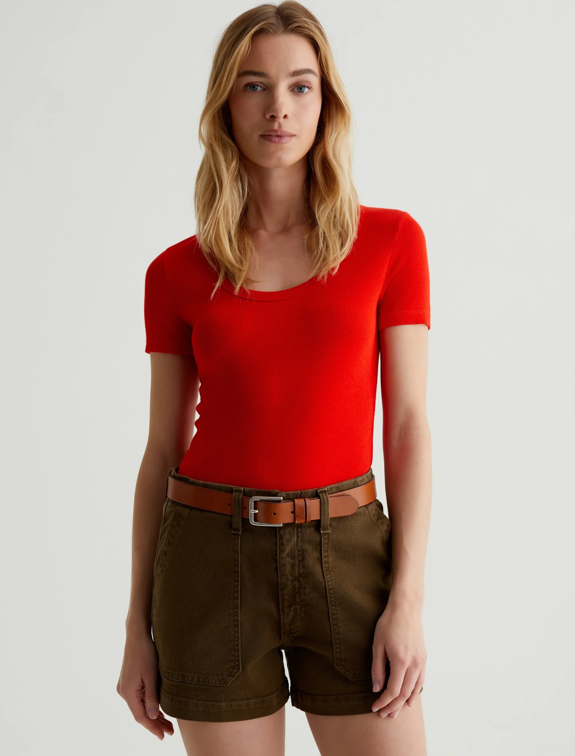 The Jessie Top in red adds a punch of color to any ensemble. Cut from a soft stretch-blend rib knit, this short-sleeve T-shirt has a slim, body-tracing fit and a scoop neckline with thick binding. Perfect for layering, it’s an effortless way to elevate your everyday wardrobe.