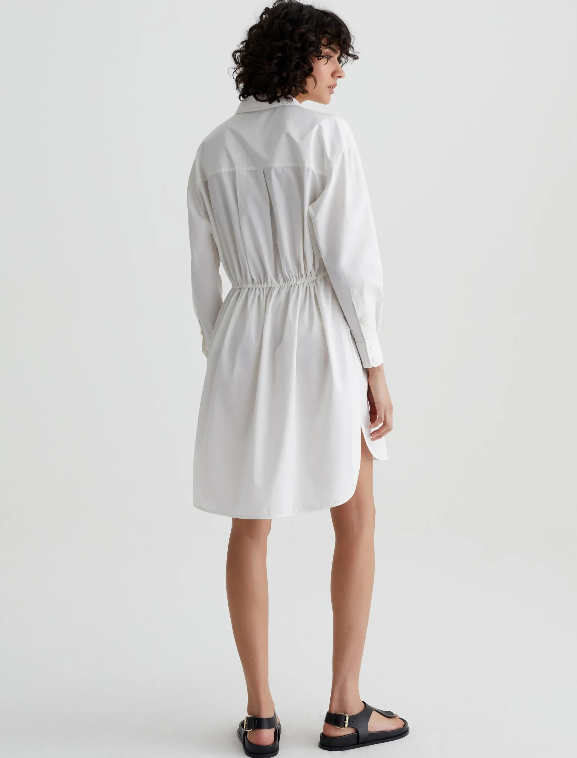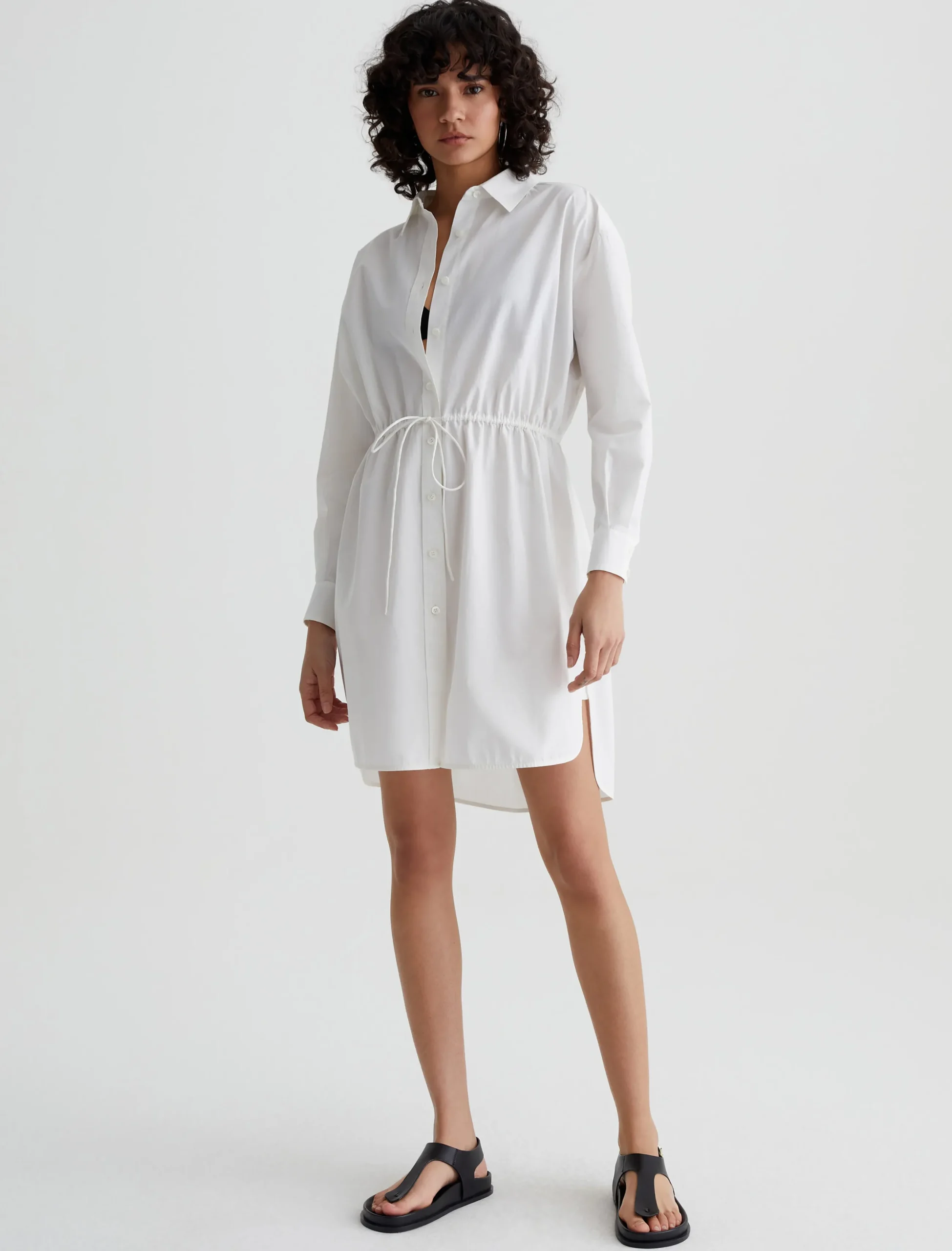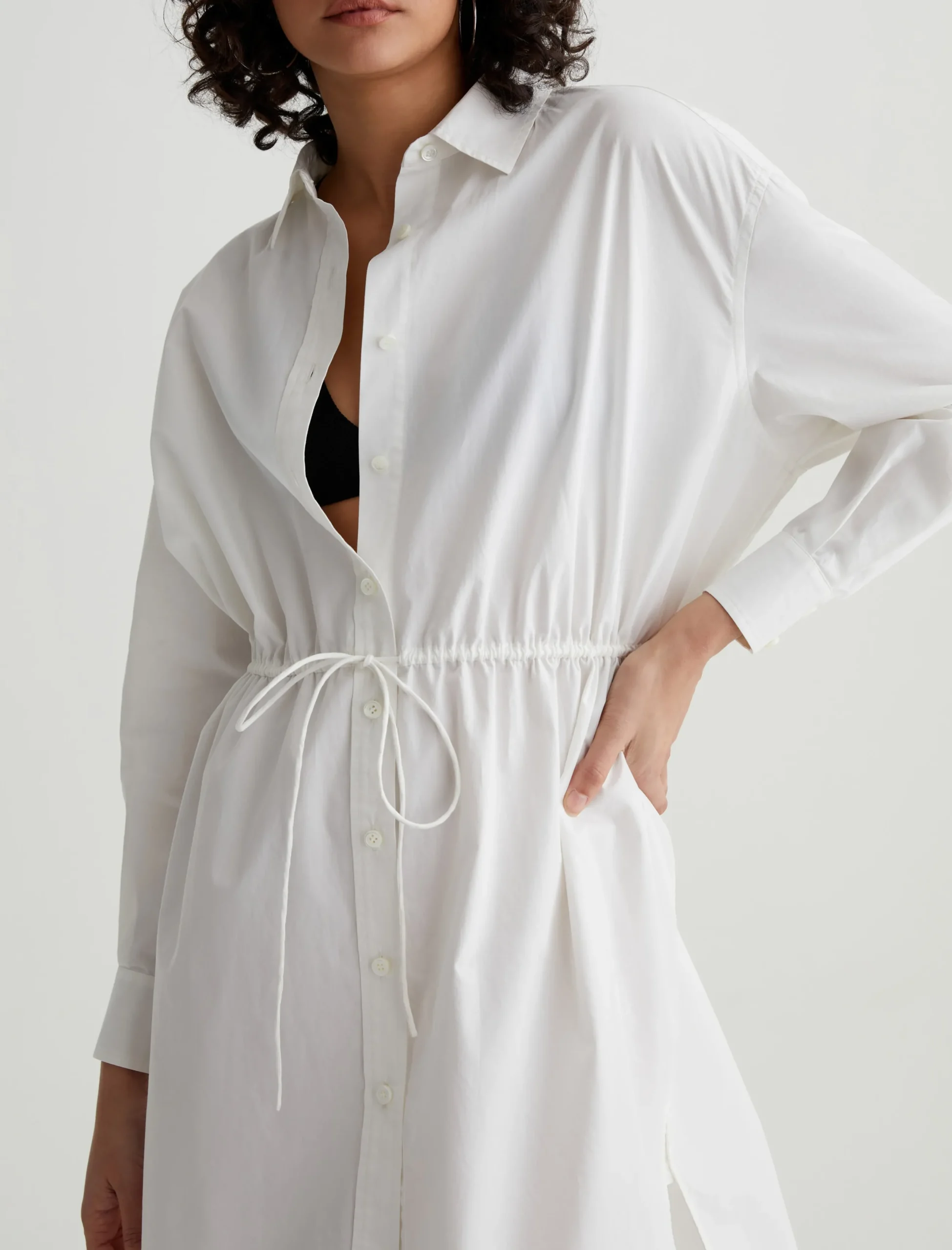 The Jolie Shirt Dress in white has a relaxed fit with pleated long sleeves, a button-up front placket, and a dainty drawstring that lets you adjust the shape. Made from 100% cotton poplin, it’s got a crisp, cool feel and a refined look.