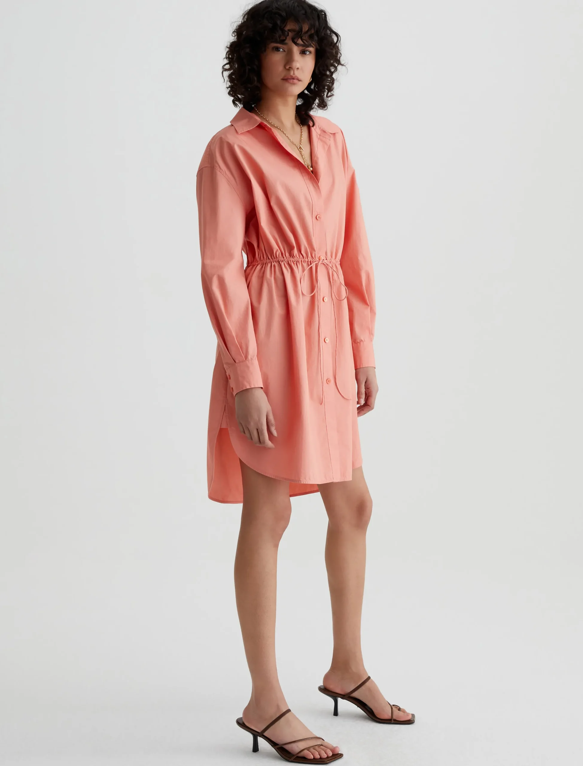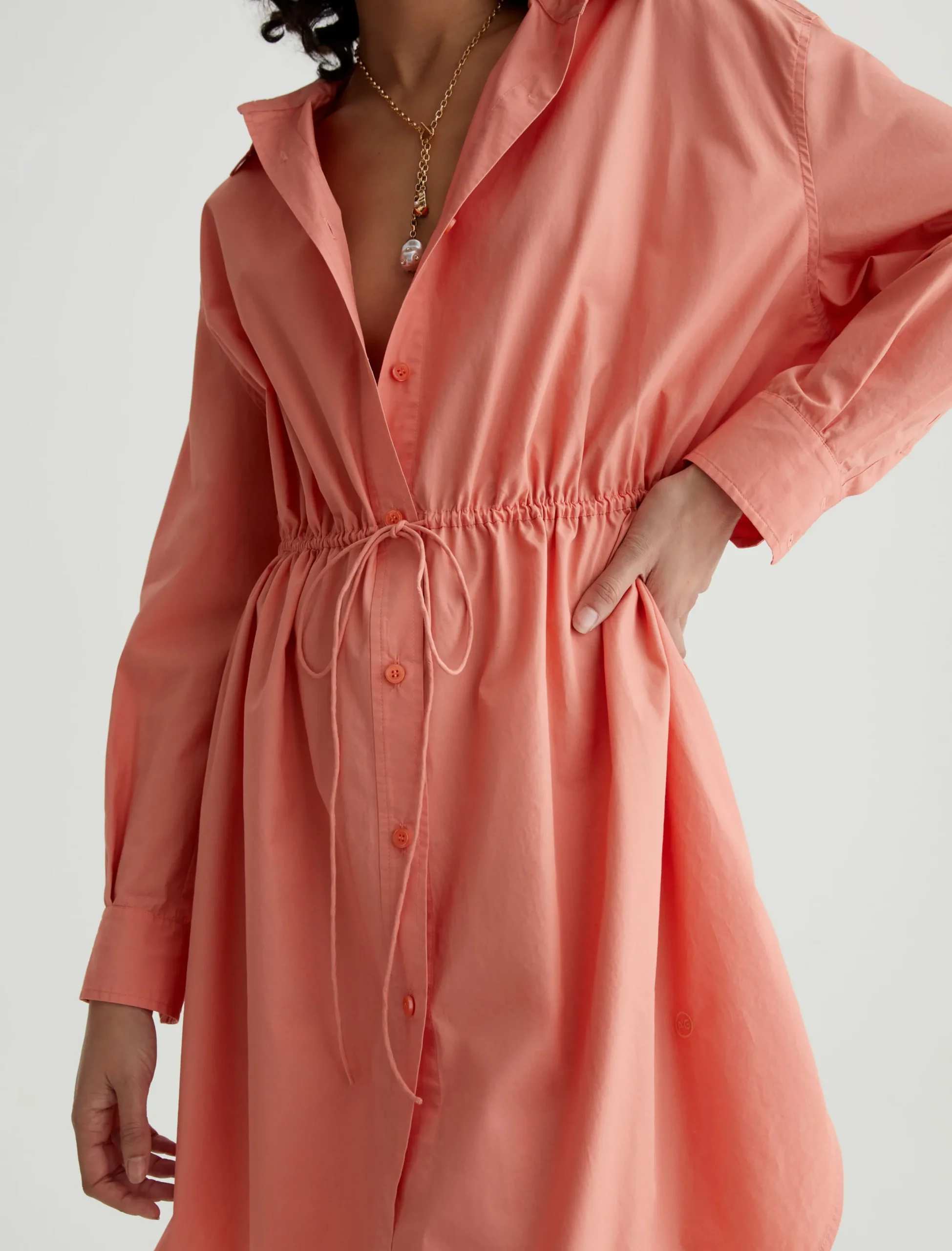The Jolie Shirt Dress in Pink Peach has a relaxed fit with pleated long sleeves, a button-up front placket, and a dainty drawstring that lets you adjust the shape. Made from 100% cotton poplin, it’s got a crisp, cool feel and a refined look.