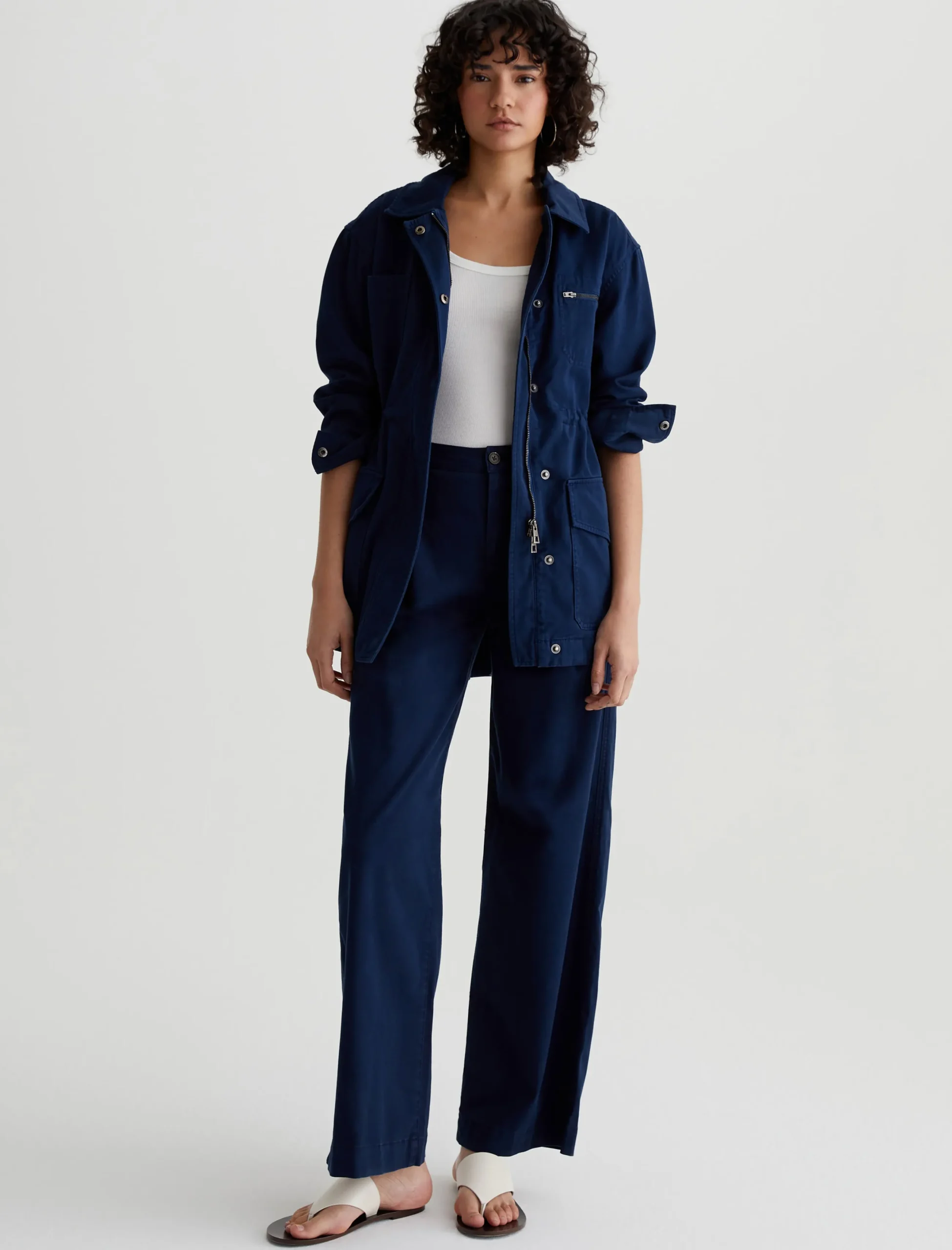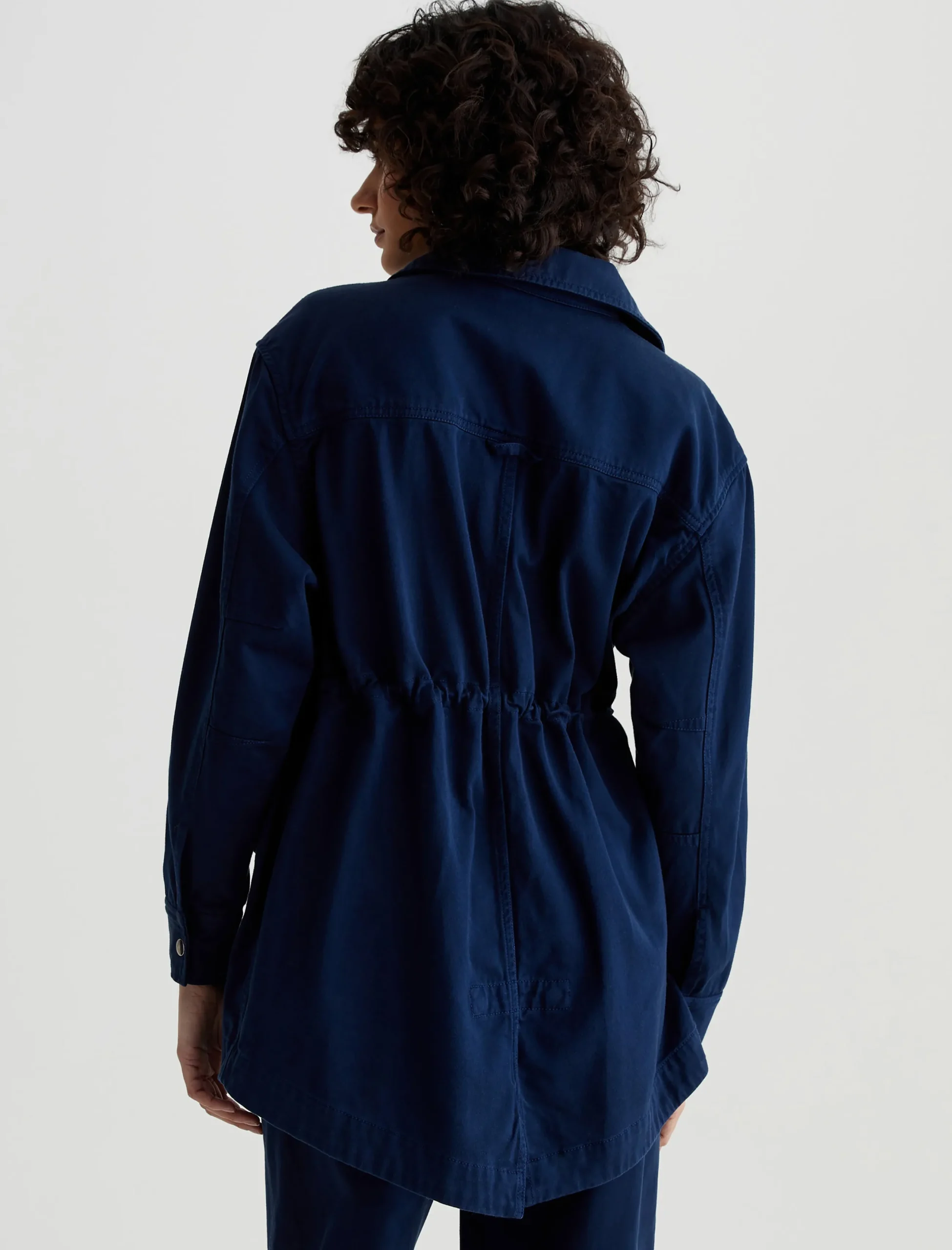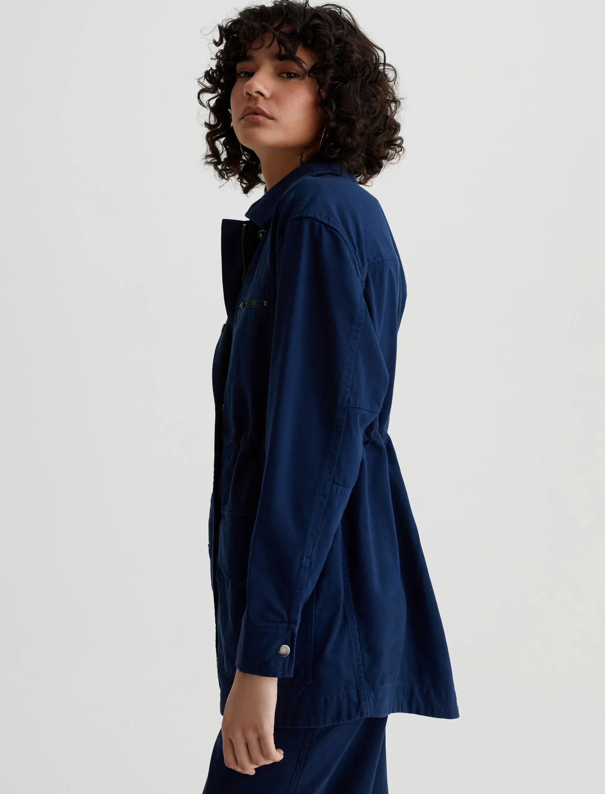 The Josephine Jacket offers a modern interpretation on classic utility styling. Cut from 100% cotton sateen in a deep navy shade, it’s cut for a relaxed fit and shaped by an adjustable interior drawcord. Complete with patch pockets, exposed zipper detailing, and a zip front concealed by a storm placket with metal snaps.