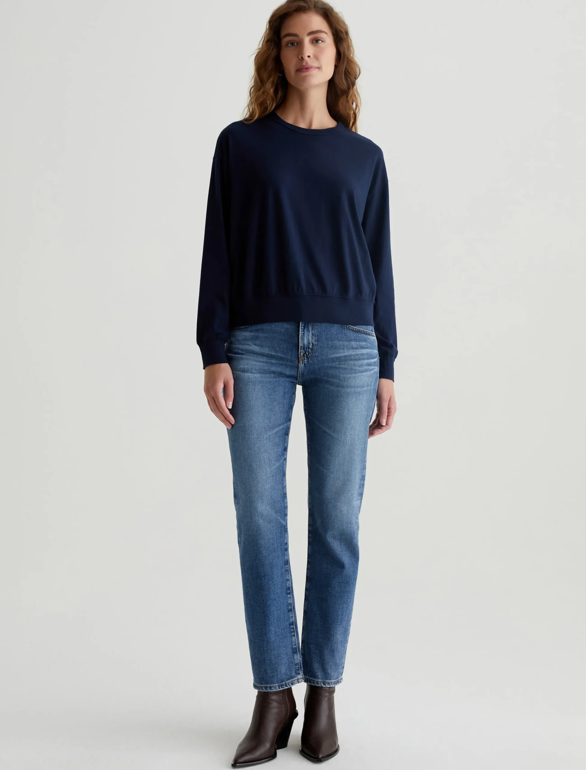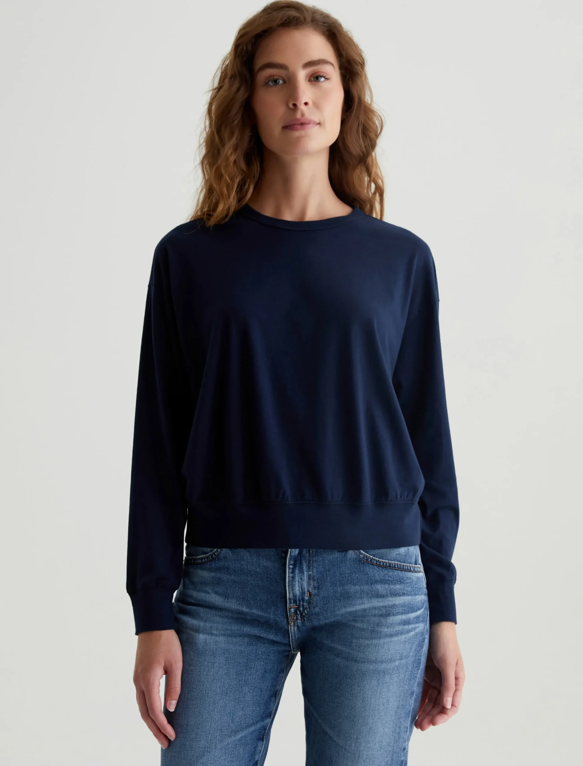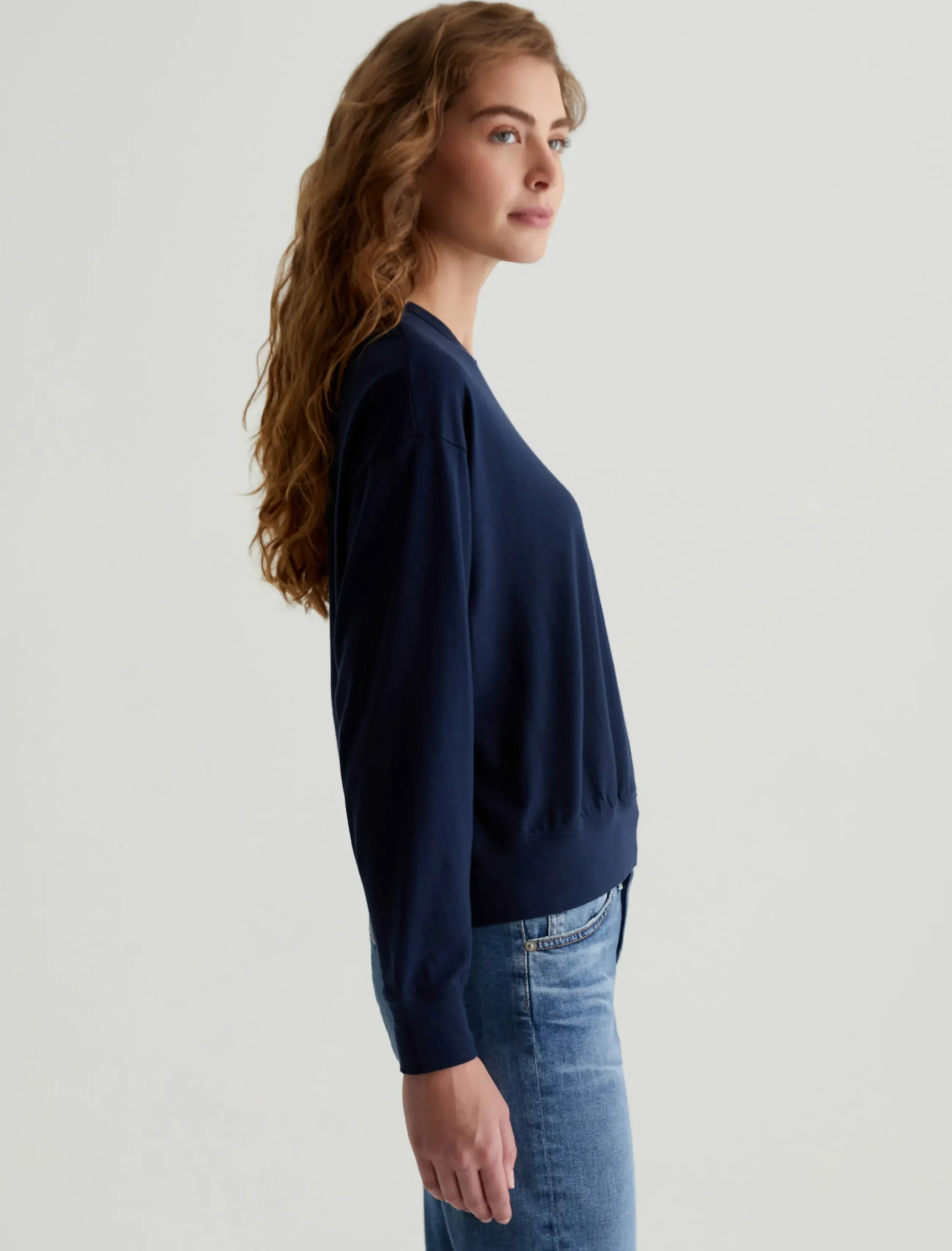 The Karter Pullover in deep navy is a new silhouette in our Basic Essentials collection. We borrowed the details of a sweatshirt including the rib binding, cuff, and bottom hem to make a great lightweight pullover. Our Jersey Knit offers a luxurious comfort that is unrivaled—knitted with both S-twist and Z-twist yarn to sustain longevity and stability, preventing unnecessary twisting and torquing. During the production process, the S-twist yarn is spun counter-clockwise creating a right-handed twill. The Z-twist yarn works in opposition, spinning clockwise for a left-handed twill. This opposition—when working together—yields a softer, more durable fabrication and gives strength to the yarn making it more difficult to pull apart. Designed in 100% Cotton.