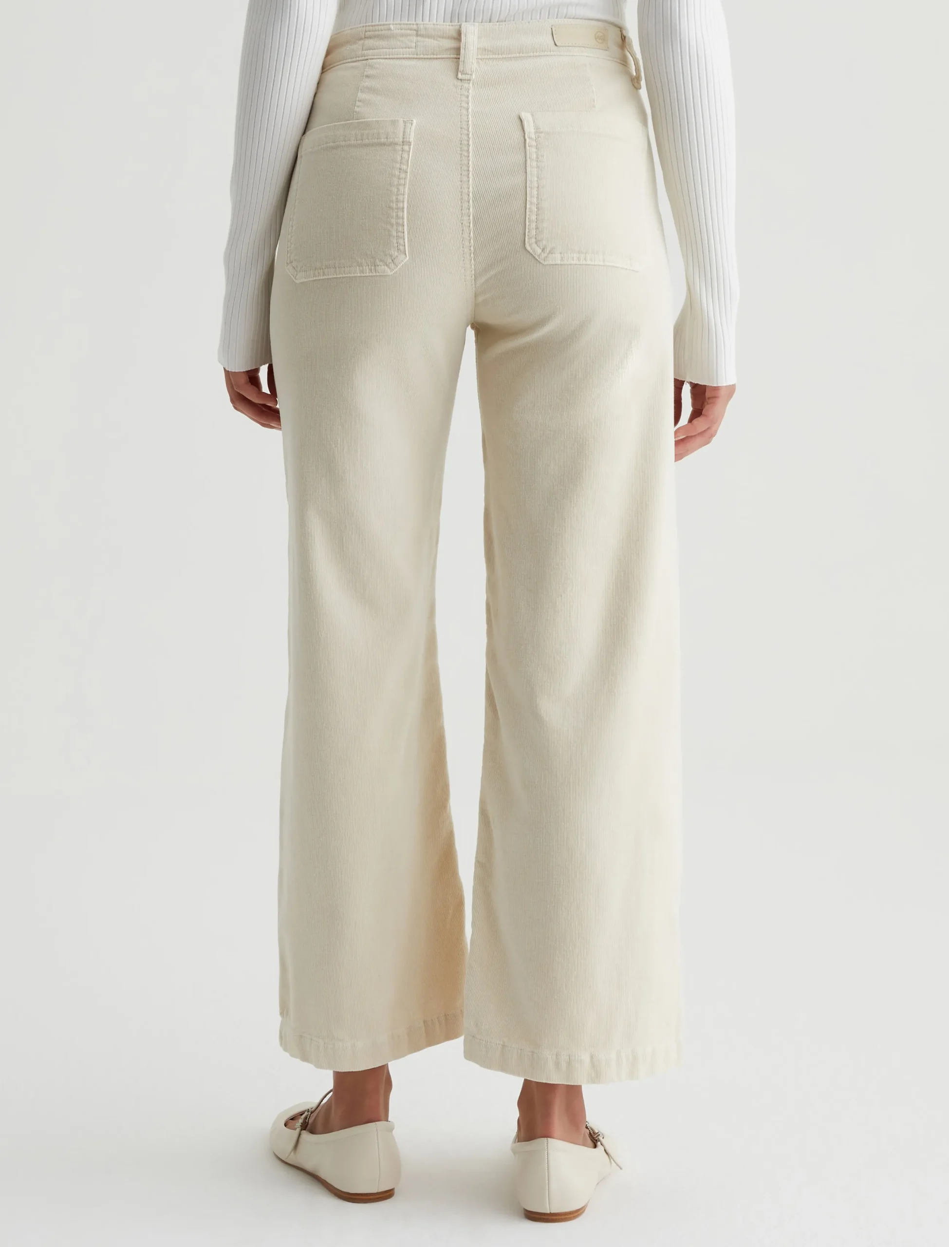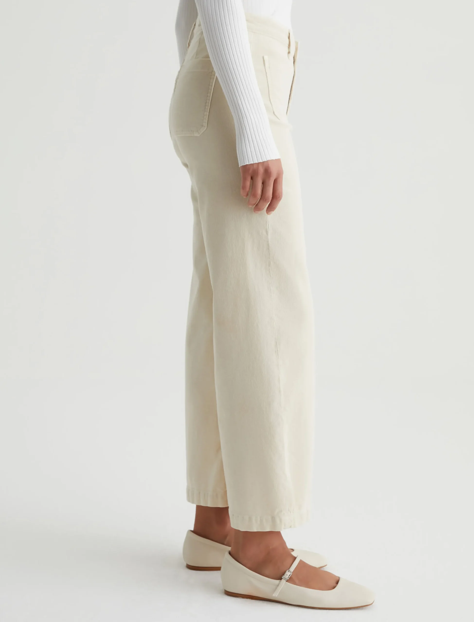 Kassie is a high-rise wide leg crop with utility-inspired patch pockets. This pair has a soft, velvety feel in a sulfur-dyed cream color.