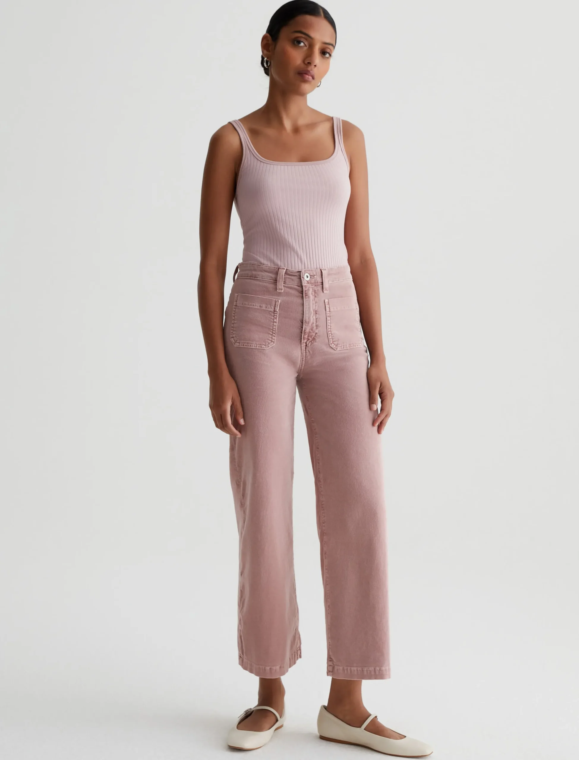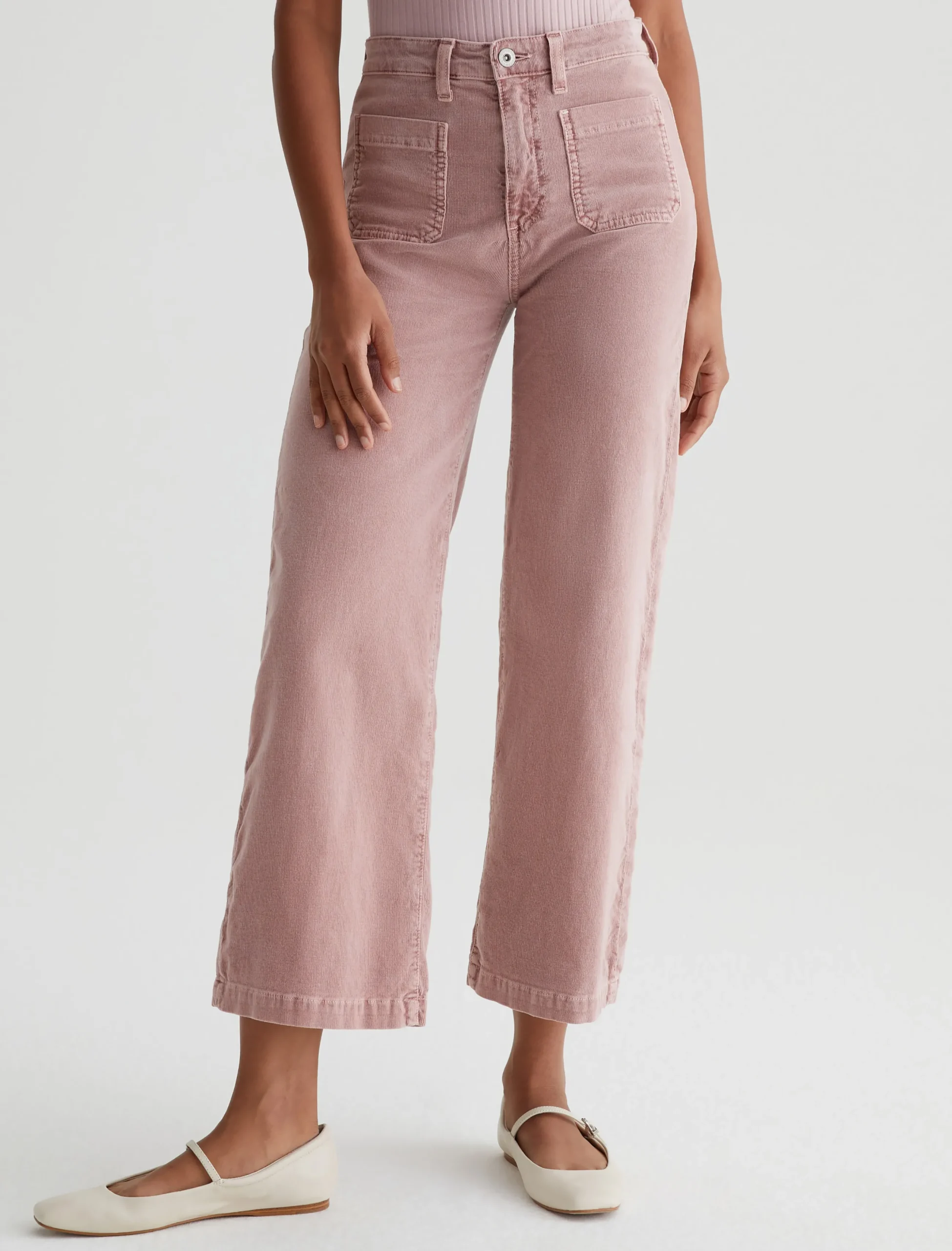 Kassie is a high-rise wide leg crop with utility-inspired patch pockets. This pair has a soft, velvety feel in blush-pink corduroy.
