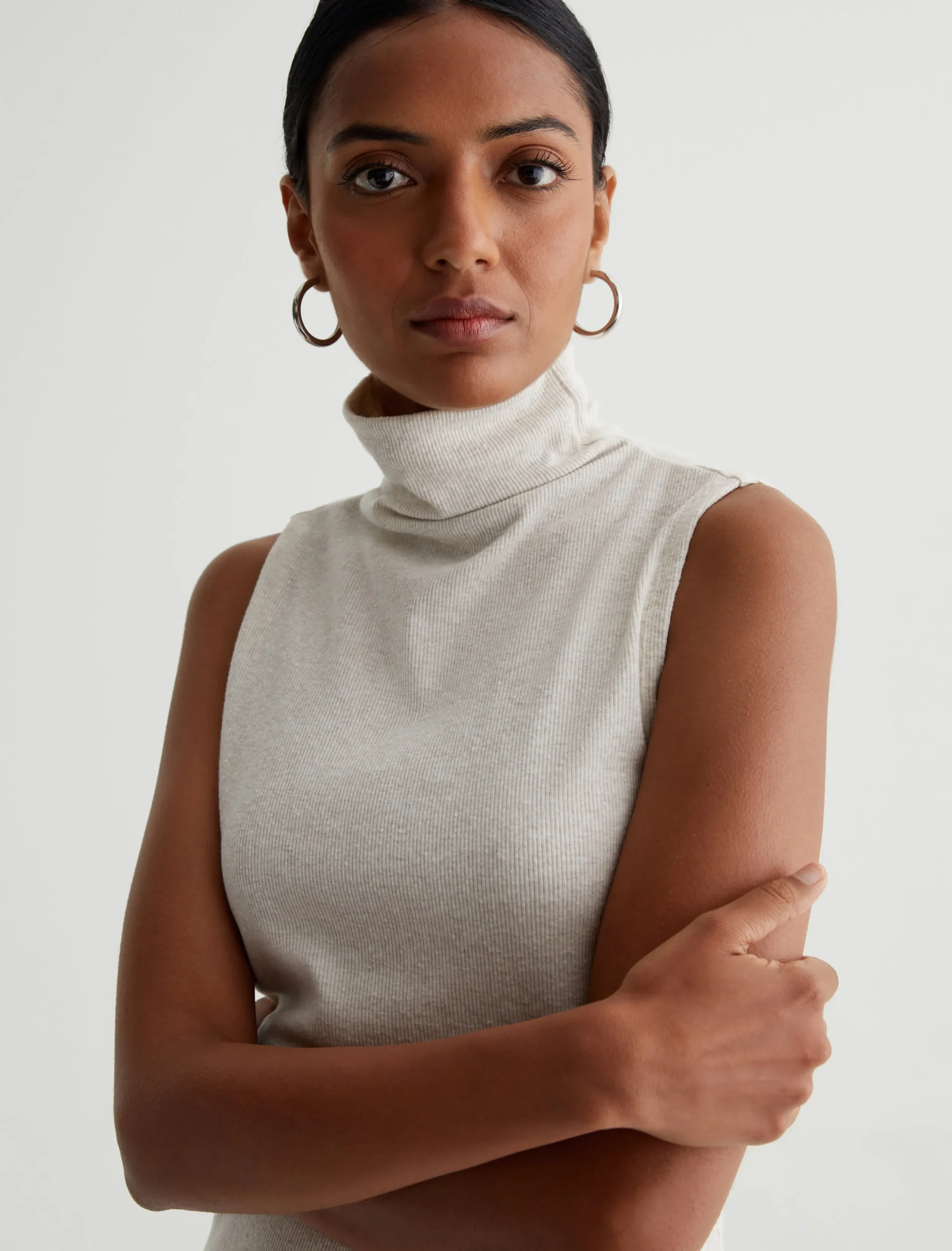 Crafted from a mélange rib knit in heathered off-white, our Kizza Dress has a sleeveless turtleneck silhouette with an alluring side slit. The minimalist style fits comfortably close to the body and falls to a shin-skimming hem. A simple, flattering style to wear with sneakers or dress up with a pair of heels.