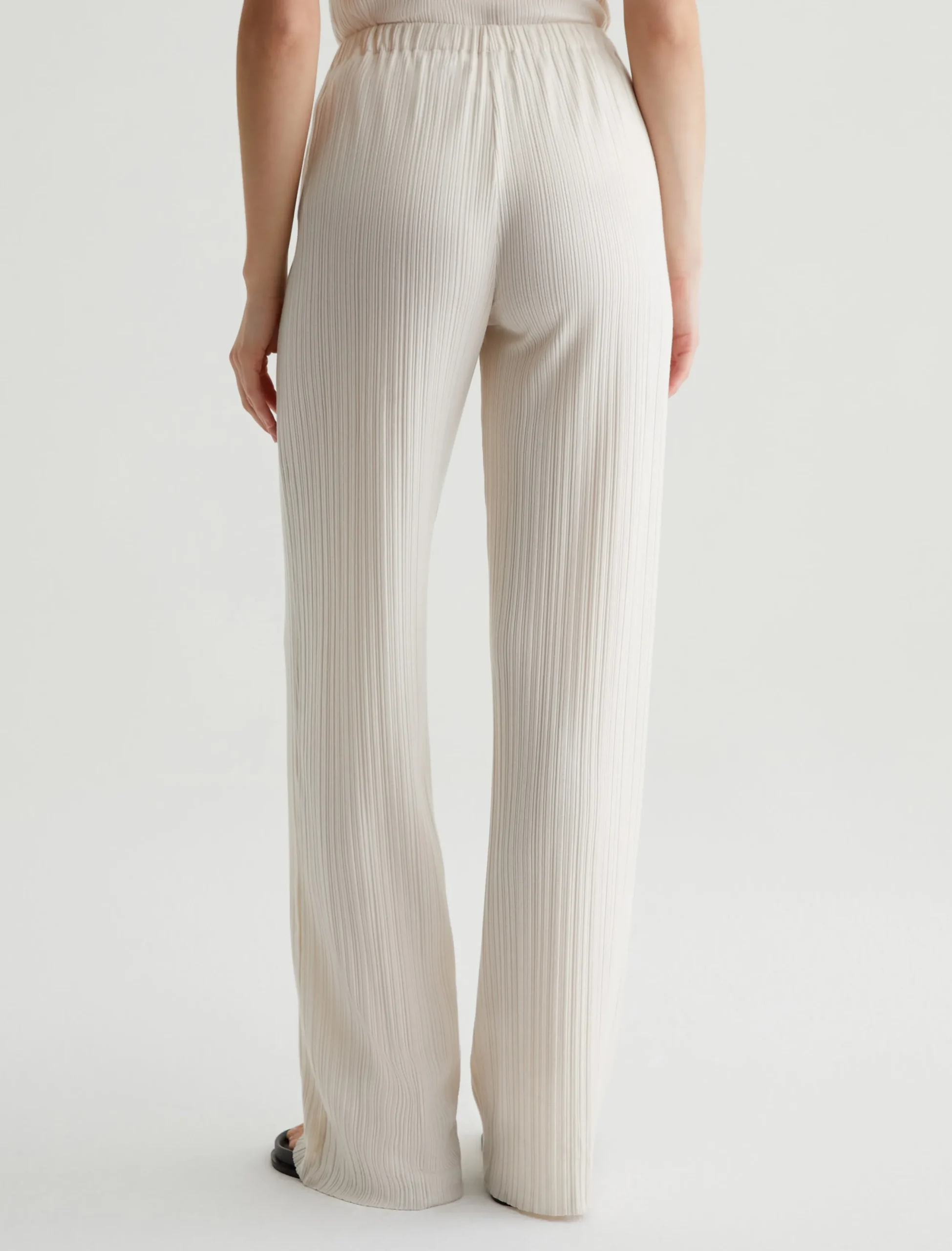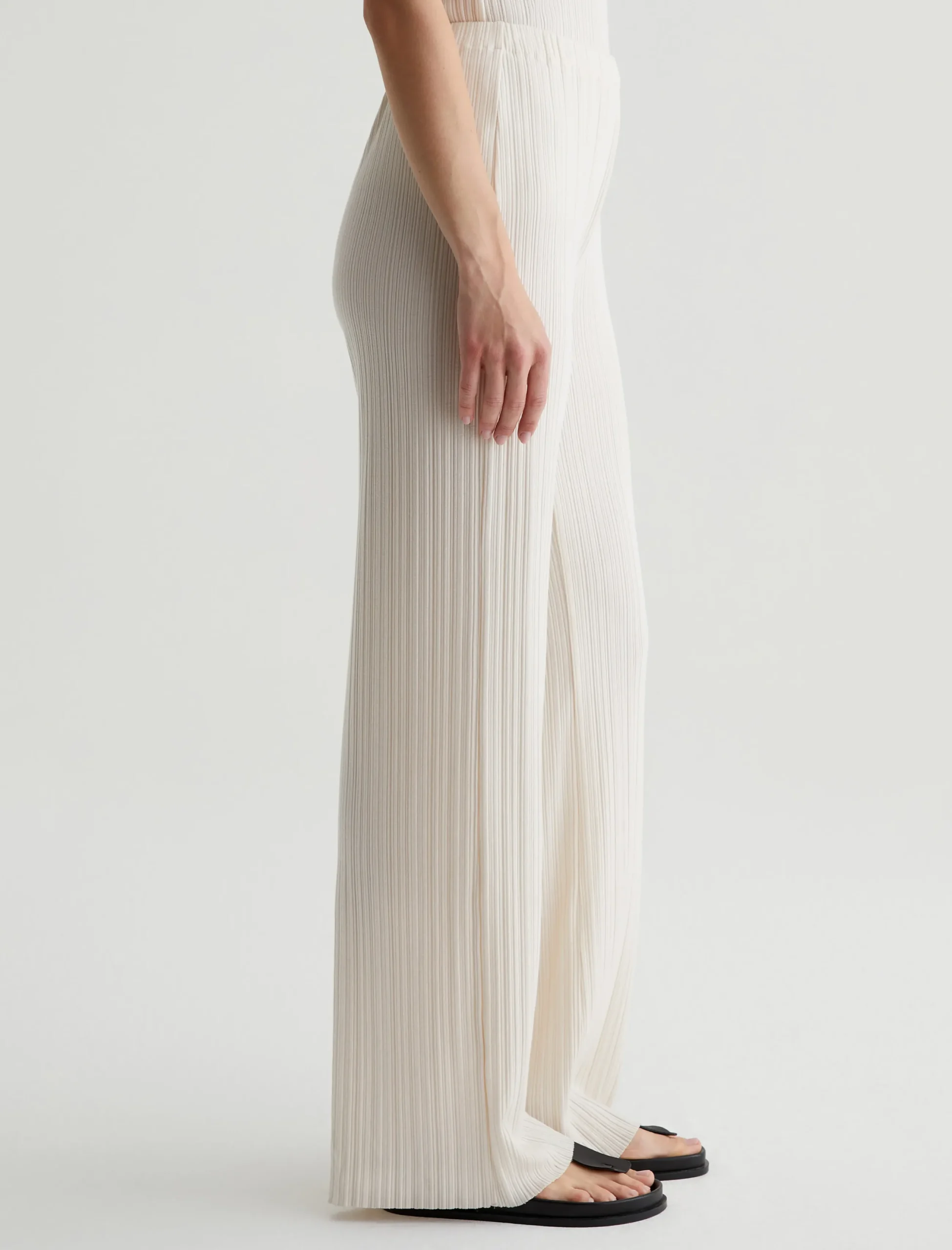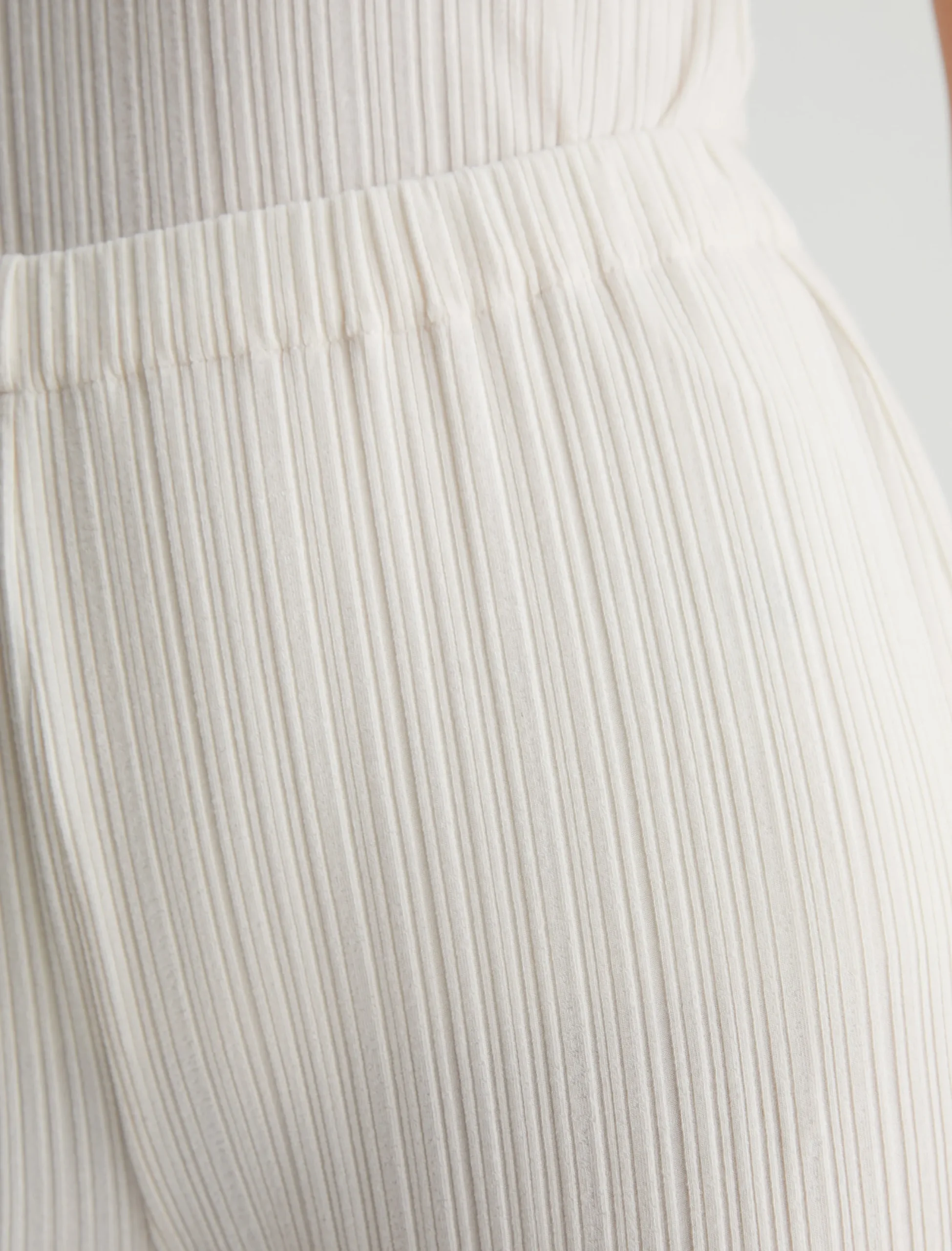 The Koda wide-leg knit pants in white look elegant and feel effortless. Lightweight and soft in a variegated rib knit, this comfortable pull-on style features a high waist and a relaxed, easy shape with raw hems. Style it as a set with our matching sleeveless top or pair it with an oversized button-up shirt to wear it from work to weekend.