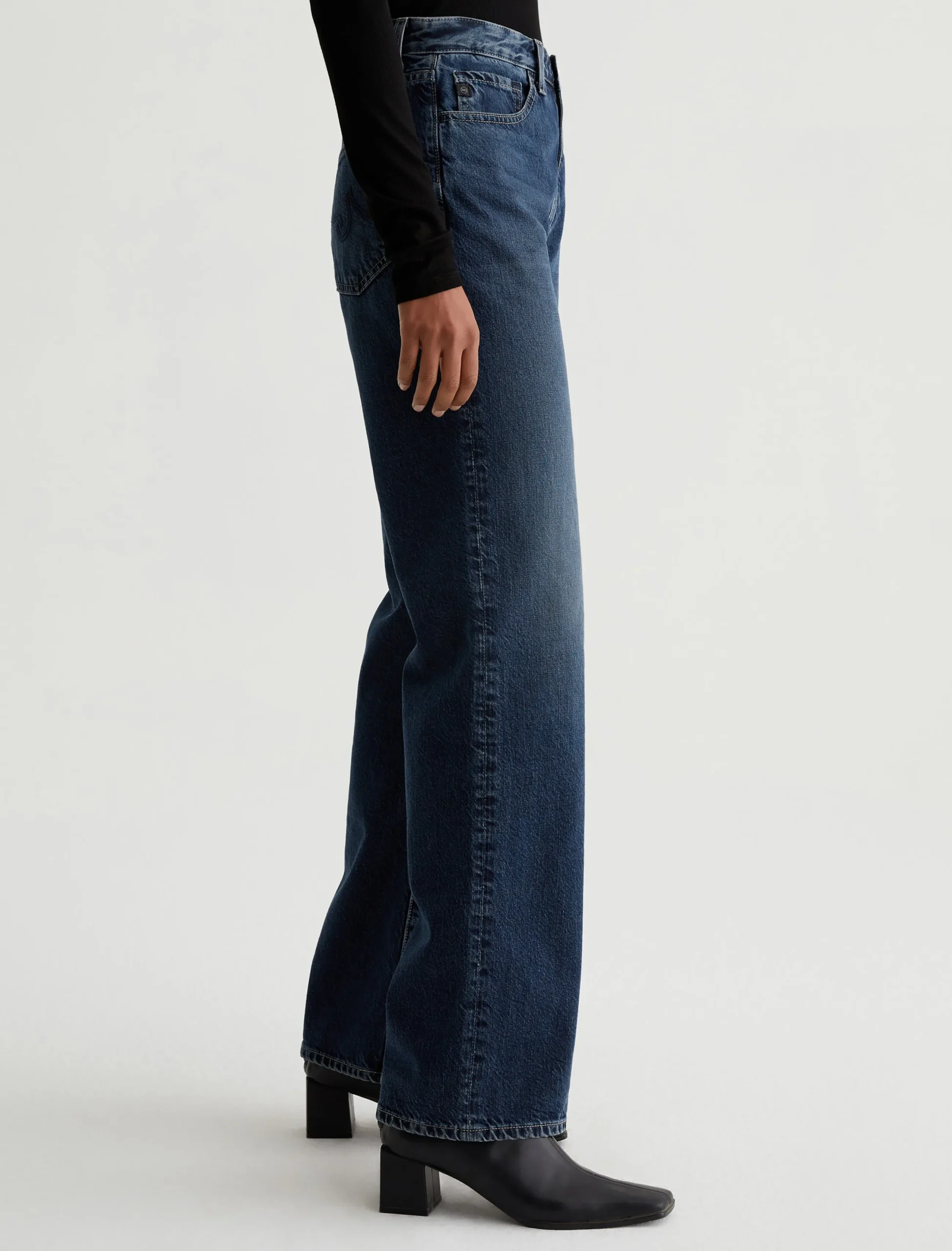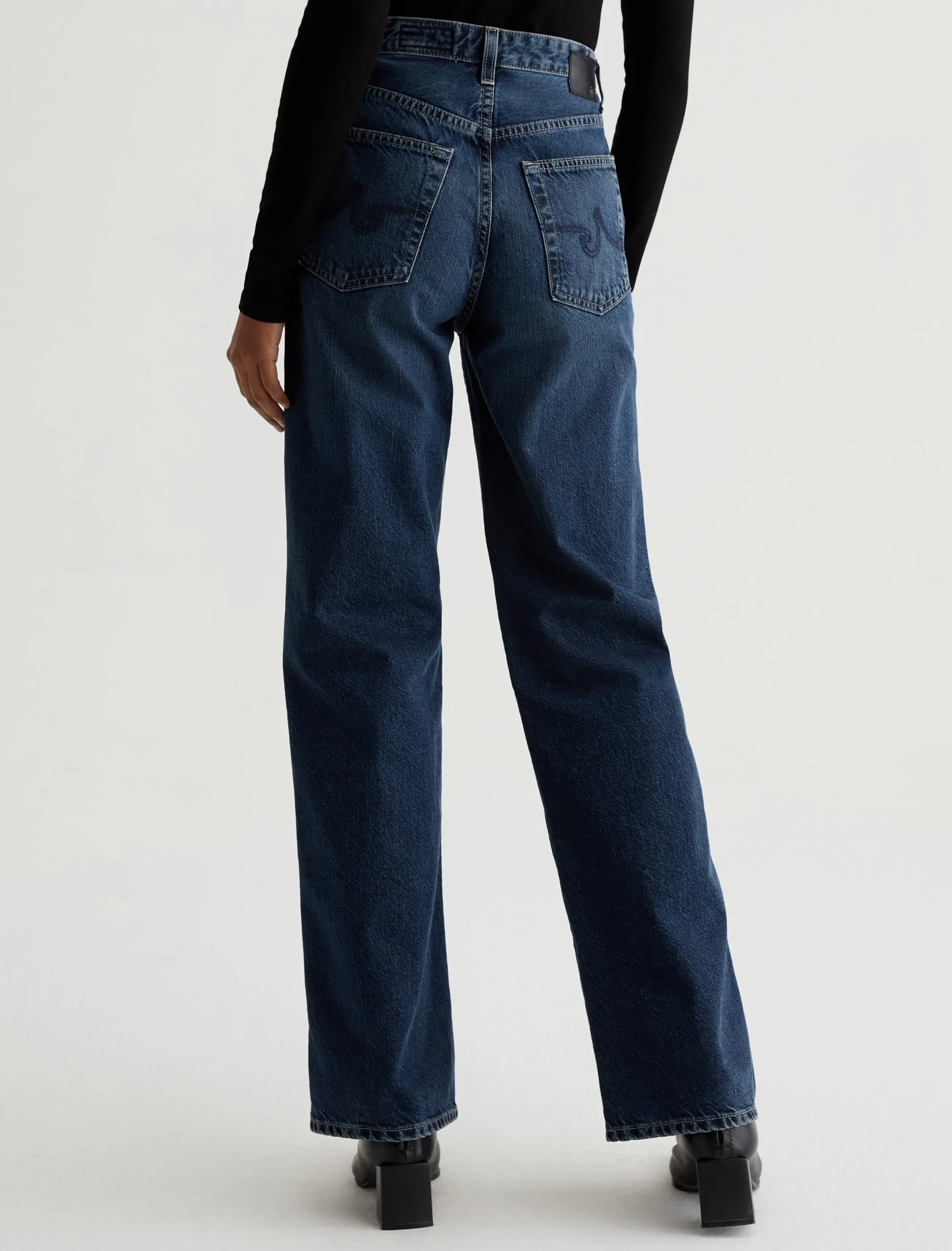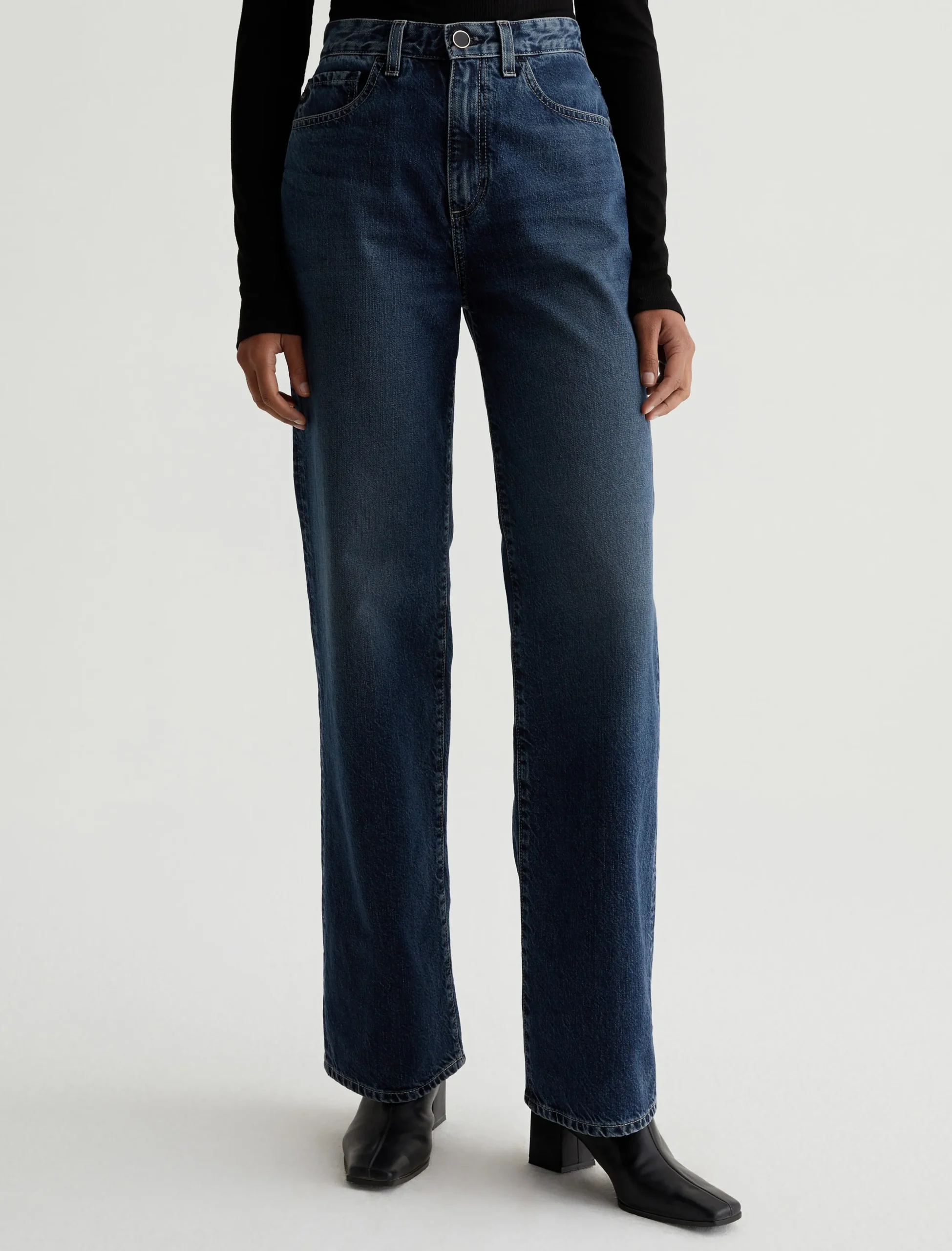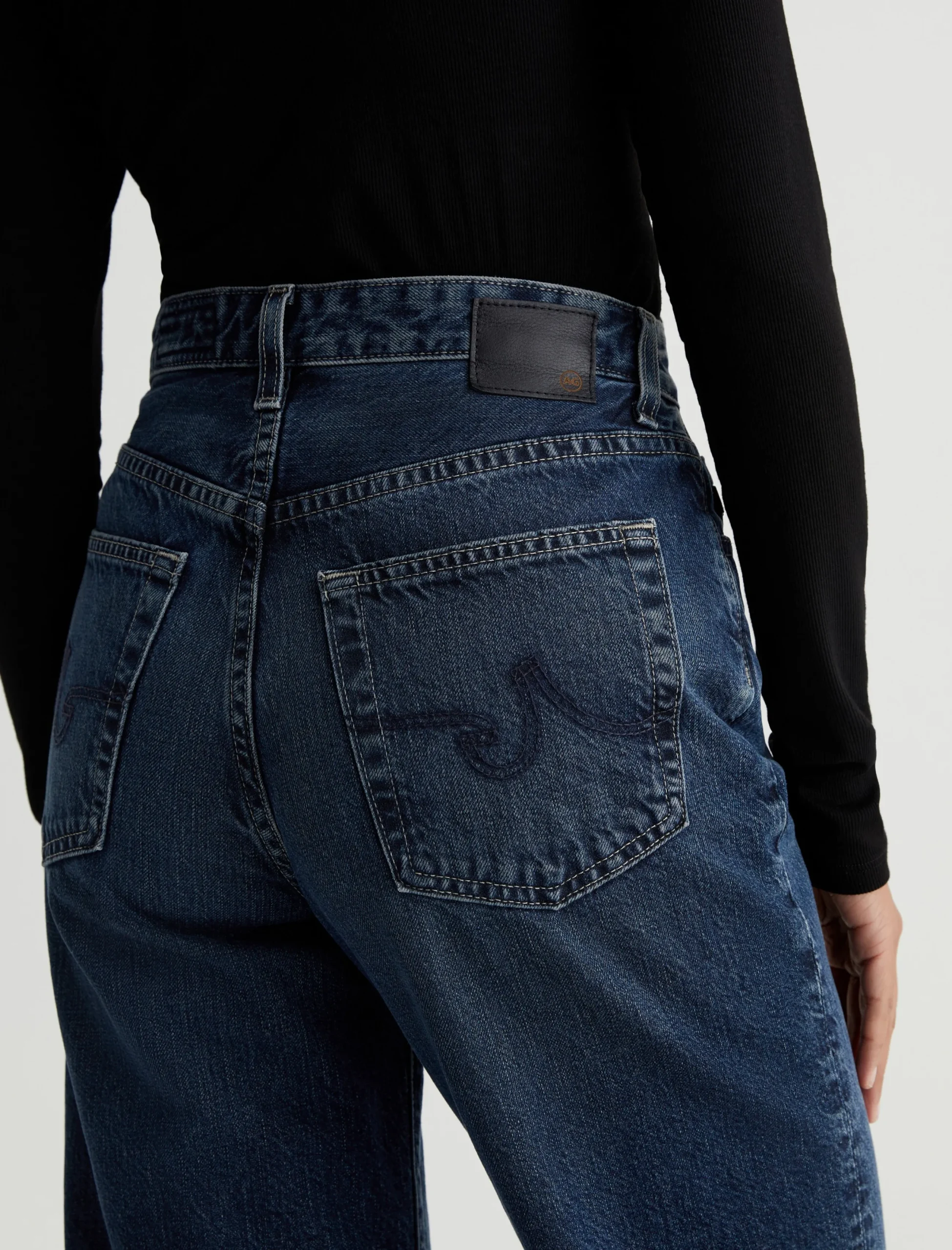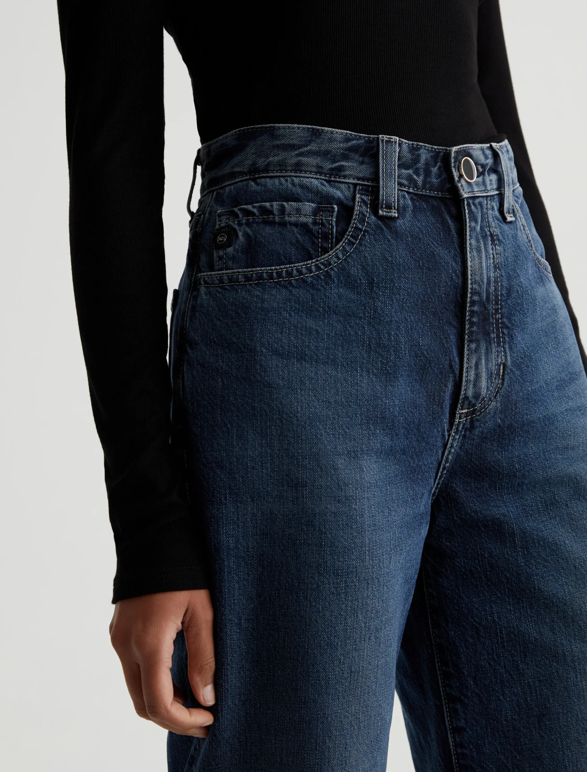 Our Kora wide-leg jeans are elevated by a sophisticated dark blue wash and a gold button with black lacquer fill. Featuring a high waist and a loose fit through the legs, this pair is crafted from rigid 11.75 oz. Legion Denim. Add our Juno shrunken trucker jacket on top for a dressed-up denim ensemble that works equally well for day or night.