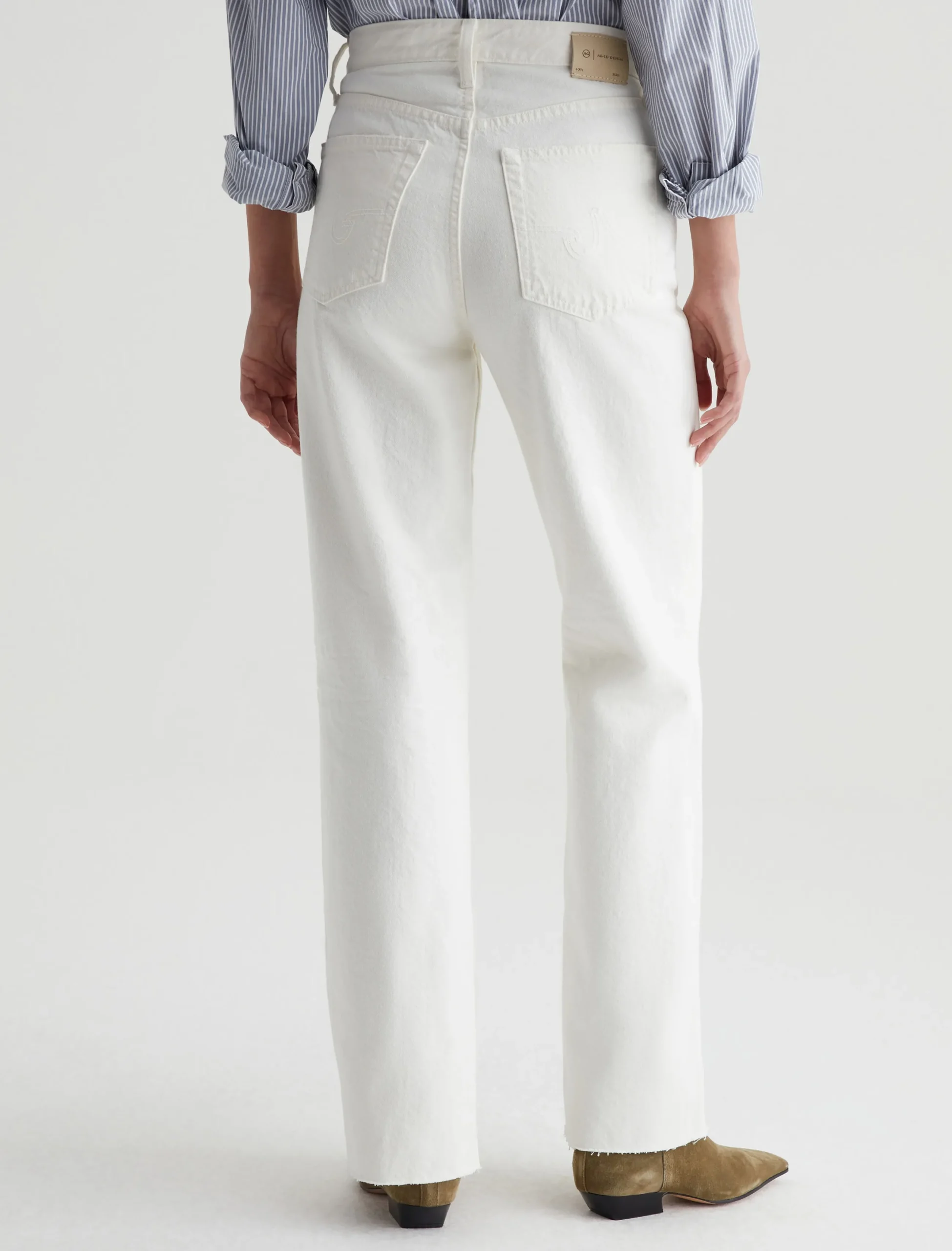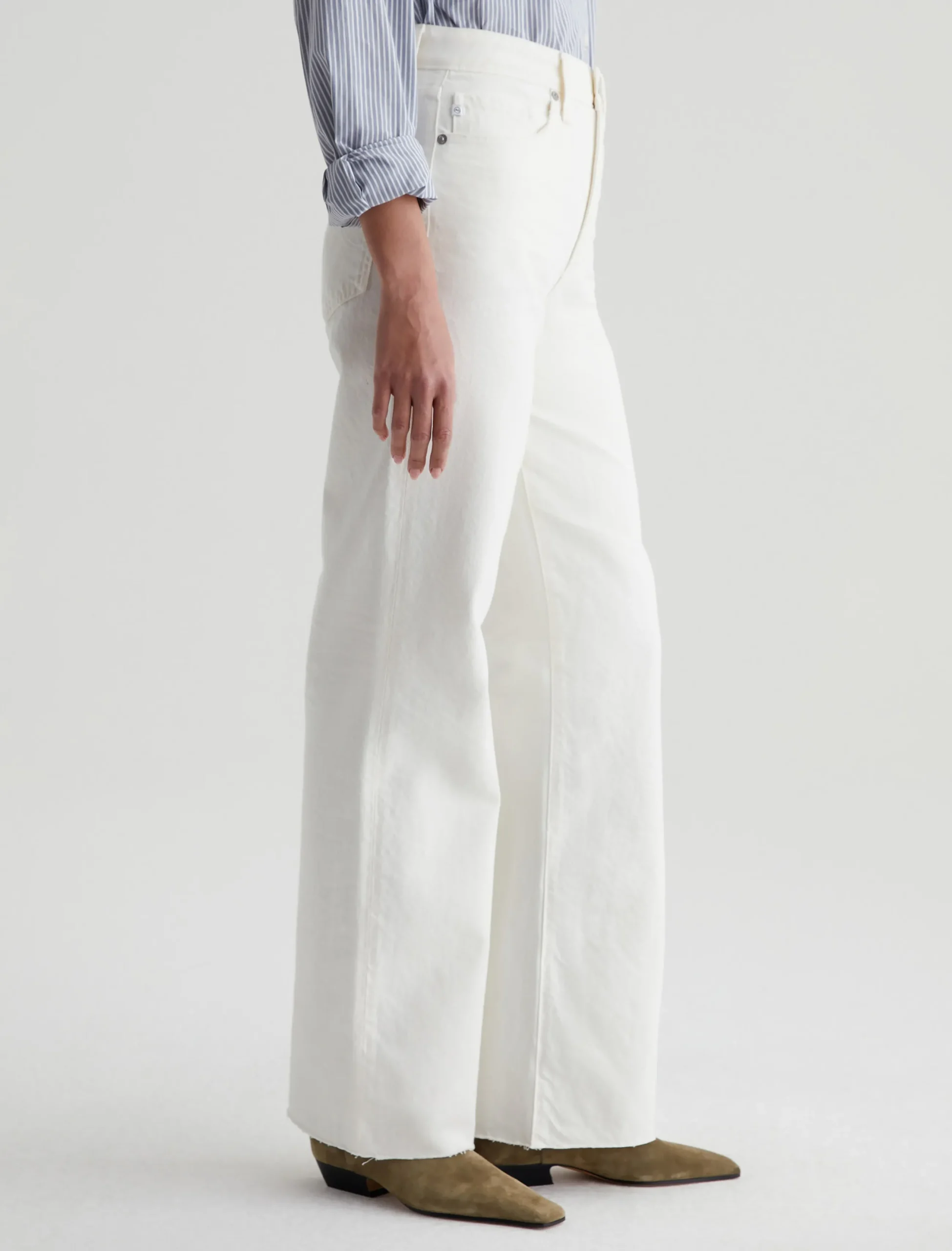 Our Kora wide-leg jeans in powder white have an ultra-high rise and a loose, easy fit through the legs. This pair is cut from 11.75 oz. Soft Pure Denim in 100% cotton. Subtle hits of distressing accent the classic five-pocket construction to emulate one year of authentic wear.