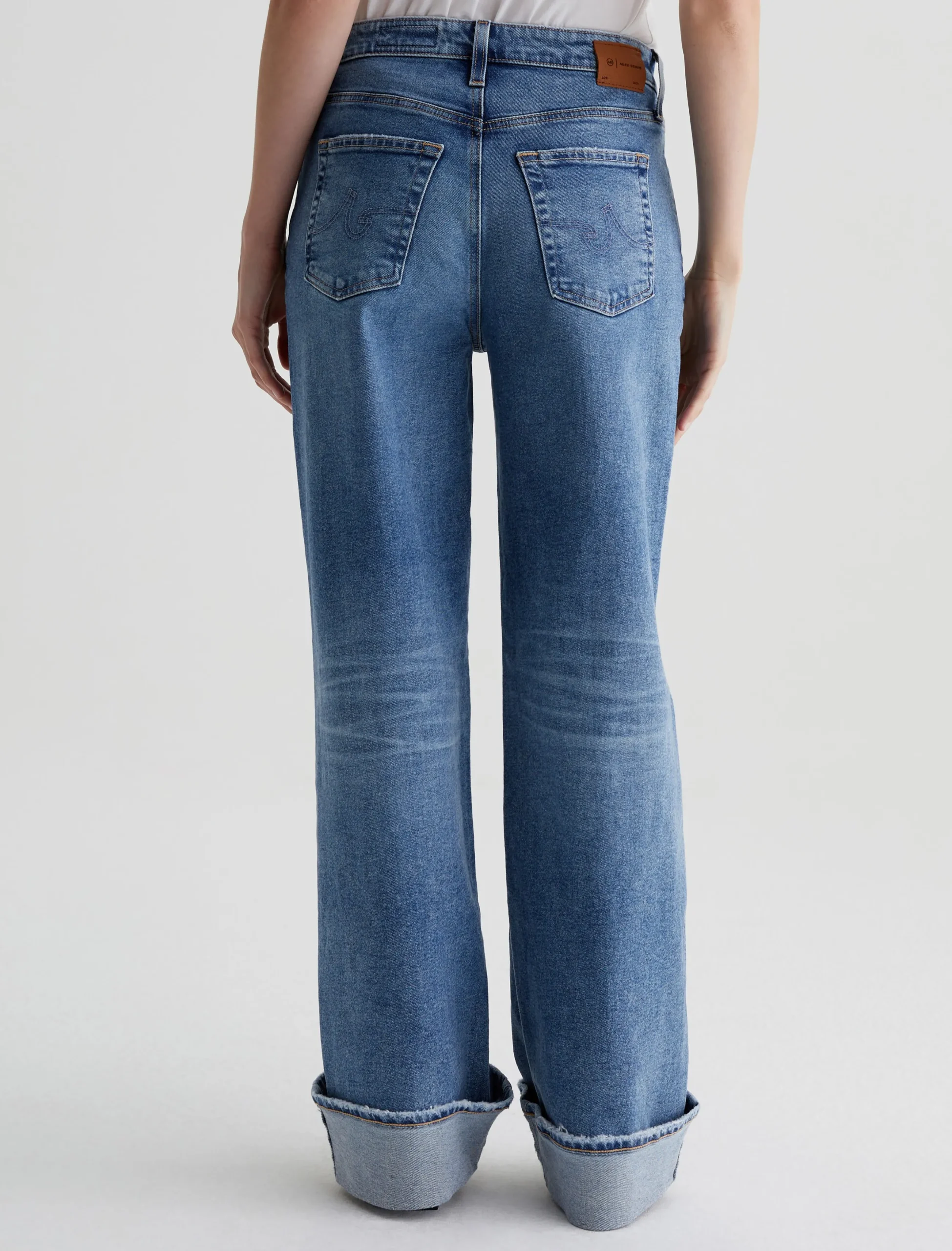 Our Kora wide-leg jeans have an ultra-high rise and a loose, easy fit in an longer length for dramatic wide-cuff styling. This pair is crafted in 12 oz. Classic Comfort Stretch Denim from Italy. It’s done in a medium blue wash with a 17-year AG-ed™ finish featuring faded details, grinding along pocket edges, and worn hems.