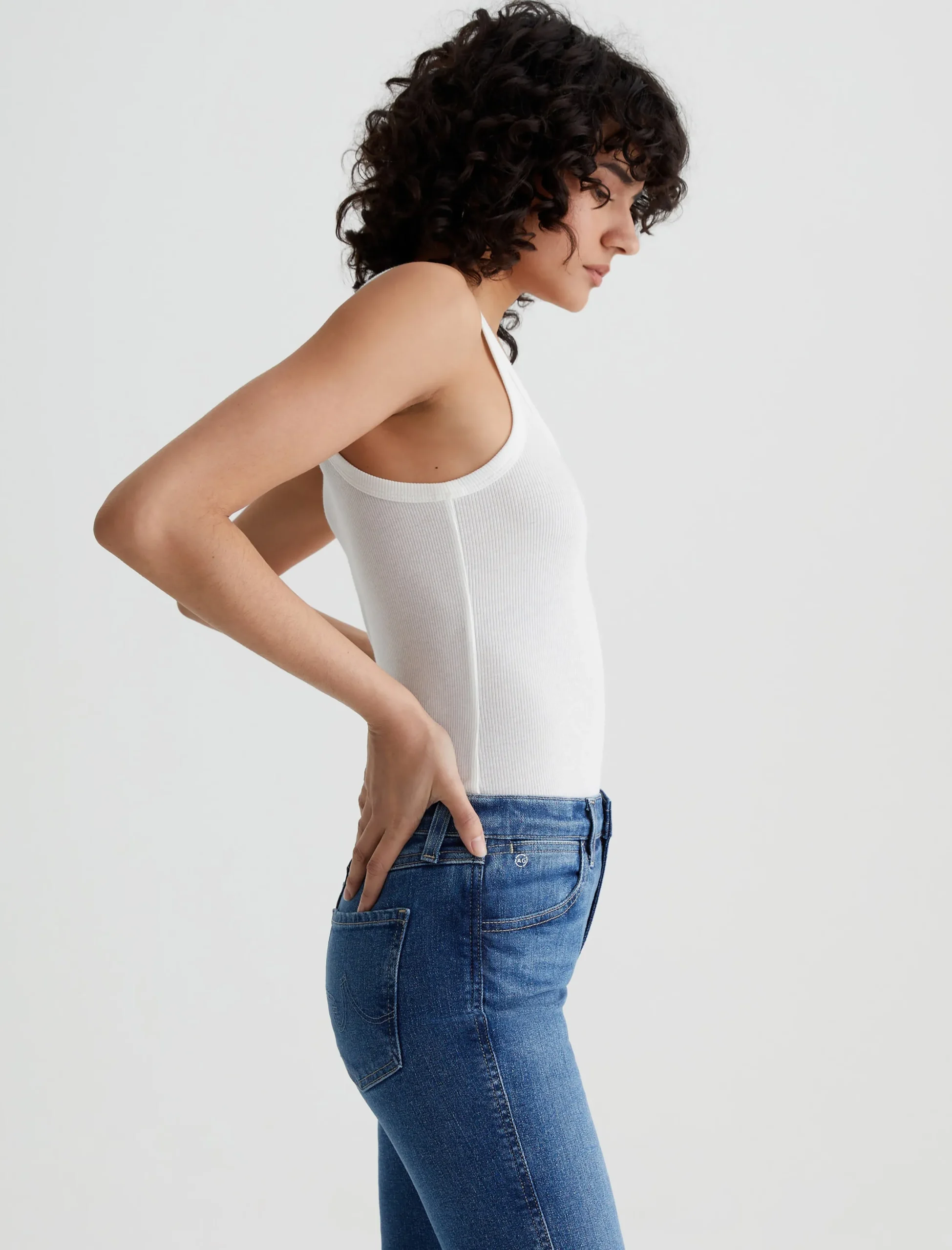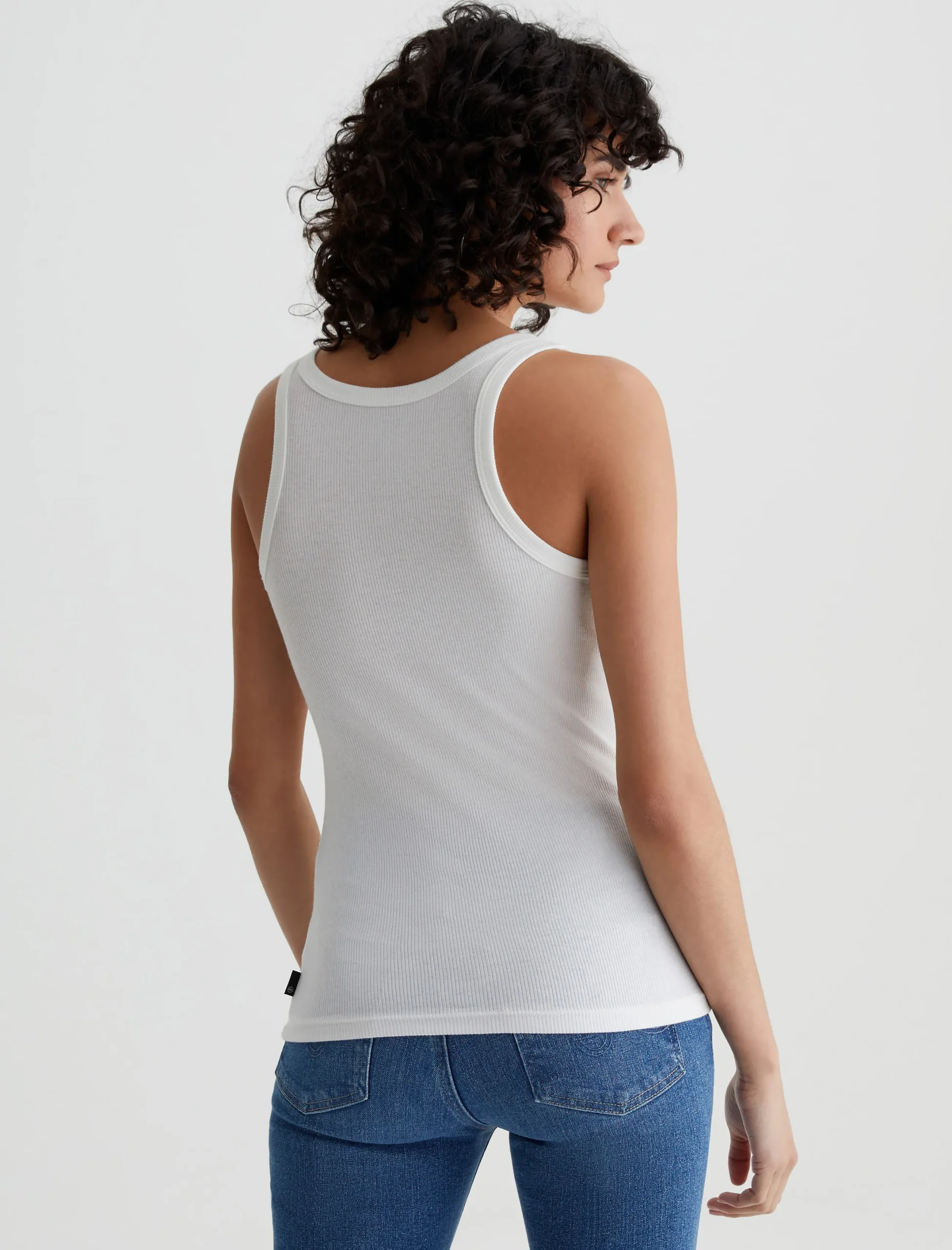 The Kura Tank in white has a slim fit in a figure-clinging rib knit. It’s blended with cotton and lyocell for natural breathability and extra softness.