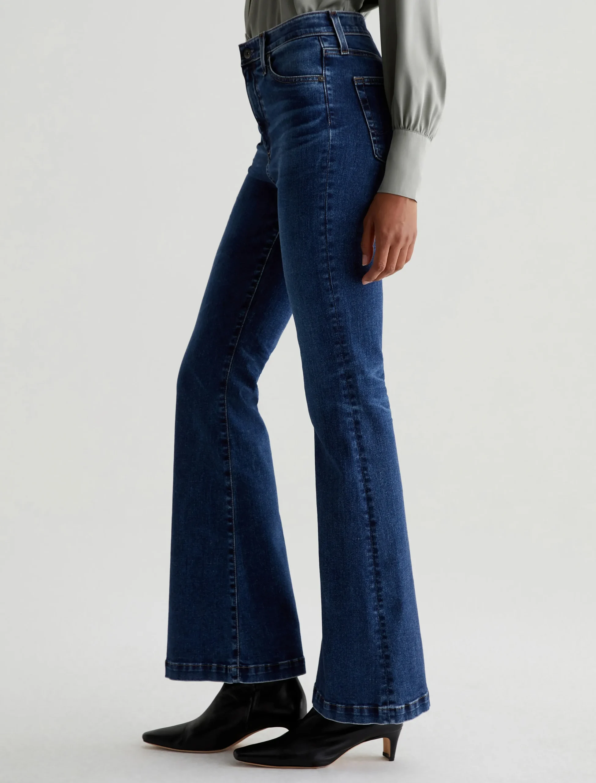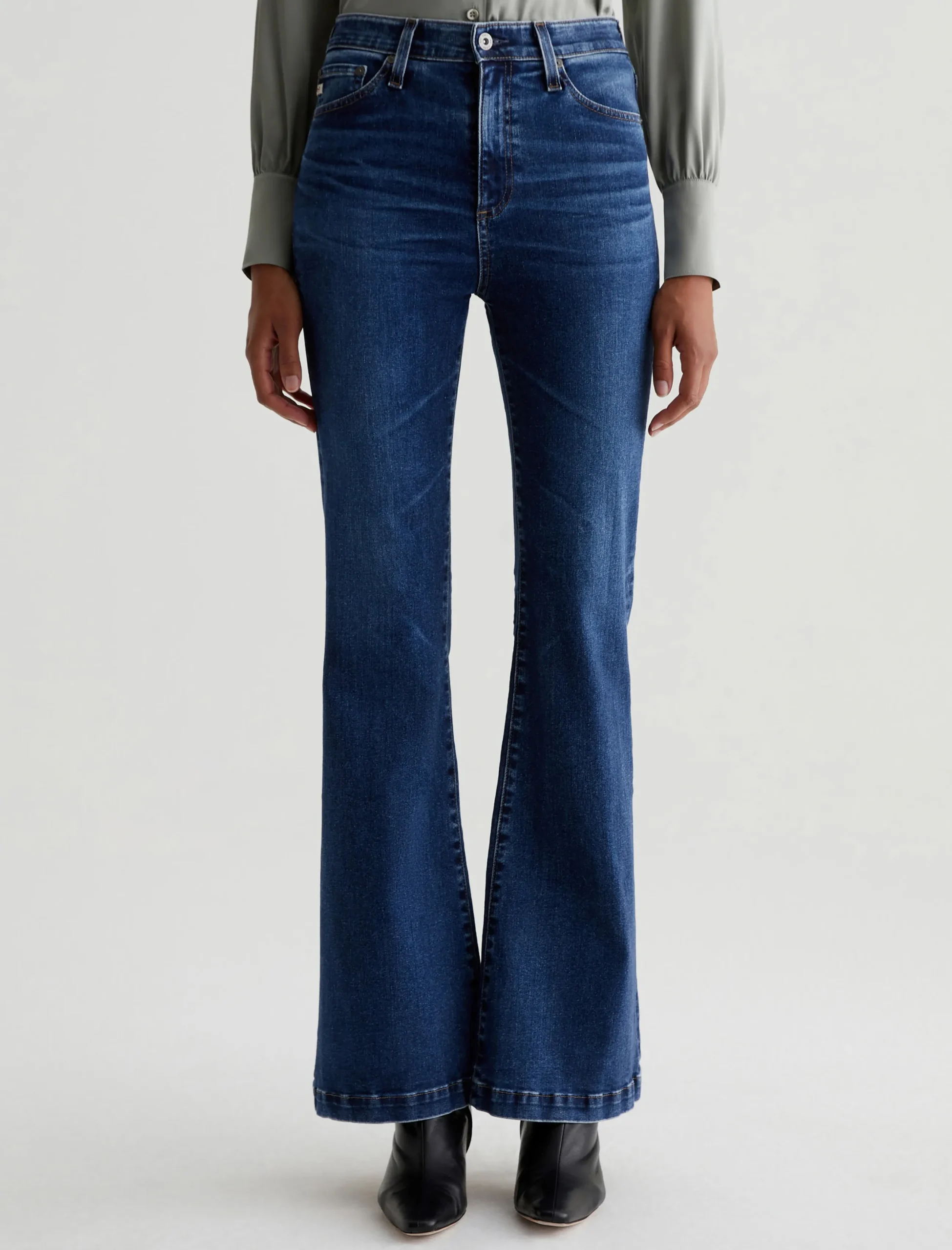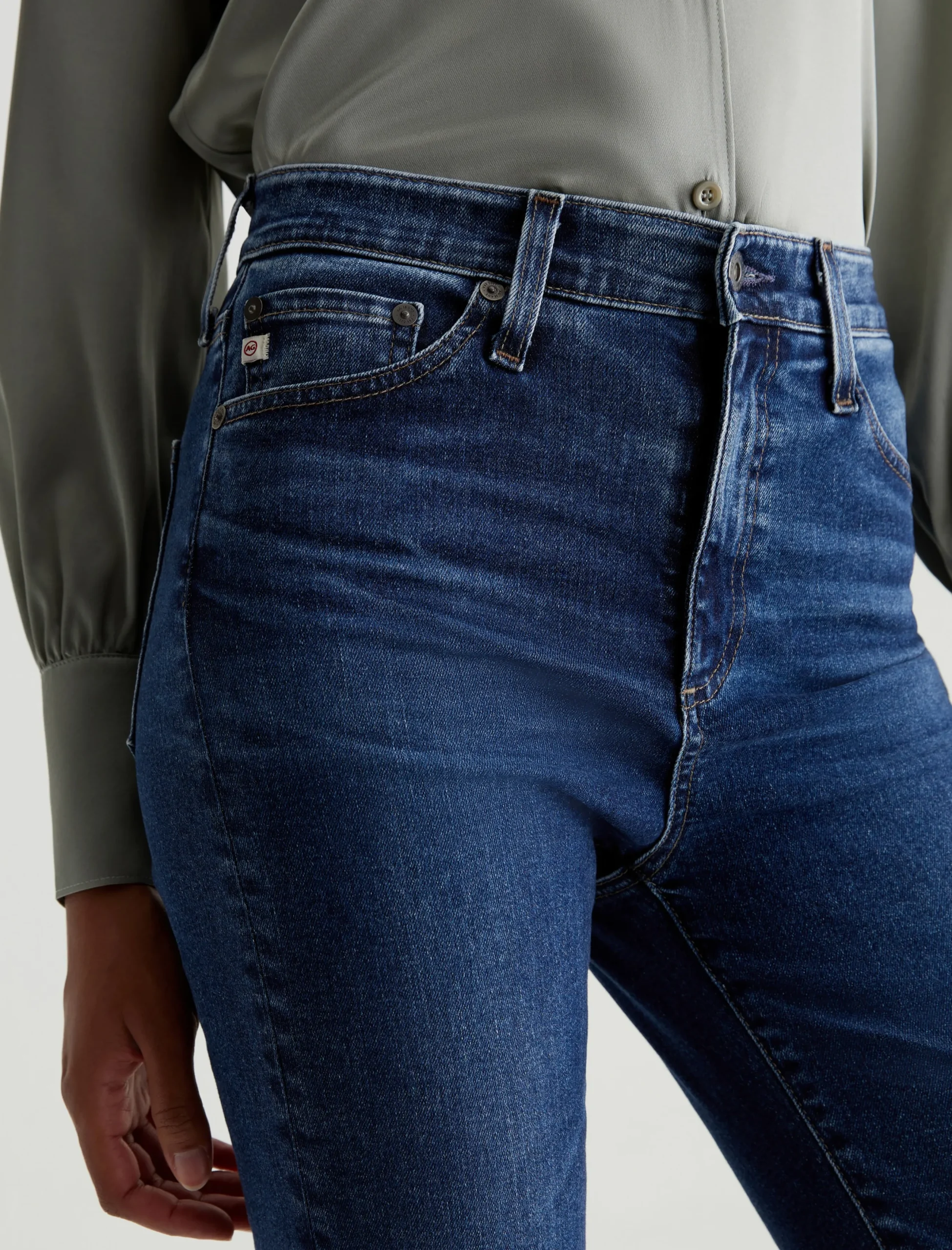 The Madi Vapor Wash jeans feature our high-rise flare in a 10-year AG-ed™ dark-blue wash that’s been achieved using our eco-friendly AG Vapor Wash™ technology. This ’70s-inspired silhouette is designed to hug the hips and elongate the legs in a curve-tracing hourglass silhouette with kicked-out hems. Crafted from 10 oz. superstretch Empower Denim from Japan, the pair offers premium comfort and advanced recovery. Our AG Vapor Wash™ process significantly reduces the use of water, chemicals, and energy to lessen environmental impact. Finished with a vegan and 100% biodegradable cellulose patch at the back waistband.