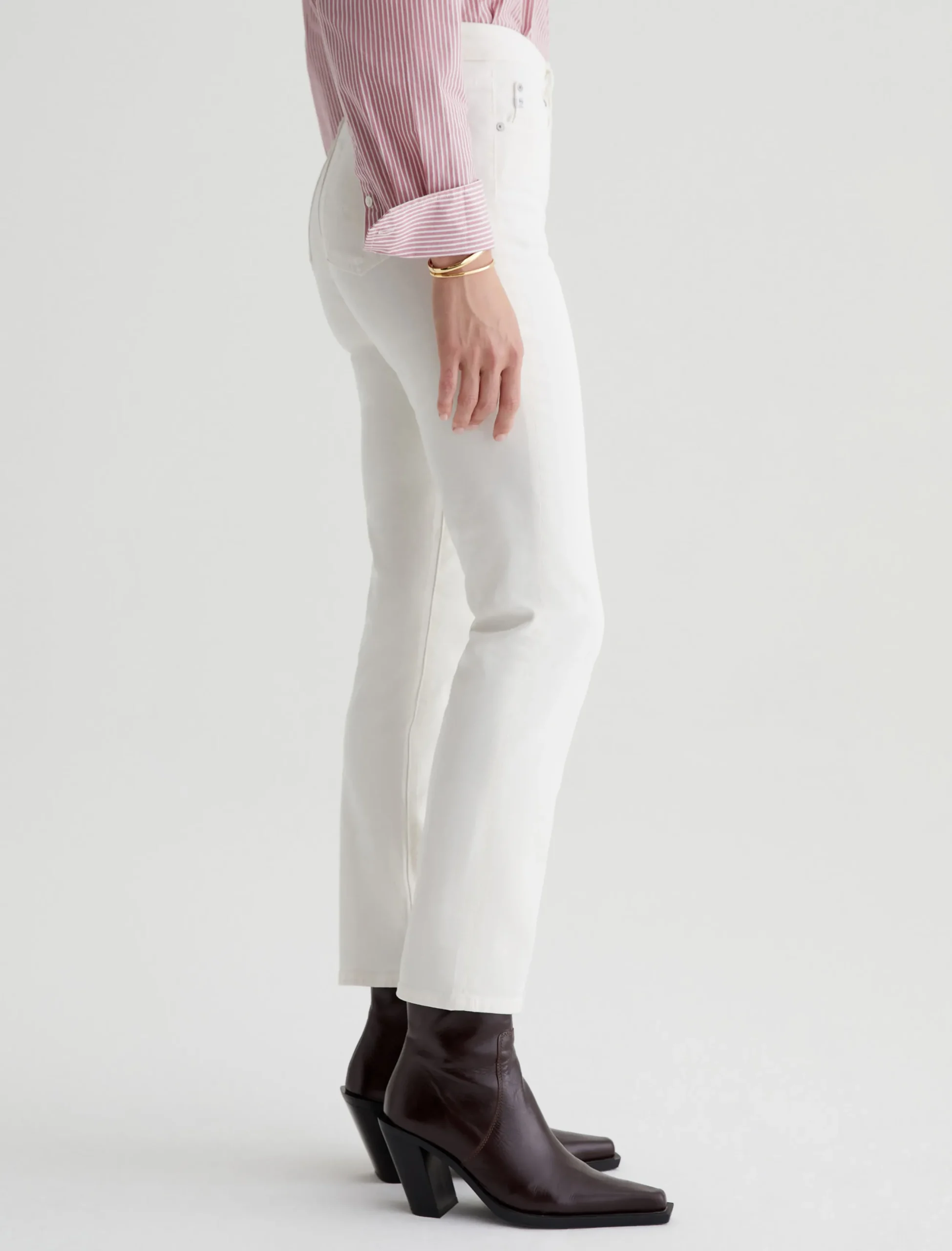 Mari is our popular mid-rise slim-straight jean for women, updated in powder-white denim with the softest feel. The five-pocket style has a natural waist and fits easy around the hips, complete with a straight silhouette that slims down at the leg openings. This pair is crafted from 8.7 oz. Hyper Soft Bull Denim, an exclusive AG Cloud Soft Denim™ fabric. The special left-hand twill construction allows the yarns to gently relax and untwist for a luxe, supple texture. It’s designed to get even softer the more you wear it. There’s dual-elastic stretch built in for extra comfort and powerful recovery.