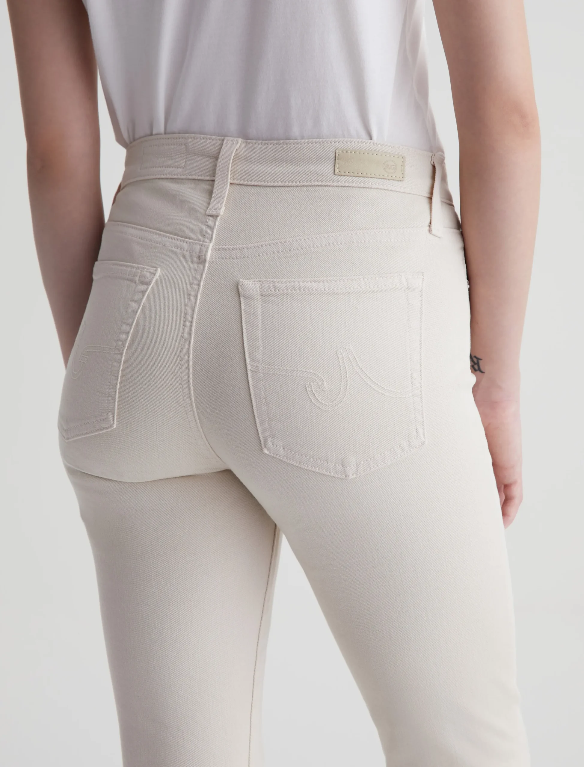 The Mari Crop is a mid-rise slim straight jean for women, updated here in off-white. Designed to fit easy around the hips, it’s cut with a straight-leg silhouette and a slim, cropped leg opening. Part of our exclusive AG Cloud Soft Denim™ offering, these women’s high-waisted jeans come in 9.7 oz. Hyper-Soft Stretch Denim. This left-hand twill fabric has special construction that allows the yarns to gently relax and untwist for a luxe, supple feel. It’s designed to get even softer the more you wear it.