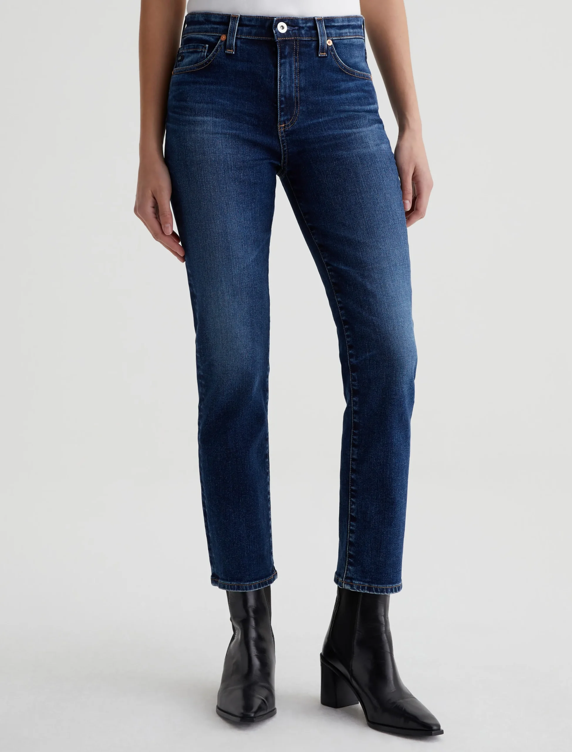 Our Mari Crop is a mid-rise slim straight jean that’s cropped just above the ankle. The high-waist silhouette fits easy around the hips with a straight leg and slim leg opening. It’s featured in 10 oz. Empower Denim with superstretch construction and a dark blue wash that’s been faded for a lived-in character. Marigold topstitching accents the classic five-pocket design.