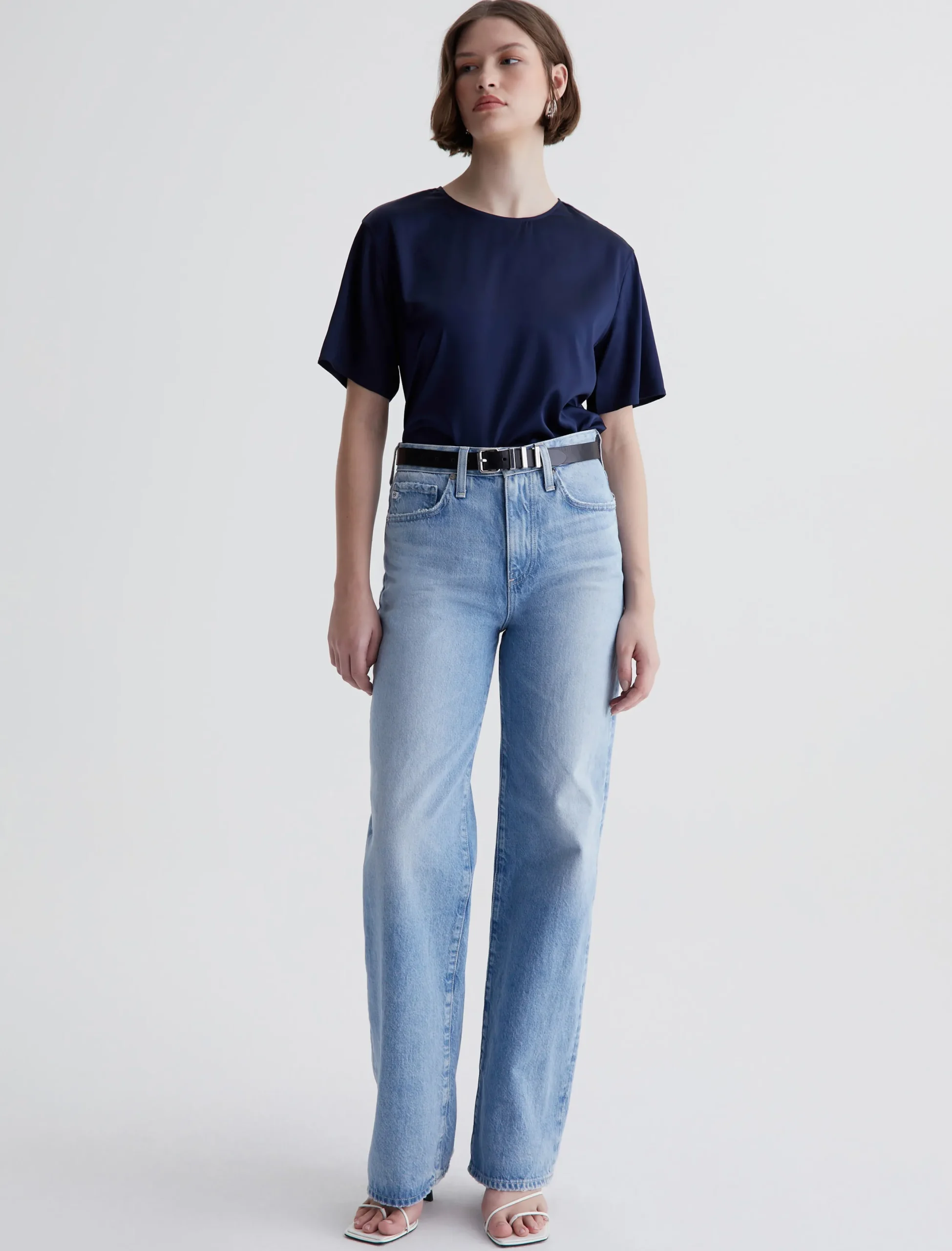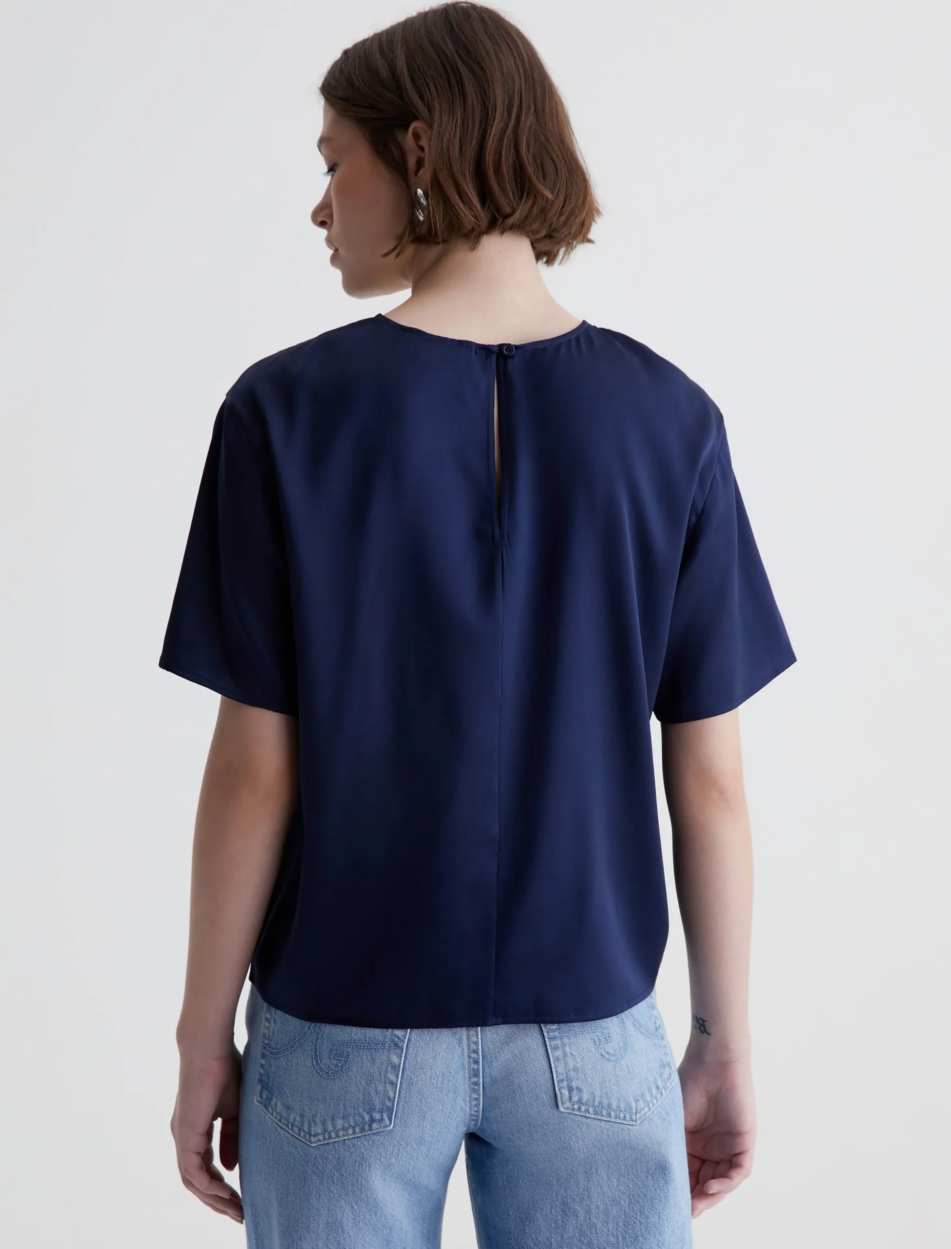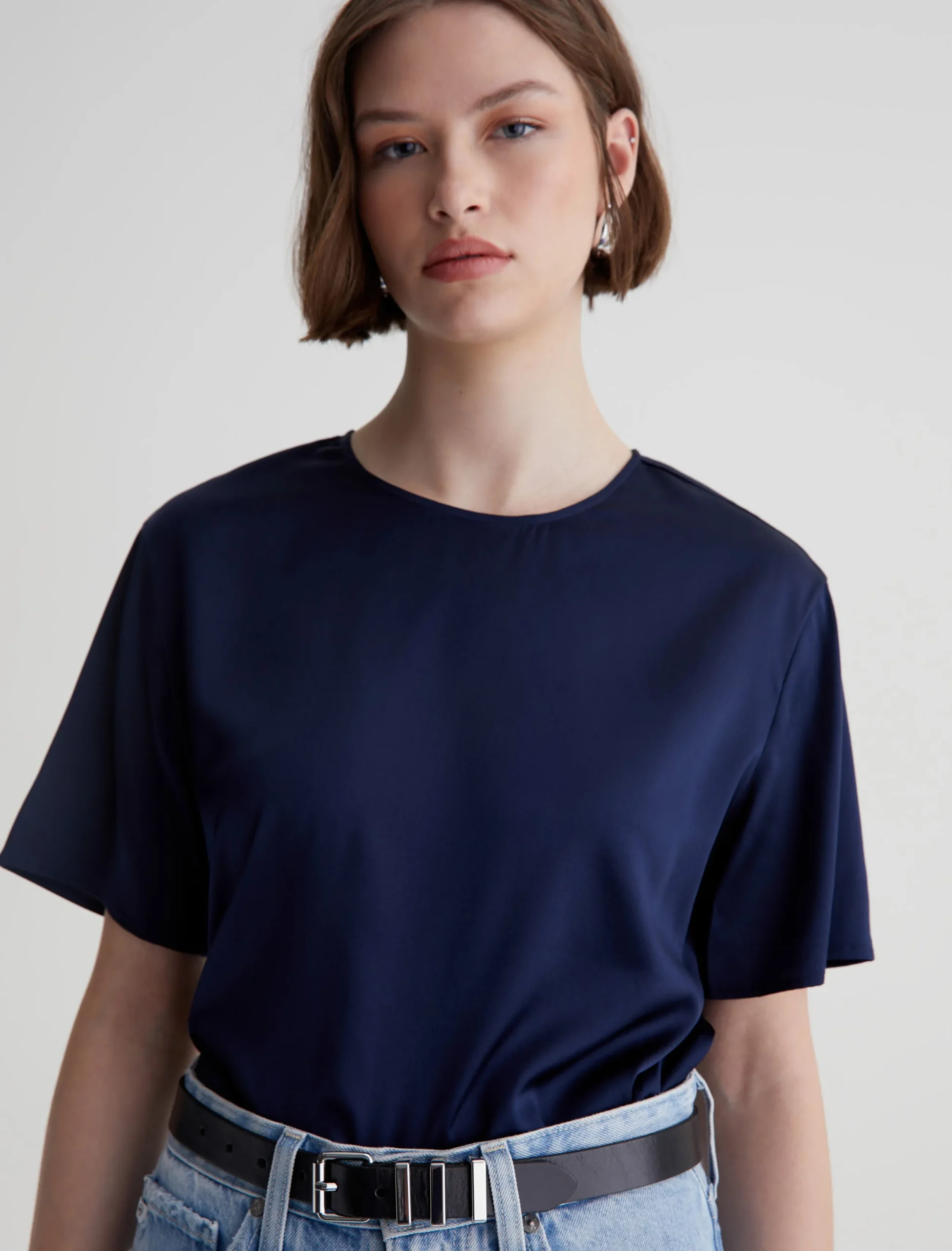 Luxe stretch silk elevates the silhouette of a relaxed-fit tee. Done in a classic navy blue, the Nari top has a boxy, oversized shape that’s defined by a crew neck, loose-fitting short sleeves, and a keyhole at the back. It’s sleek and simple with a breezy drape—perfect for dressing up denim or pairing with our matching silk separates.