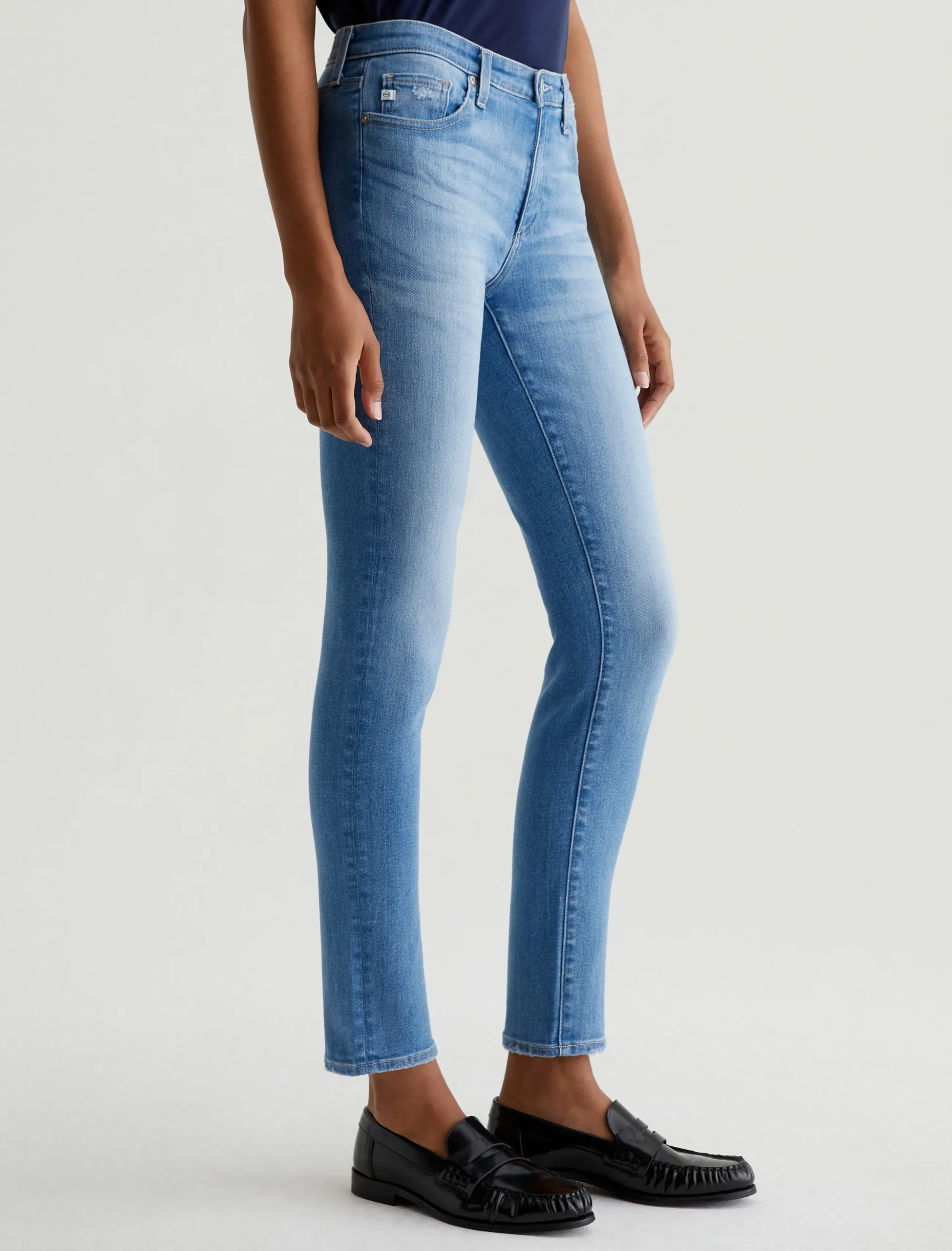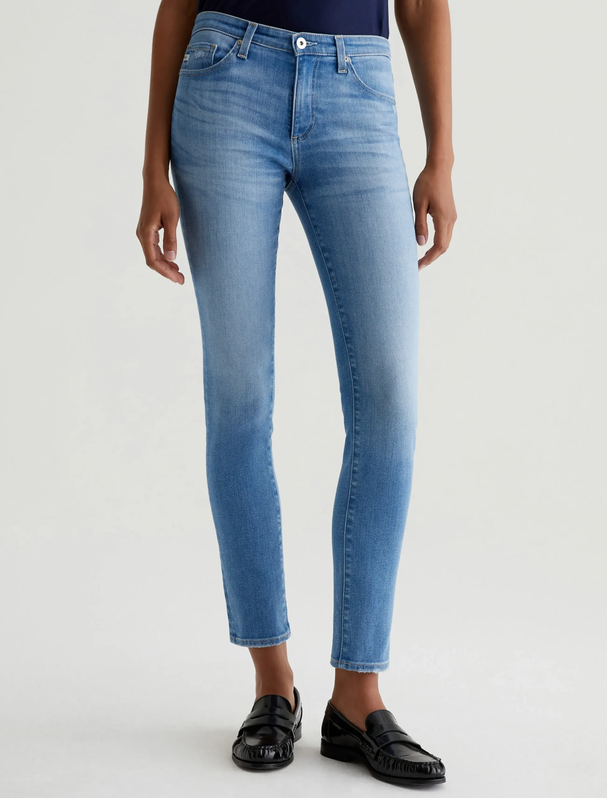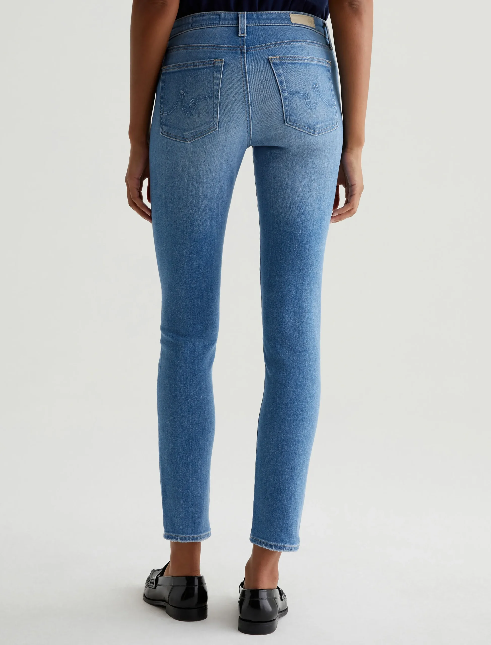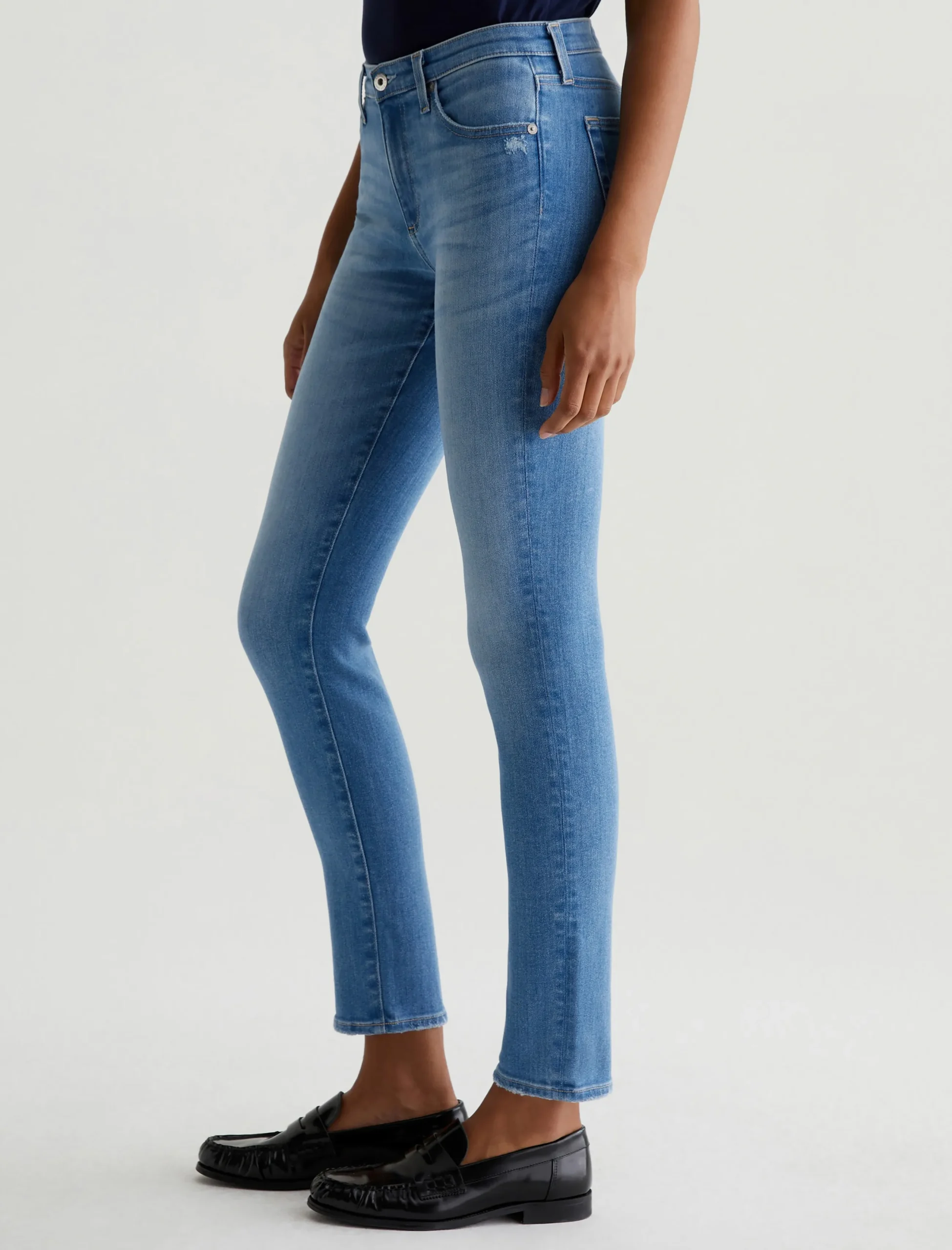 Prima is a mid-rise cigarette jean in a light-medium indigo wash with fading, worn hems, and a touch of distressing at the pockets. Designed in 11.5 oz. Sioux Stretch Denim from Japan, these five-pocket women’s jeans are fitted through the hips and slightly tapered at the legs.