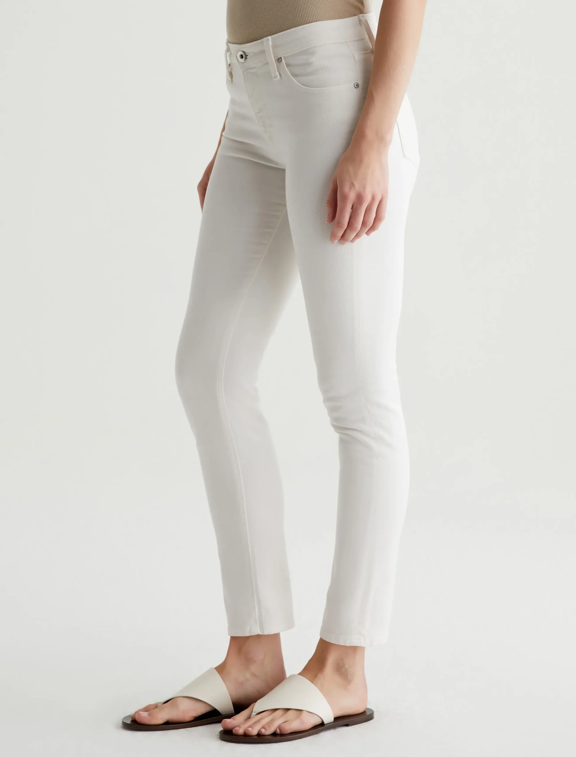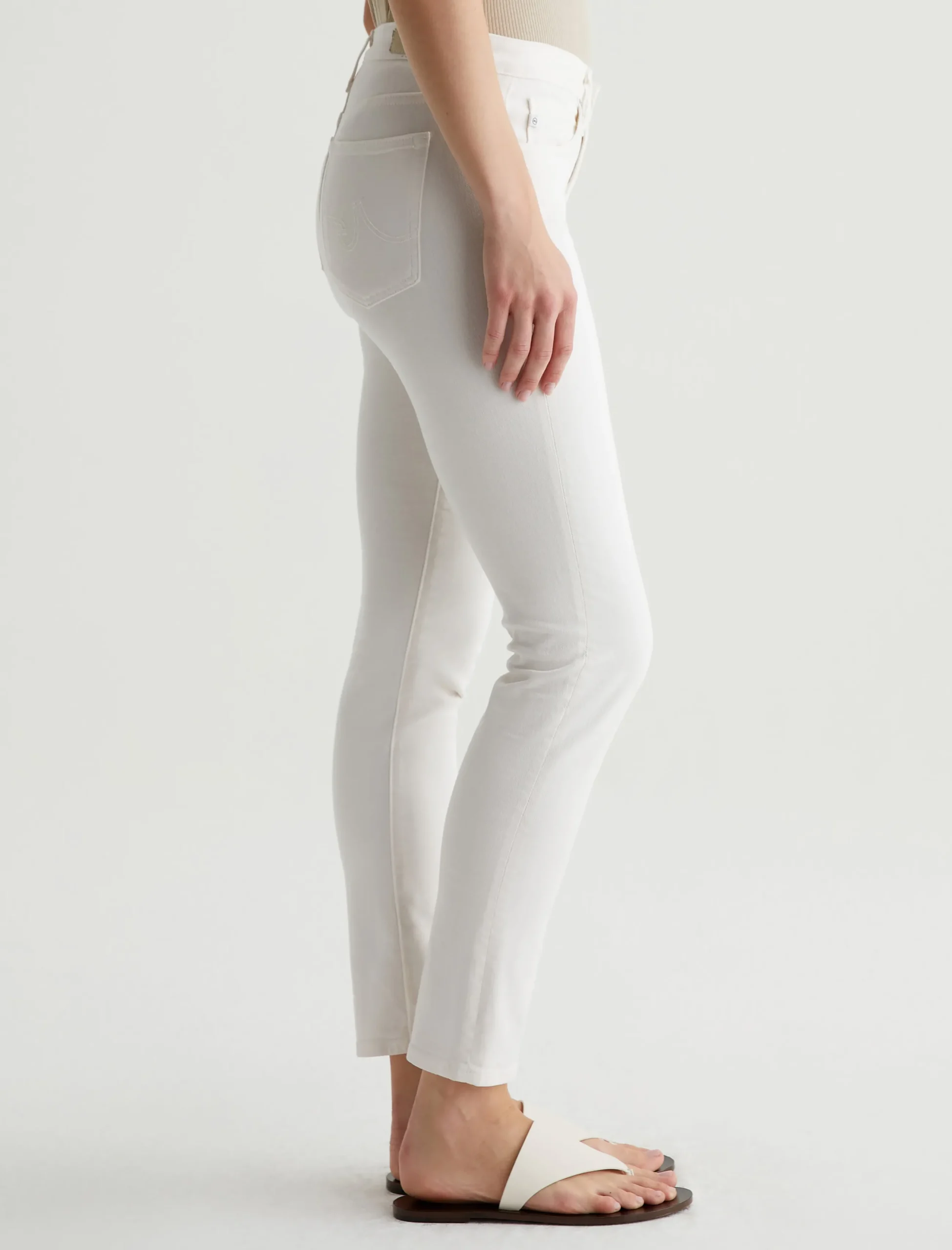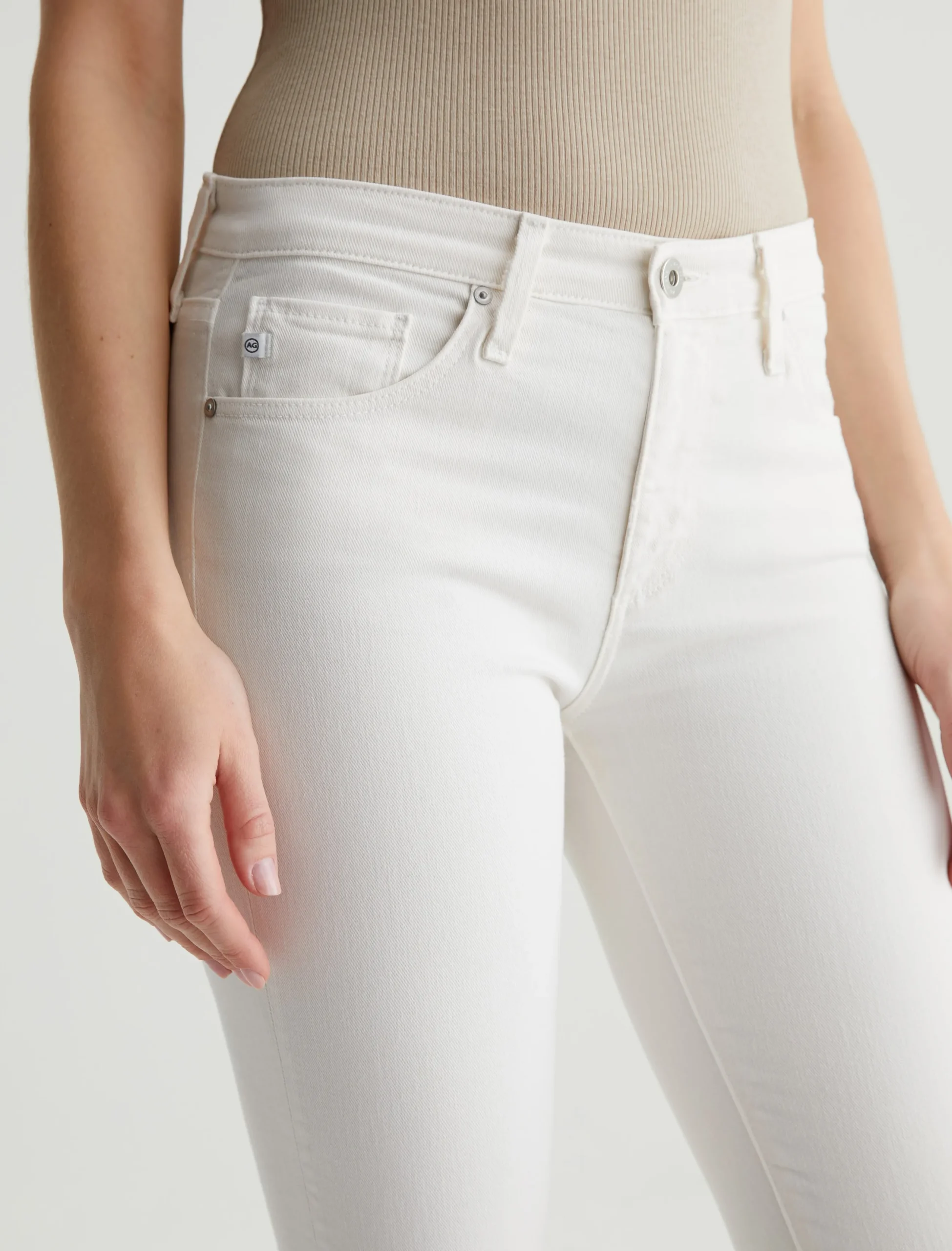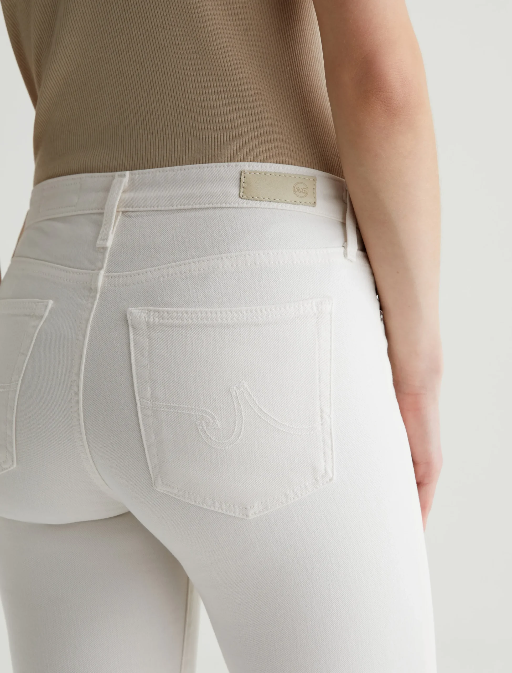 Our Prima Ankle is a mid-rise cigarette jean that’s fitted through the hips, slightly tapered at the legs, and cropped to the perfect ankle length. This five-pocket pair features 9.7 oz. Hyper-Soft Stretch Denim in powder white. This exclusive AG Cloud Soft Denim™ features special left-hand twill construction that allows the yarns to gently relax and untwist for a luxe, supple feel. It’s designed to get softer with every wear.