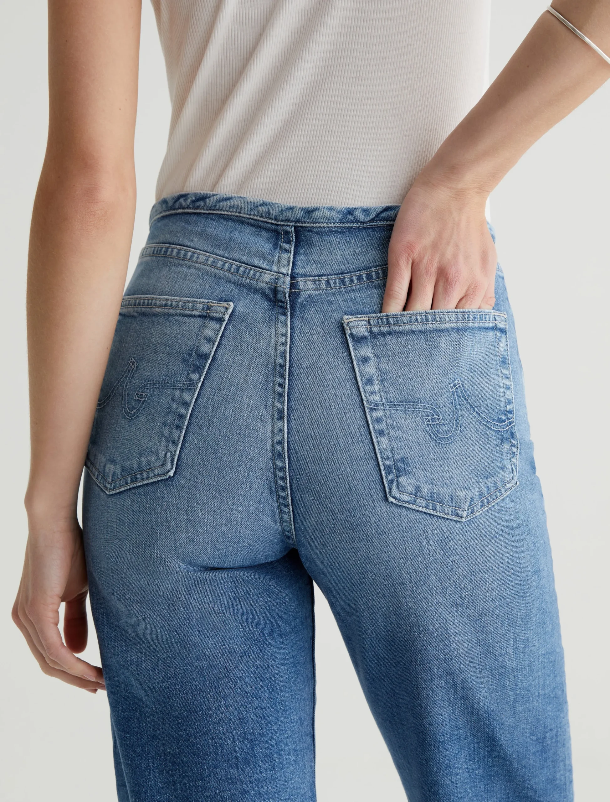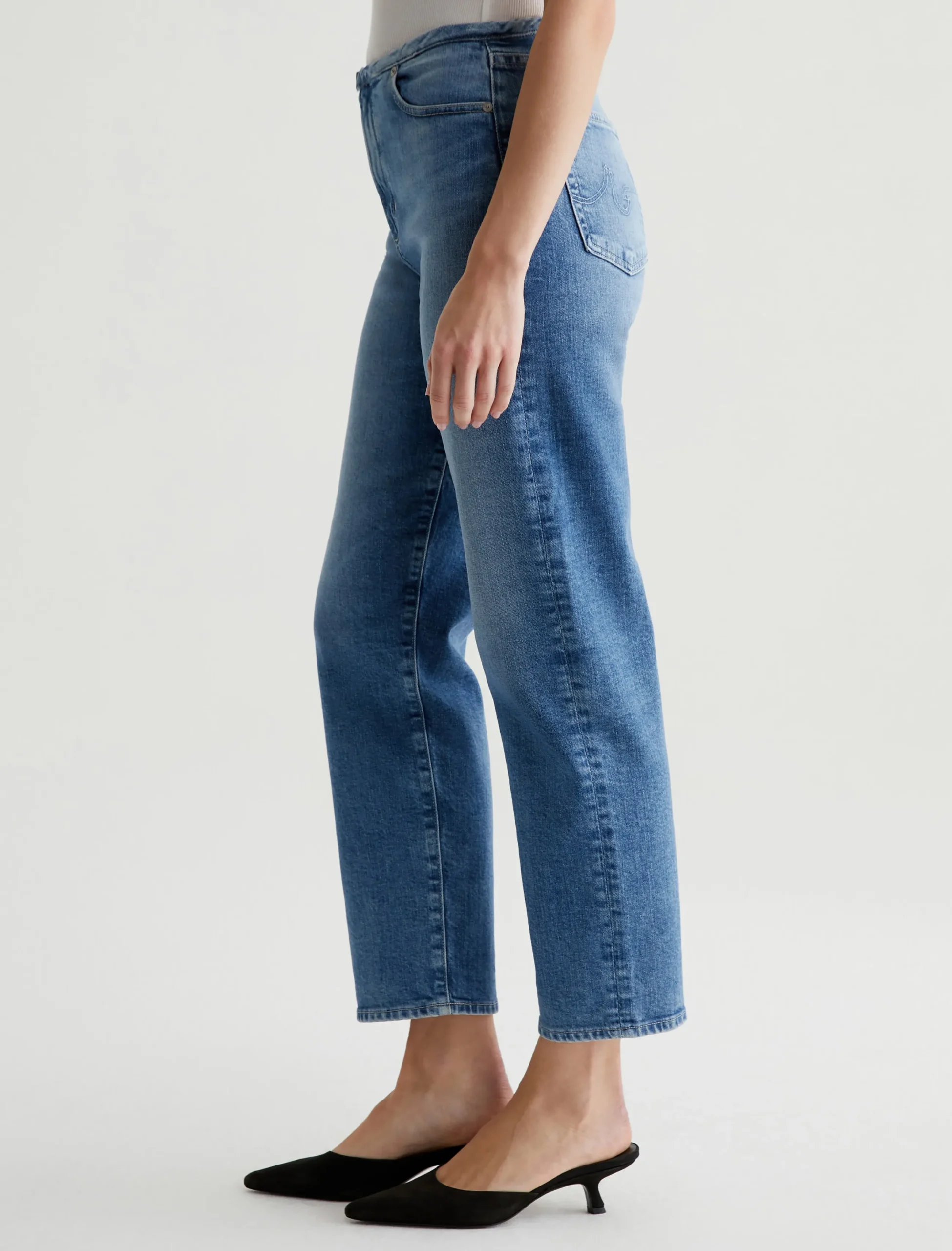 Our Rian high-rise straight, updated with a chopped waistband. It’s got a zip fly with a concealed button closure. The pair has a super-high waist and a roomy cut through the hips and legs, landing at an ankle-skimming length. These five-pocket women’s jeans are crafted from 11.75 oz. Vintage Comfort Stretch Denim in a faded light indigo wash.