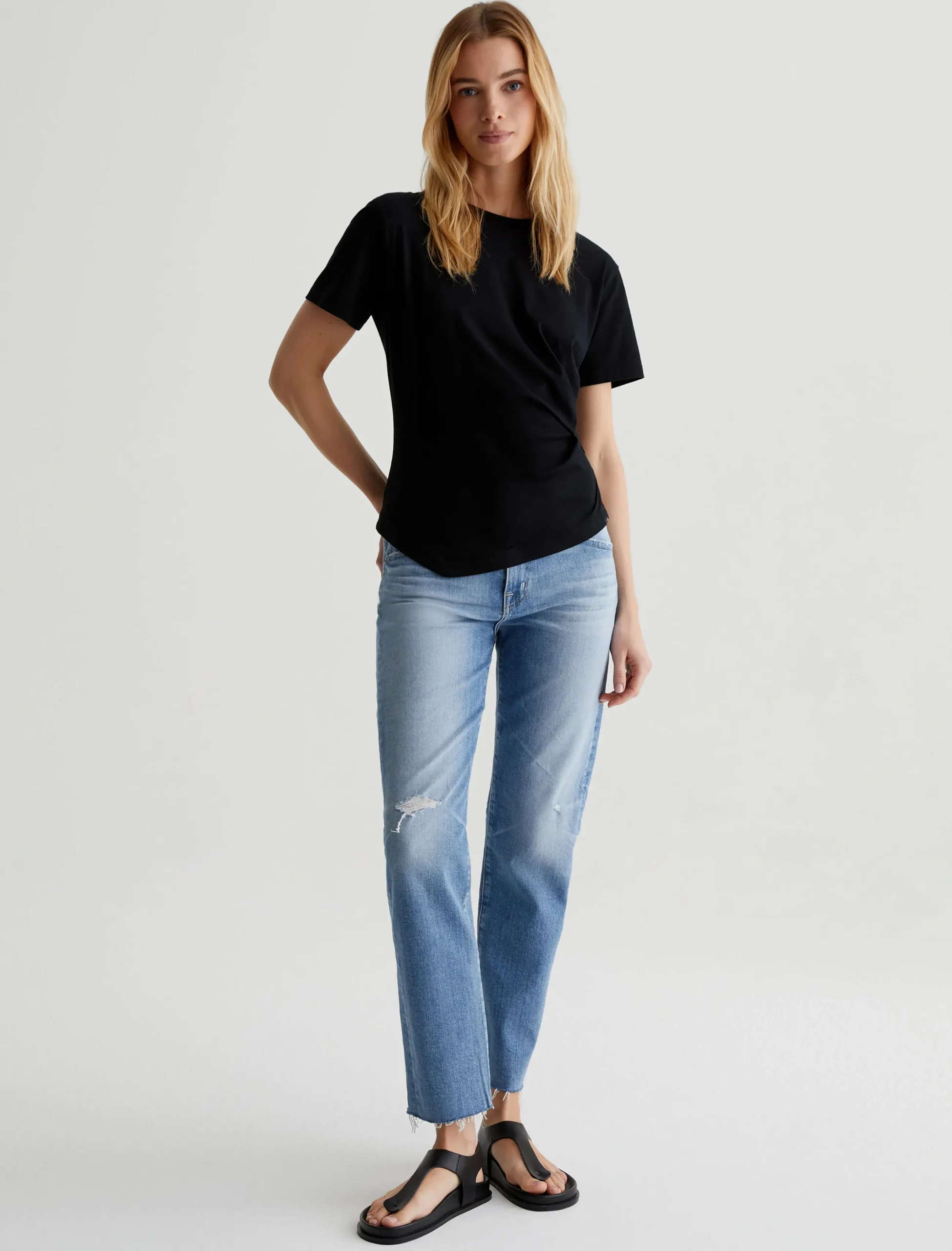 A simple yet elegant take on the classic crewneck T-shirt. Our Rini Top features draped asymmetric styling with side pleats and an uneven hem. Made from black stretch-blend jersey, this short-sleeve tee has a soft, luxurious feel that elevates your casual ensembles.