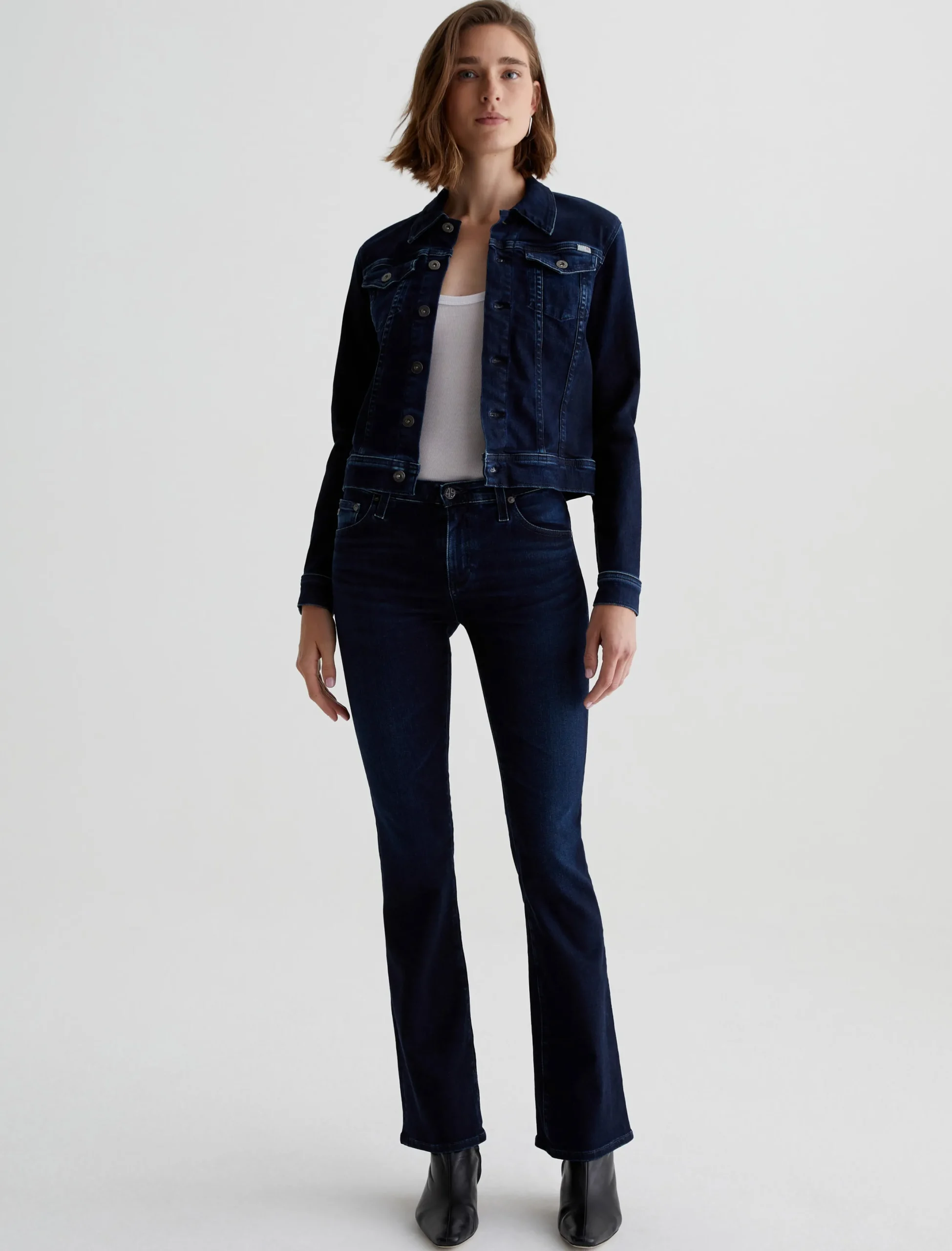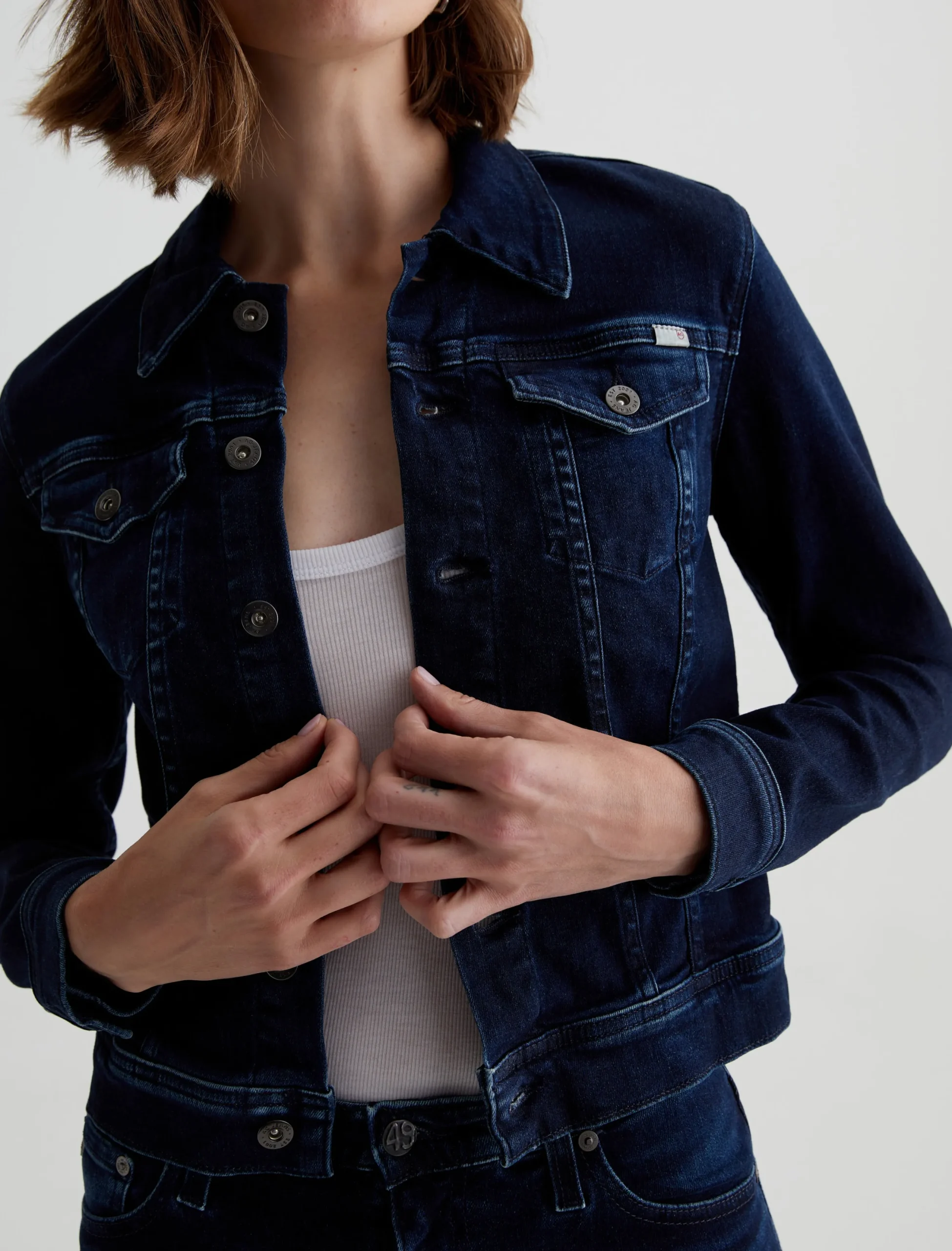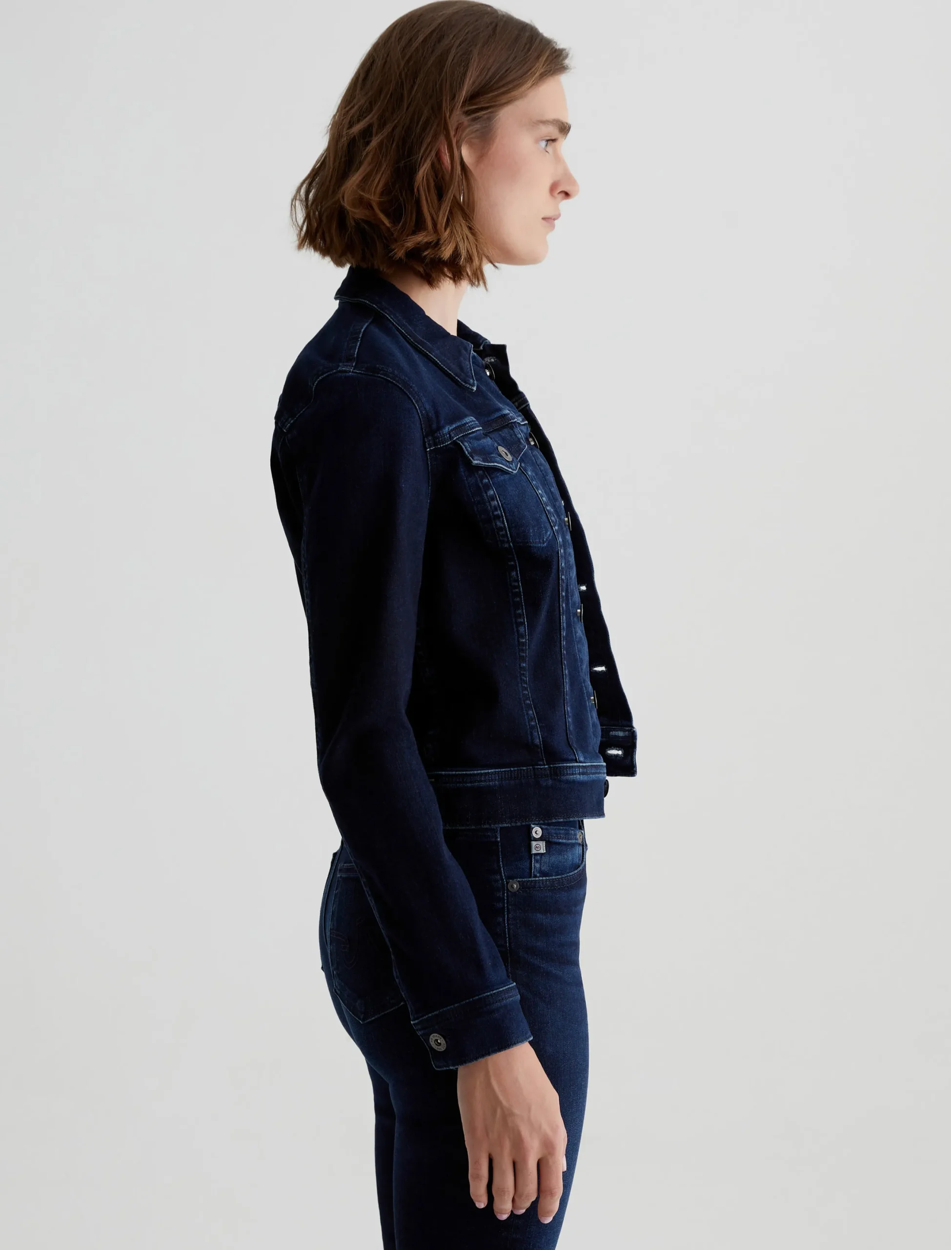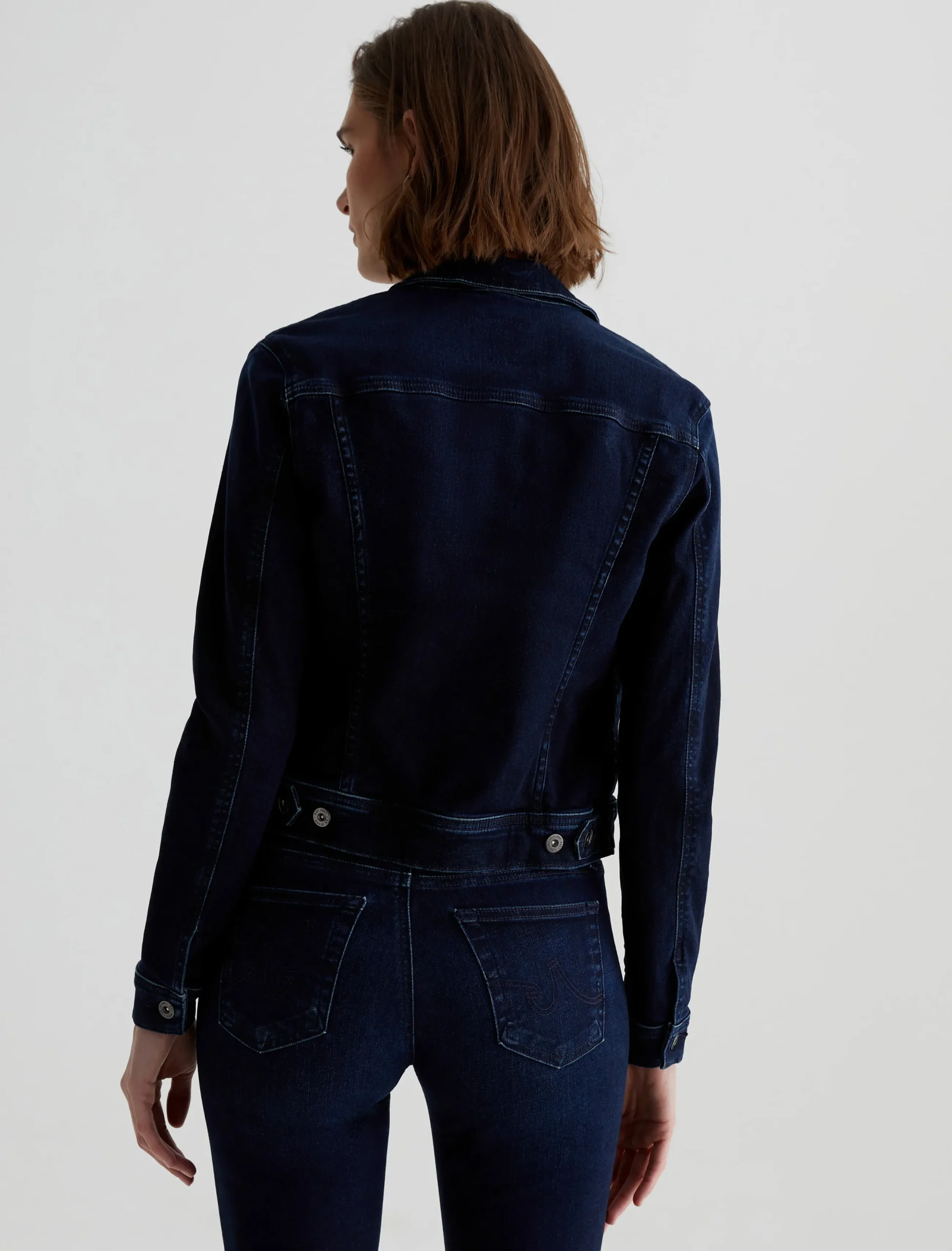 A slim take on the classic denim trucker, our Robyn Jacket features an AG-ed™ dark indigo wash with fading at the seams and edges. This women’s jean jacket fits close in 10 oz. Empower Denim—a high-stretch, high-resilience denim from Japan.