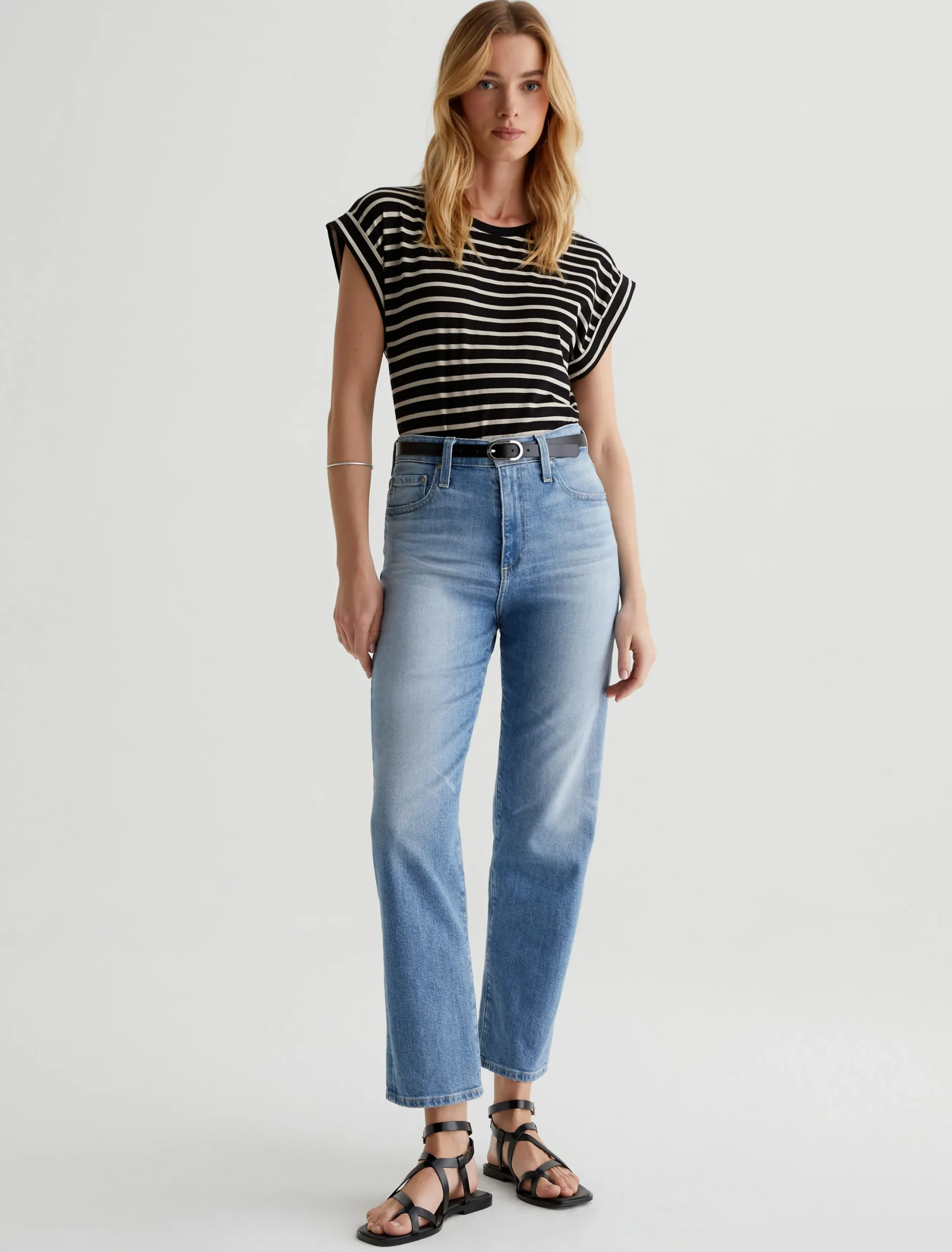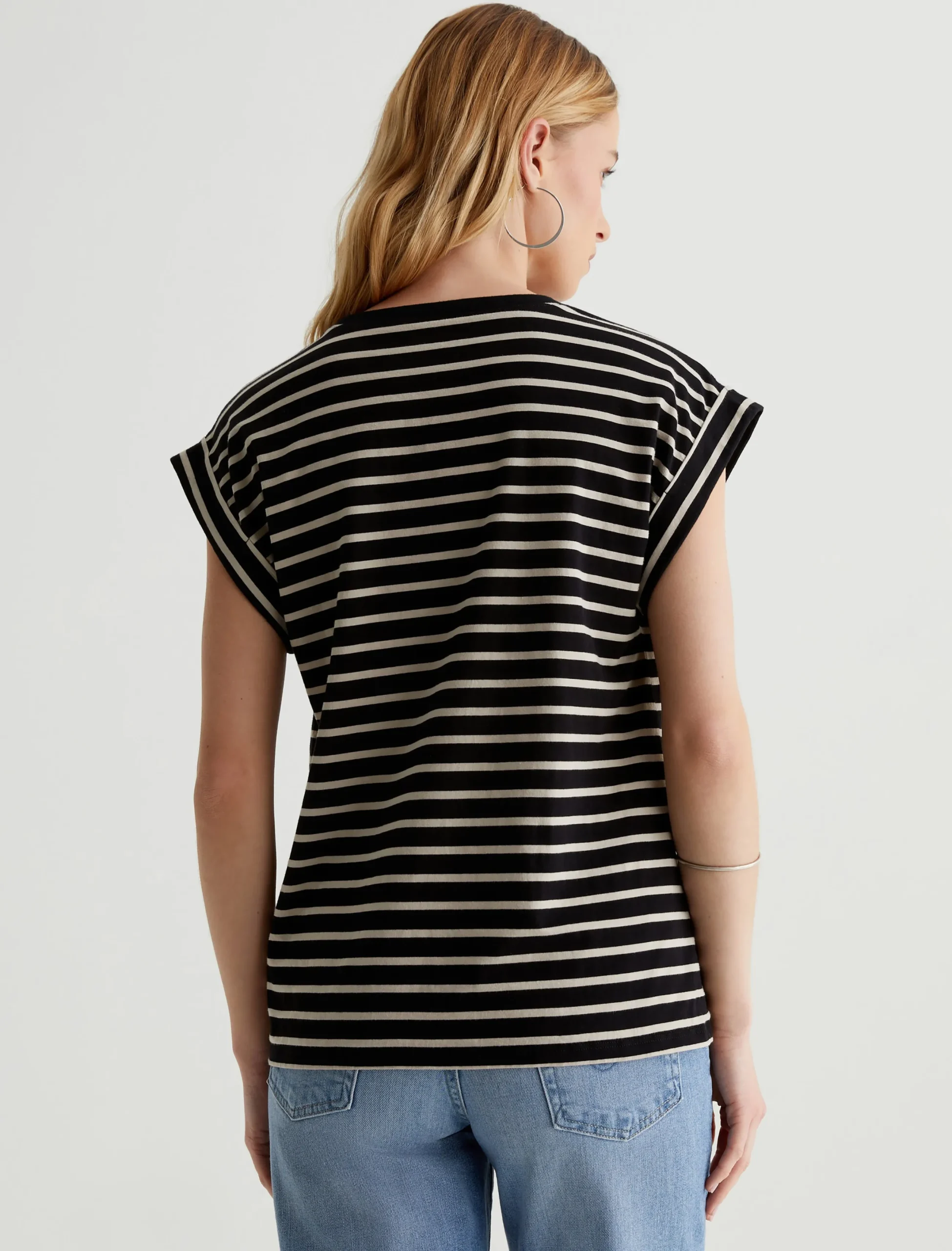 Our Rowan T-shirt has a relaxed, roomy fit defined by a crew neckline and short, rolled-up sleeves. Crafted from comfortable stretch-blend jersey, it’s done here in black with beige stripes.