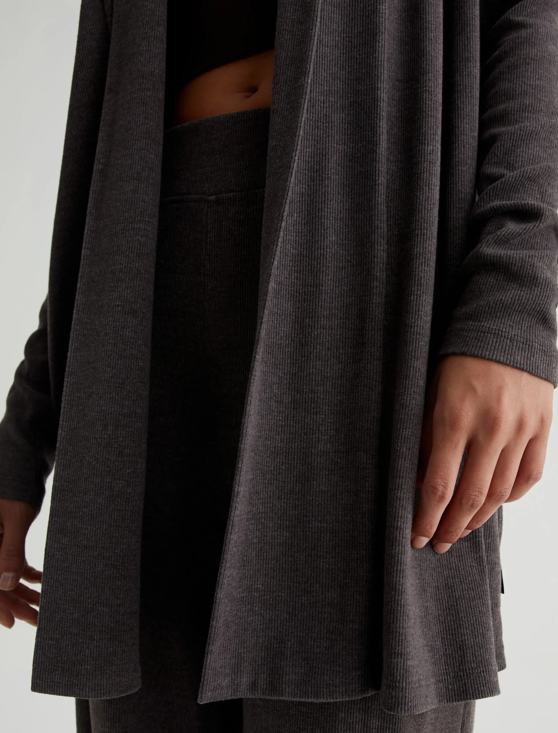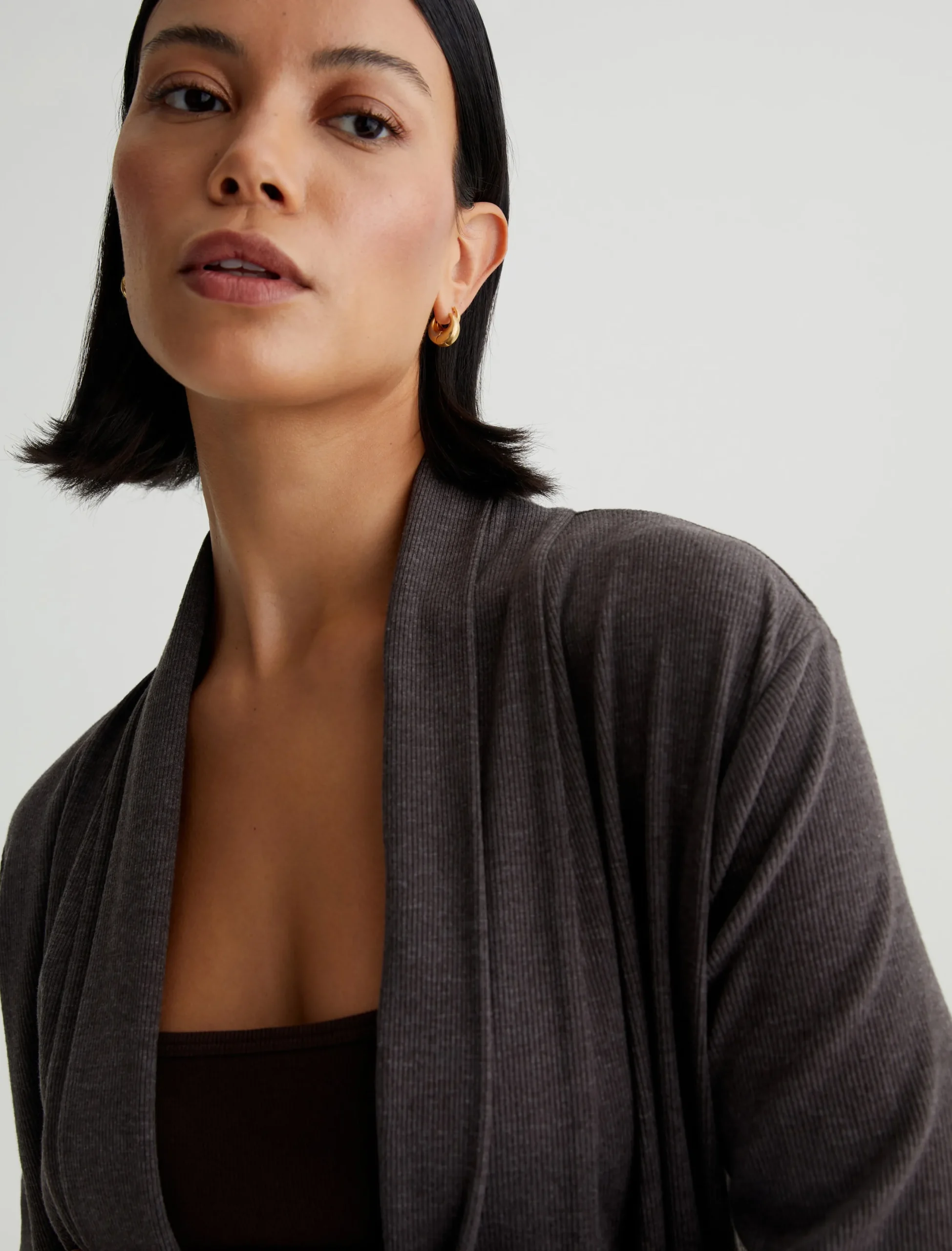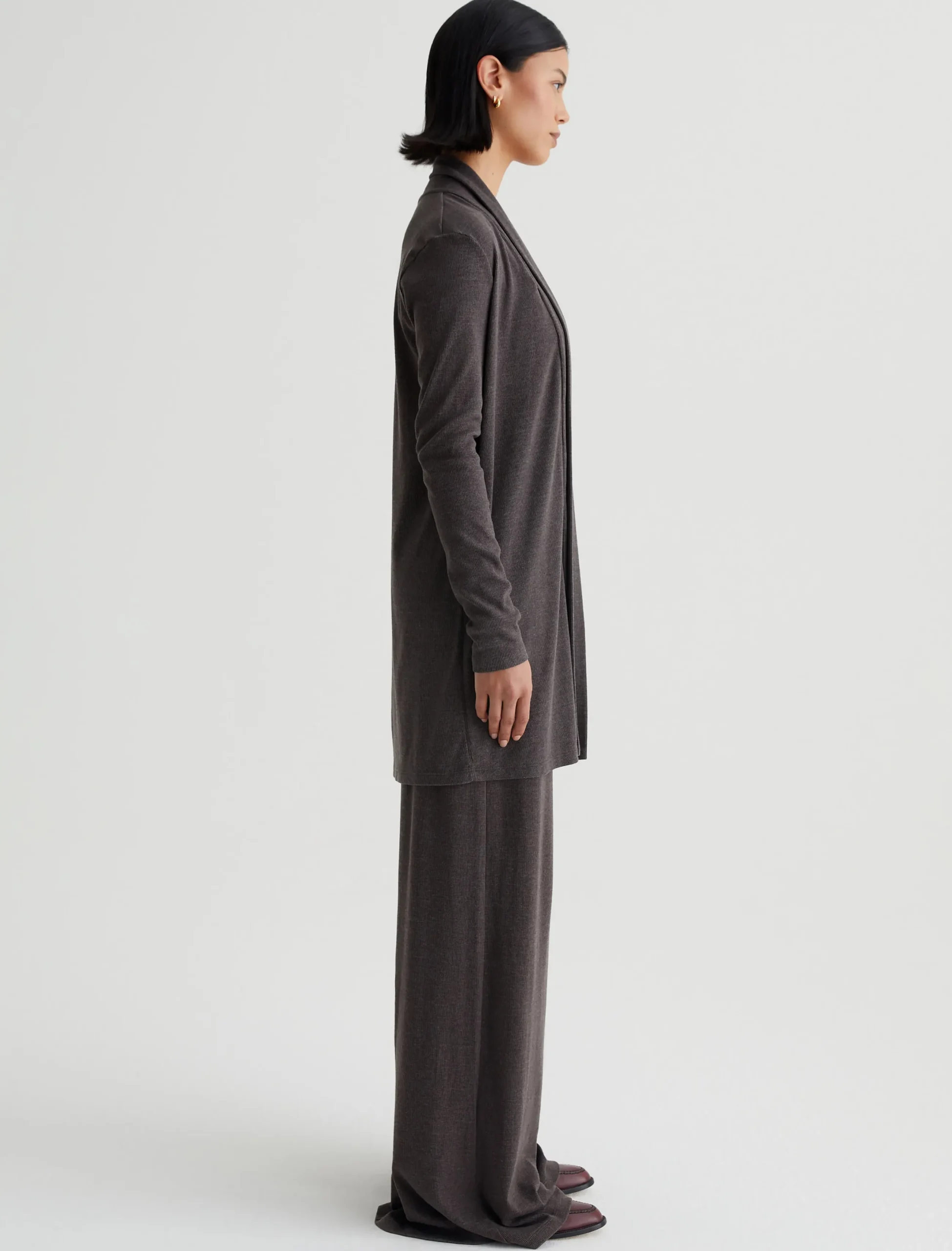 The Saamie Cardigan has a classic cozy fit with long sleeves and an open front placket. Crafted from a comfortable mélange rib knit in Stone Brown, it’s a lounge-ready layer that pairs with our Ever Tank and Sourie pants to create a chic set for your days off.