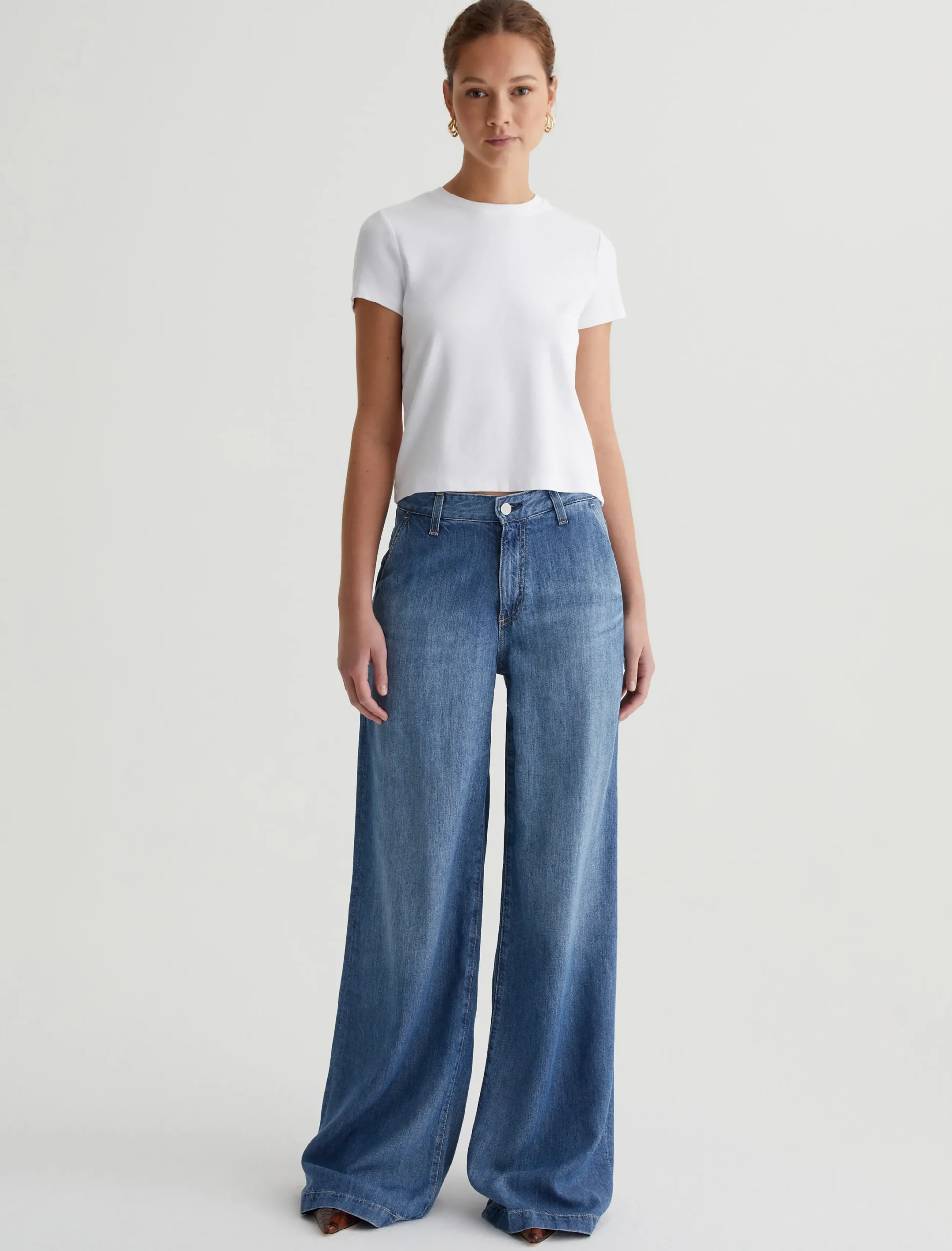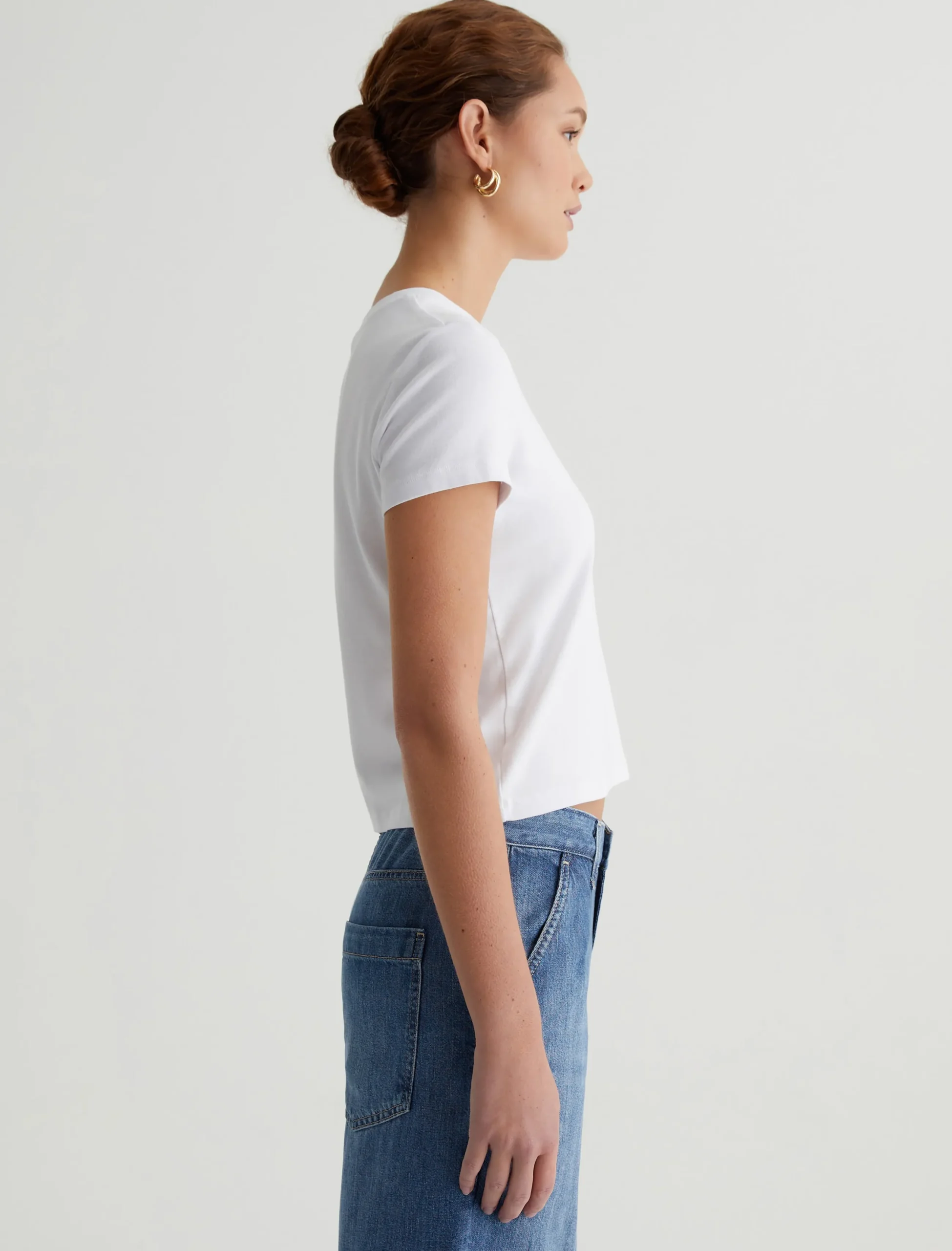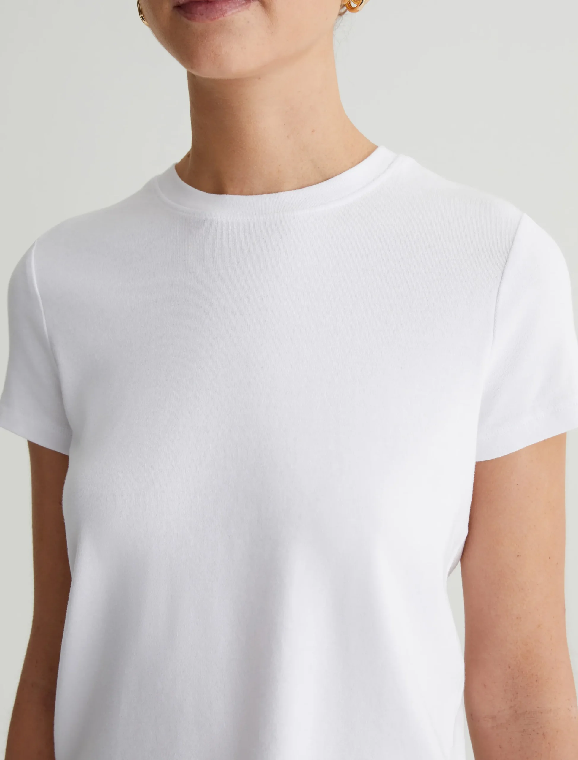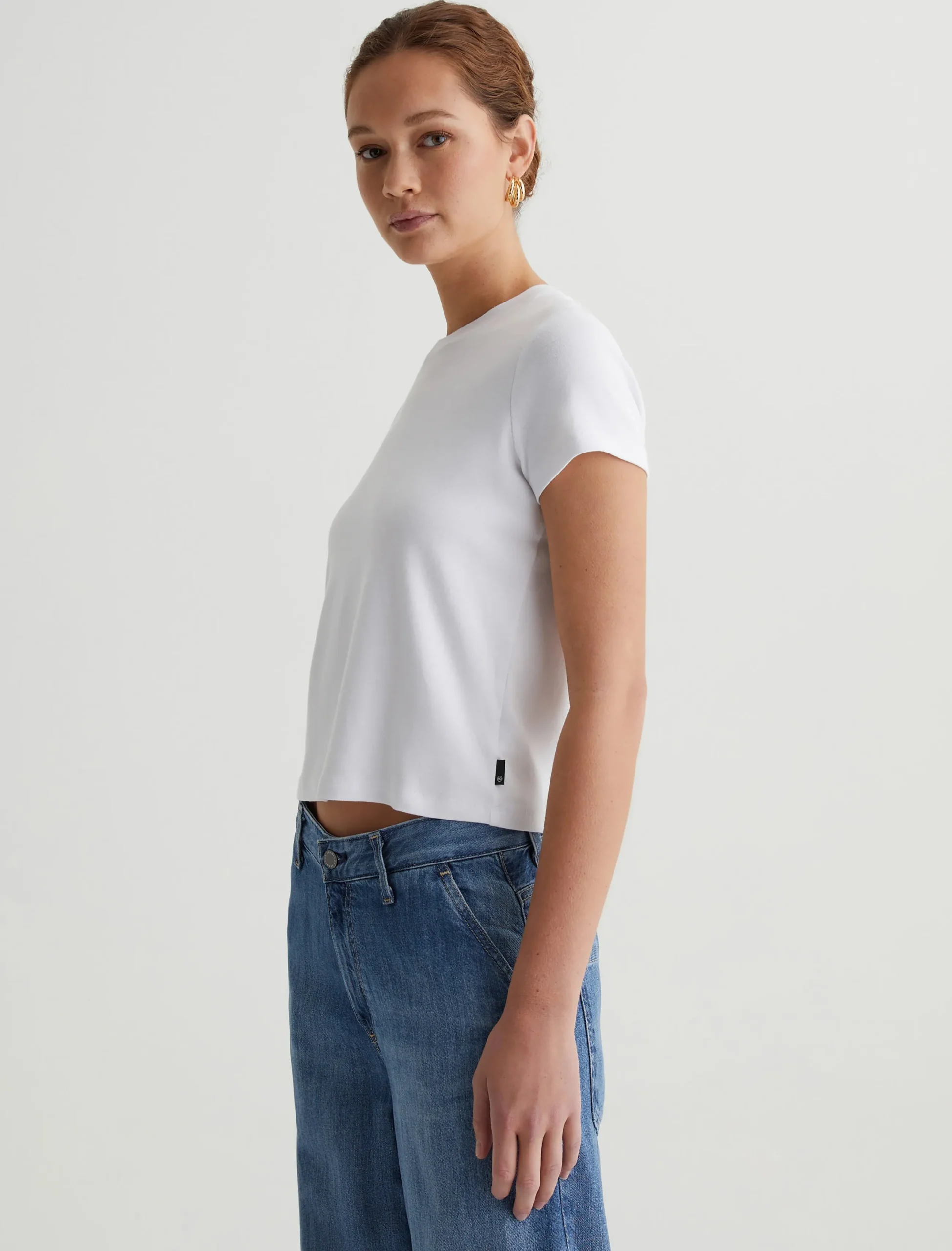 Our Sadie Crew is a cropped crewneck tee with a shrunken, ’90s-esque vintage silhouette. The short-sleeve style is crafted from a cotton-blend baby rib knit in a true white color. An effortless addition to your everyday lineup.