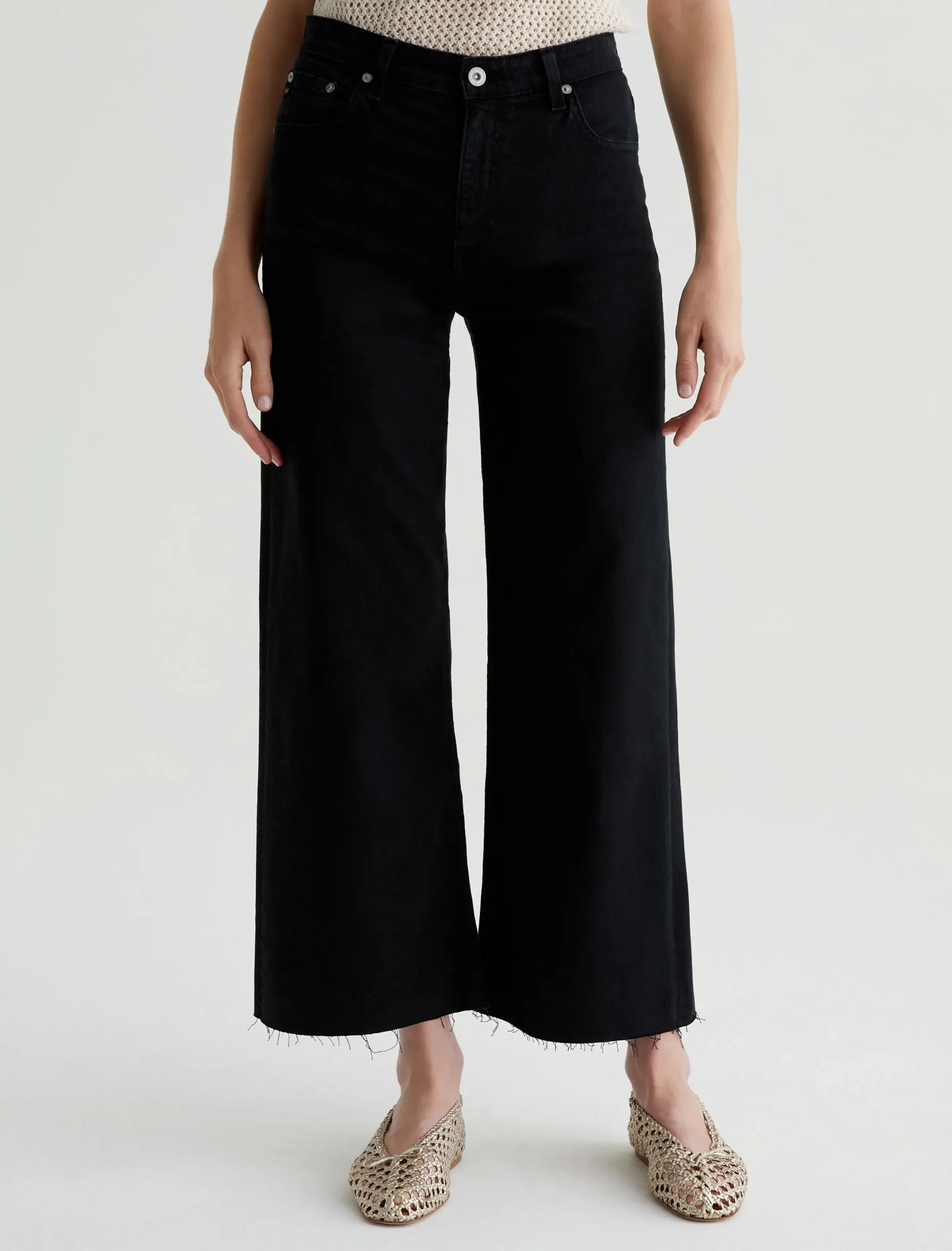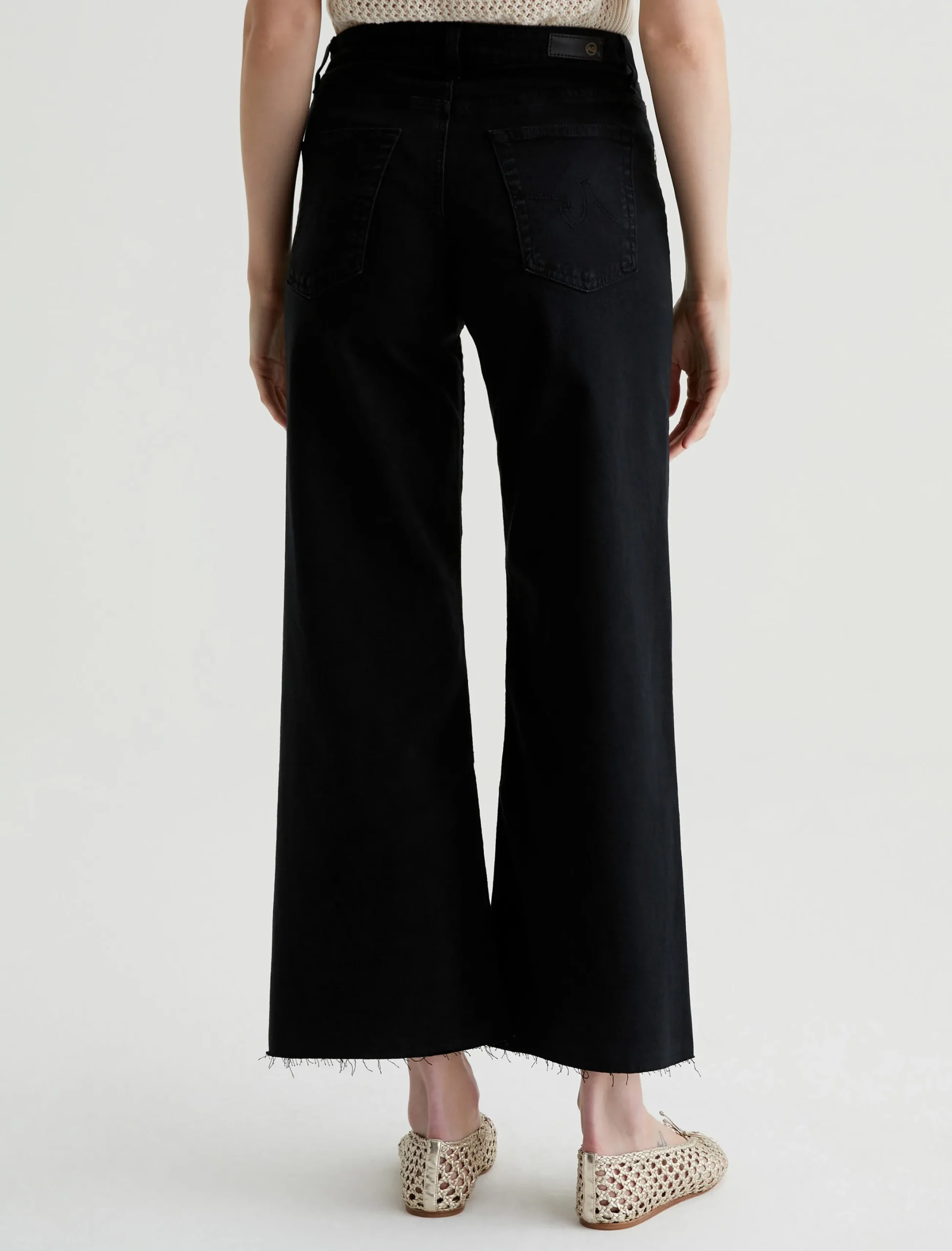 The Saige Wide Leg Crop is a black mid-rise jean with loose, cropped legs and raw hems. Sulfur-dyed for a slightly faded look, these women’s wide-leg jeans come in our 8.7 oz. Hyper Soft Bull Denim featuring dual-elastic for supreme comfort and advanced recovery. AG Cloud Soft Denim™ fabrics feature special left-hand twill construction that allows the yarns to gently relax and untwist for a luxe, supple feel. It’s designed to get even softer the more you wear it.
