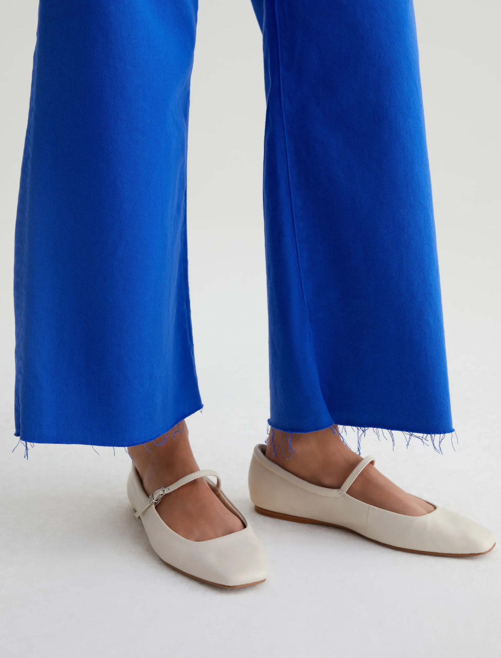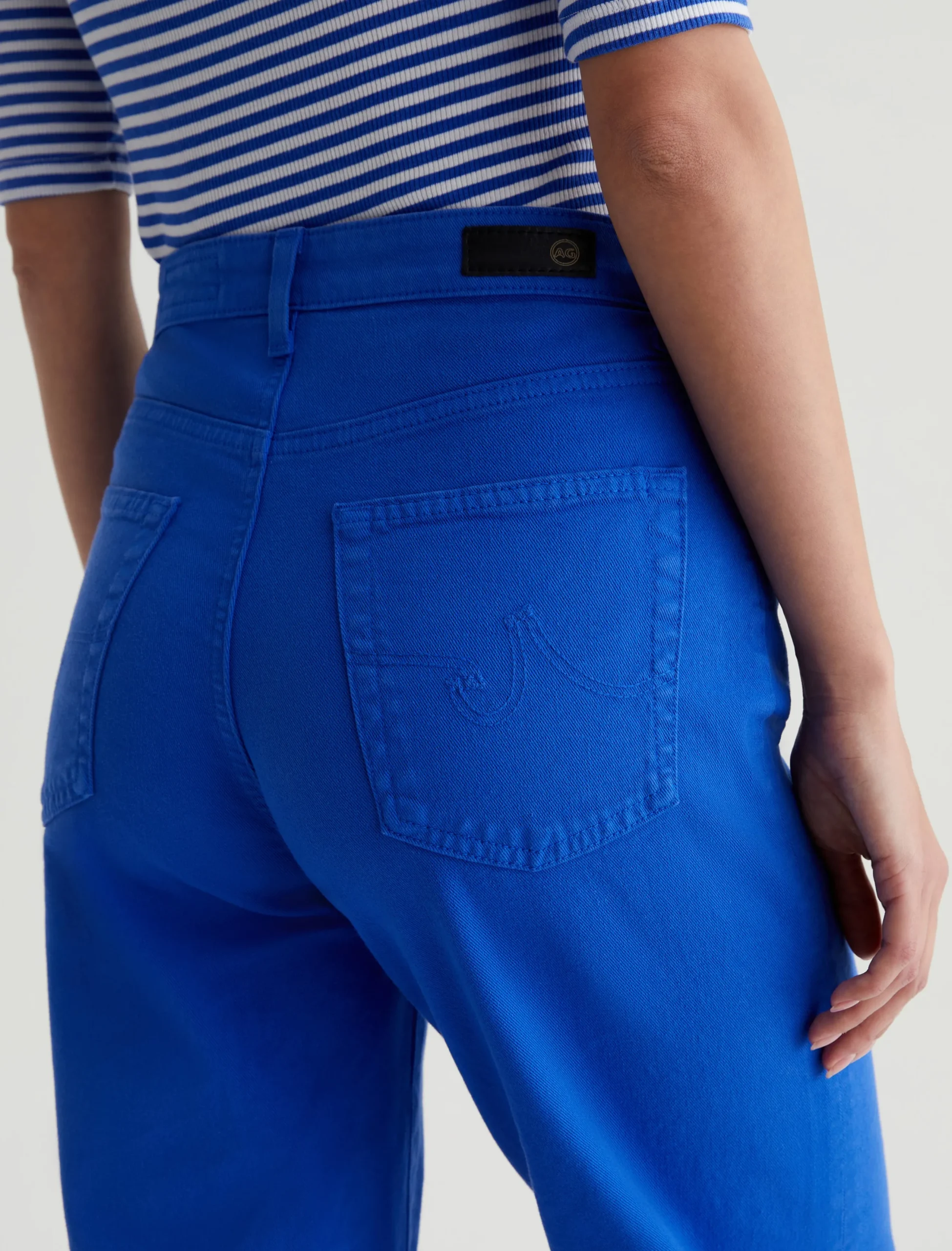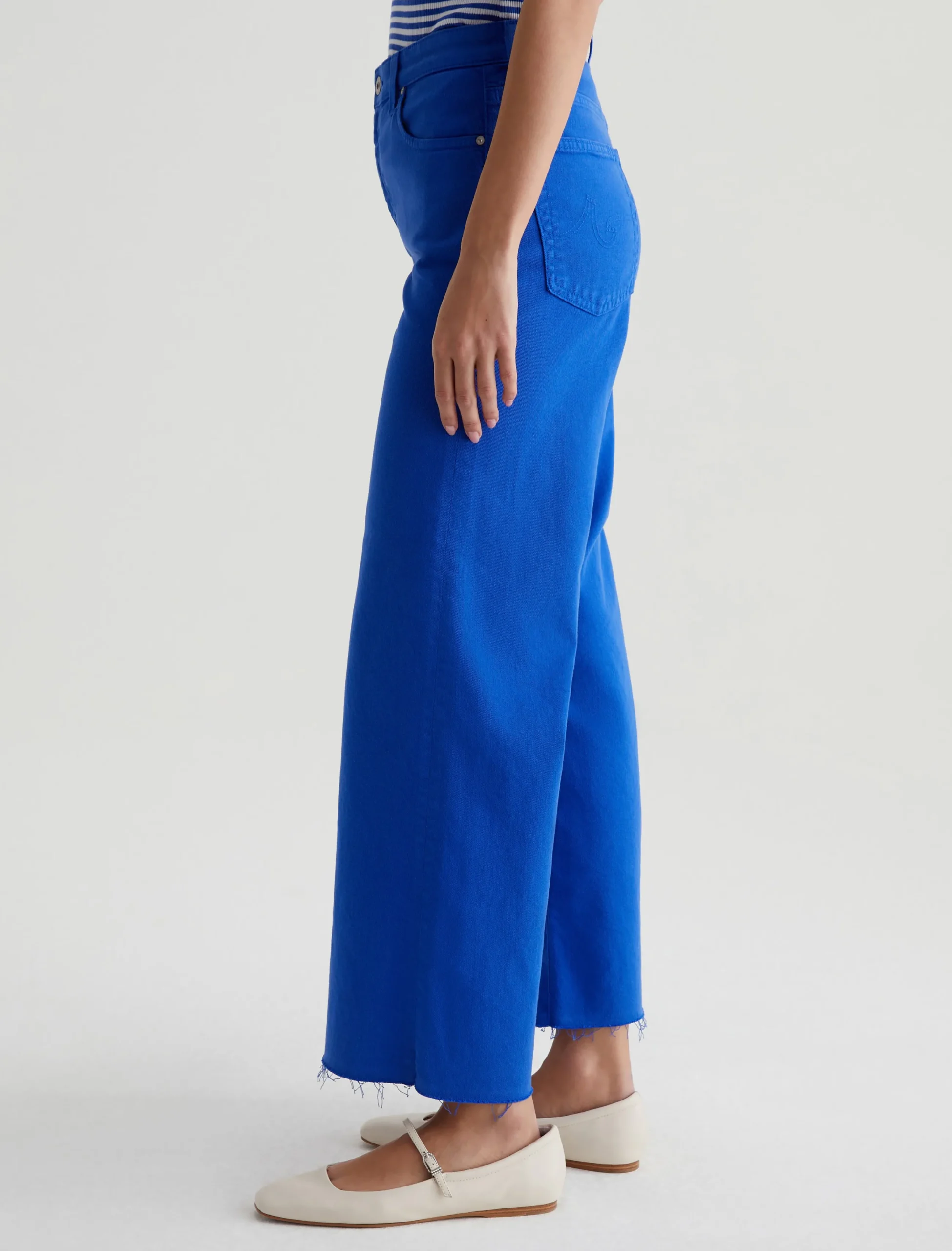 The Saige Wide Leg Crop in Mediterranean-inspired blue adds the perfect pop of color to your look. These five-pocket jeans for women have a mid-rise waist and loose, cropped legs with raw hems. Made from our exclusive AG Cloud Soft Denim™, this pair comes in 8.7 oz. Hyper Soft Bull Denim featuring AG’s special left-hand twill fabric that allows the yarns to gently relax and untwist for a supple, velvety feel. It’s designed to get even softer the more you wear it. Dual-elastic stretch offers extra comfort and a resilient shape.